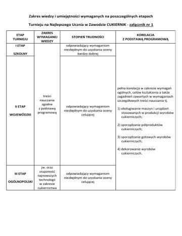 Zakres wiedzy i umiejętności wymaganych na poszczególnych etapach Turnieju na Najlepszego Ucznia w Zawodzie CUKIERNIK - załącznik nr 1 ETAP TURNIEJU ZAKRES WYMAGANEJ WIEDZY SZKOLNY WOJEWÓDZKI KORELACJA Z PODSTAWĄ PROGRAMOWĄ odpowiadający wymaganiom niezbędnym do uzyskania oceny bardzo dobrej I ETAP II ETAP STOPIEŃ TRUDNOŚCI treści nauczania zgodne z podstawą programową pełna korelacja w zakresie wymagań ogólnych, celów kształcenia a także zagadnień zawartych w wymaganiach szczegółowych treści nauczania tj. odpowiadający wymaganiom niezbędnym do uzyskania oceny celującej 1) obsługiwanie maszyn i urządzeń stosowanych w produkcji wyrobów cukierniczych; 2) sporządzanie półproduktów cukierniczych; 3) sporządzanie gotowych wyrobów cukierniczych; 4) dekorowanie wyrobów cukierniczych. III ETAP OGÓLNOPOLSKI jw. oraz znajomość najnowszych technologii w zakresie cukiernictwa odpowiadający wymaganiom niezbędnym do uzyskania oceny celującej