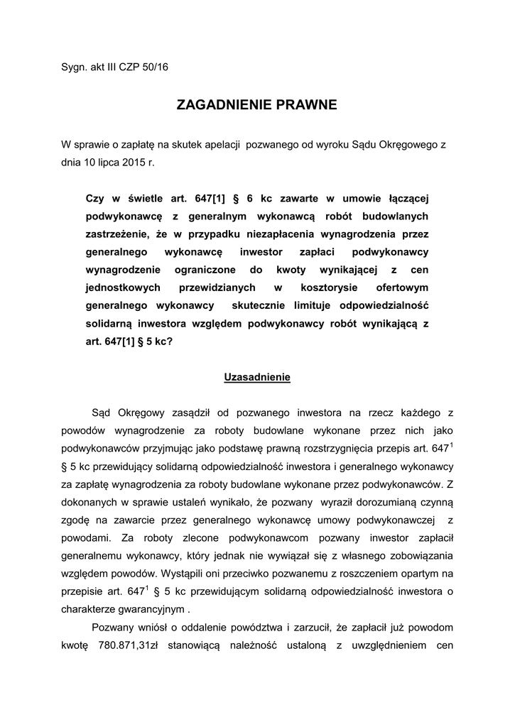 Sygn. akt III CZP 50/16 ZAGADNIENIE PRAWNE W sprawie o zapłatę na skutek apelacji pozwanego od wyroku Sądu Okręgowego z dnia 10 lipca 2015 r. Czy w świetle art. 647[1] § 6 kc zawarte w umowie łączącej podwykonawcę z generalnym wykonawcą robót budowlanych zastrzeżenie, że w przypadku niezapłacenia wynagrodzenia przez generalnego wykonawcę wynagrodzenie jednostkowych inwestor ograniczone do przewidzianych generalnego wykonawcy zapłaci kwoty w podwykonawcy wynikającej kosztorysie z cen ofertowym skutecznie limituje odpowiedzialność solidarną inwestora względem podwykonawcy robót wynikającą z art. 647[1] § 5 kc? Uzasadnienie Sąd Okręgowy zasądził od pozwanego inwestora na rzecz każdego z powodów wynagrodzenie za roboty budowlane wykonane przez nich jako podwykonawców przyjmując jako podstawę prawną rozstrzygnięcia przepis art. 647 1 § 5 kc przewidujący solidarną odpowiedzialność inwestora i generalnego wykonawcy za zapłatę wynagrodzenia za roboty budowlane wykonane przez podwykonawców. Z dokonanych w sprawie ustaleń wynikało, że pozwany wyraził dorozumianą czynną zgodę na zawarcie przez generalnego wykonawcę umowy podwykonawczej powodami. Za roboty zlecone podwykonawcom z pozwany inwestor zapłacił generalnemu wykonawcy, który jednak nie wywiązał się z własnego zobowiązania względem powodów. Wystąpili oni przeciwko pozwanemu z roszczeniem opartym na przepisie art. 6471 § 5 kc przewidującym solidarną odpowiedzialność inwestora o charakterze gwarancyjnym . Pozwany wniósł o oddalenie powództwa i zarzucił, że zapłacił już powodom kwotę 780.871,31zł stanowiącą należność ustaloną z uwzględnieniem cen 2 jednostkowych przyjętych w umowie zawartej pomiędzy nim , a generalnym wykonawcą i w ten sposób wykonał swoje zobowiązanie gwarancyjne w sytuacji, gdy jego odpowiedzialność została ograniczona na mocy § 6 ust 12 umowy podwykonawczej przewidującego, że w przypadku niezapłacenia podwykonawcom przez generalnego wykonawcę wynagrodzenia za wykonane roboty inwestor zapłaci im wynagrodzenie w wysokości nie wyższej niż kwota ustalona według cen jednostkowych zawartych w kosztorysie ofertowym generalnego wykonawcy, a więc do wysokości wynikającej z umowy głównej. Zamieszczenie takiego zastrzeżenia inwestor i wykonawca przewidzieli w umowie głównej w subklauzuli 4.4. w zapisie oznaczanym jako b) (k. 17/2). Generalny wykonawca przed zaakceptowaniem podwykonawców przez pozwanego przedłożył mu niekompletny, bo niezawierający określenia wynagrodzenia ani stawek jednostkowych za poszczególne roboty, projekt umowy podwykonawczej powołując się na tajemnice handlową. Inwestor uznał, że jego interes dostatecznie zabezpiecza określenie w umowie podwykonawczej pułapu wynagrodzenia podwykonawców jako nie wyższego niż wynikające z umowy głównej. O cenach jednostkowych ustalonych w umowie podwykonawczej pozwany inwestor dowiedział się dopiero wówczas, gdy podwykonawcy zgłosili swoje roszczenia wobec niego. Jak wskazał Sąd Najwyższy w uchwale z dnia 17 lutego 2016r. sygn. III CZP 108/15 skuteczność wyrażonej w sposób dorozumiany (art. 60 kc) zgody inwestora na zawarcie przez wykonawcę umowy o roboty budowlane z podwykonawcą jest uzależniona od zapewnienia mu możliwości zapoznania się z postanowieniami tej umowy, które wyznaczają zakres jego odpowiedzialności przewidzianej w art. 647 1 § 5 kc. Jednak w uwarunkowaniach niniejszej sprawy inwestor uznał co do zasady swoją odpowiedzialność solidarną wobec podwykonawców czemu dał wyraz zaspokajając częściowo ich żądanie zapłaty . W toku postępowania pierwszoinstancyjnego pozwany nie kwestionował ostatecznie ilości i jakości robót wykonanych przez powodów. Zakres tych robót obejmował wykonanie wyłącznie robót budowlanych związanych z przebudową sieci niskiego i średniego napięcia, podczas, gdy kwota 8.288.495,21zł wynikająca z oferty generalnego wykonawcy stanowiła wynagrodzenie za wykonanie wszystkich prac elektrycznych obejmujących także przebudowę sieci wysokiego napięcia, której nie zlecono powodom. Stąd też po wykonaniu prac podwykonawcy wystawili faktury na 3 łączną kwotę 1.165.366,64zł, a inwestor wypłacił na ich rzecz wynagrodzenie w wysokości 780.871,31zł. U podstaw rozstrzygnięcia Sądu Okręgowego znalazło się zapatrywanie, że zakres odpowiedzialności inwestora opartej na regulacji z art. 6471 § 5 kc jest wyznaczany przez rozmiar zobowiązania wykonawcy, gdyż przepis ten nie ogranicza tej odpowiedzialności do wysokości zobowiązania inwestora wobec wykonawcy za tę część robót, która została zlecona podwykonawcy. Sąd ten przyjmował, że istotą odpowiedzialności gwarancyjnej jest to, że obejmuje ona dług innej osoby i ten dług determinuje zakres odpowiedzialności gwaranta, a zatem w przypadku niezapłacenia wynagrodzenia zatwierdzonemu podwykonawcy za wykonane roboty, inwestor ma obowiązek zapłacić kwotę wynagrodzenia wynikającą z umowy podwykonawczej. W ocenie tego Sądu słuszny był zarzut powodów wskazujący na niezgodność powołanej w umowie głównej , a następnie w § 6 ust 12 umowy podwykonawczej klauzuli ograniczającej odpowiedzialność inwestora , gdyż klauzula taka jest sprzeczna z treścią bezwzględnie obowiązującej regulacji (art. 647 1 § 6 kc), a tym samym nieważna stosownie do dyspozycji art. 58 § 1 kc. W piśmiennictwie i orzecznictwie sądów powszechnych nie są jednak odosobnione odmienne zapatrywania w kwestii dopuszczalności ograniczenia solidarnej odpowiedzialności inwestora względem podwykonawców do wysokości wynagrodzenia wynikającego z umowy łączącej inwestora z wykonawcą robót budowlanych. I tak. M. Jamka i K. Orzechowski w artykule „Zgoda inwestora na umowę generalnego wykonawcy z podwykonawcą” (Monitor Prawniczy nr 17 z 2009r.) wyrazili pogląd, że zakres odpowiedzialności inwestora wo