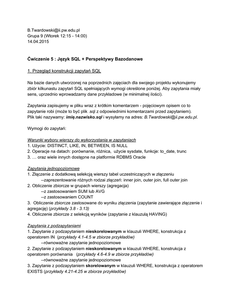 [email protected] Grupa 9 (Wtorek 12:15 14:00) 14.04.2015 Ćwiczenie 5 : Język SQL + Perspektywy Bazodanowe 1. Przegląd konstrukcji zapytań SQL Na bazie danych utworzonej na poprzednich zajęciach dla swojego projektu wykonujemy zbiór kilkunastu zapytań SQL spełniających wymogi określone poniżej. Aby zapytania miały sens, uprzednio wprowadzamy dane przykładowe (w minimalnej ilości). Zapytania zapisujemy w pliku wraz z krótkim komentarzem pojęciowym opisem co to zapytanie robi (może to być plik .sql z odpowiednimi komentarzami przed zapytaniem). Plik taki nazywamy: imię.nazwisko.sql i wysyłamy na adres: [email protected] . Wymogi do zapytań: Warunki wyboru wierszy do wykorzystania w zapytaniach 1. Użycie: DISTINCT, LIKE, IN, BETWEEN, IS NULL 2. Operacje na datach: porównanie, różnica, użycie sysdate, funkcje: to_date, trunc 3. … oraz wiele innych dostępne na platformie RDBMS Oracle Zapytania jednopoziomowe 1. Złączenie z dodatkową selekcją wierszy tabel uczestniczących w złączeniu zaprezentowanie różnych rodzai złączeń: inner join, outer join, full outer join 2. Obliczenie zbiorcze w grupach wierszy (agregacja) z zastosowaniem SUM lub AVG z zastosowaniem COUNT 3. Obliczenie zbiorcze zastosowane do wyniku złączenia (zapytanie zawierające złączenie i agregację) ( przykłady 3.8 3.13) 4. Obliczenie zbiorcze z selekcją wyników (zapytanie z klauzulą HAVING) Zapytania z podzapytaniami 1. Zapytanie z podzapytaniem nieskorelowanym w klauzuli WHERE, konstrukcja z operatorem IN ( przykłady 4.14.5 w zbiorze przykładów) równoważne zapytanie jednopoziomowe 2. Zapytanie z podzapytaniem nieskorelowanym w klauzuli WHERE, konstrukcja z operatorem porównania ( przykłady 4.64.9 w zbiorze przykładów) równoważne zapytanie jednopoziomowe 3. Zapytanie z podzapytaniem skorelowanym w klauzuli WHERE, konstrukcja z operatorem EXISTS ( przykłady 4.214.25 w zbiorze przykładów) dwa przykłady dla EXISTS, NOT EXISTS dla NOT EXISTS równoważne zapytanie jednopoziomowe 4.Dwa zapytania z podzapytaniem skorelowanym w klauzuli WHEREpodzapytanie wykonuje obliczenie zbiorcze (agregacja) , konstrukcja z operatorem porównania ( przykłady 4.104.19s w zbiorze przykładów) równoważne zapytanie jednopoziomowe (z zastosowaniem złączenia, agregacji i klauzuli HAVING) 5. Zapytanie z podzapytaniem (nieskorelowanym oczywiście) w klauzuli FROM ( przykłady 4.264.29 ) Zapytaniom nadajemy odpowiedni porządek (ORDER BY). * Zapytania wykorzystujące funkcje analityczne RDBMS Oracle pozwala na wykorzystywanie funkcji analitycznych w zapytaniach SQL. Zademonstrować użycie tych funkcji dla problemu: TopN lub budowania rankingu. Przykład: dla każdego klienta wyświetlić zamówienie o największej kwocie. Należy wykonać zapytanie z użyciem odpowiedniej funkcji analitycznej ( np. rank(), dense_rank(), row_number()) oraz odpowiadające zapytanie bez użycia funkcji analitycznej. 2. Perspektywy bazodanowe Dla jednego z złożonych zapytań z punktu 1 zaproponować utworzenie odpowiedniego widoku(perspektywy) bazodanowej (np. agregującej dane) i zaprezentować jej wykorzystanie w zapytaniu SQL. Materiały i przykłady: https://studia.elka.pw.edu.pl/priv/11Z/BD.A/SQLzbior_przykladow/SQLzbior_przykladow.zip