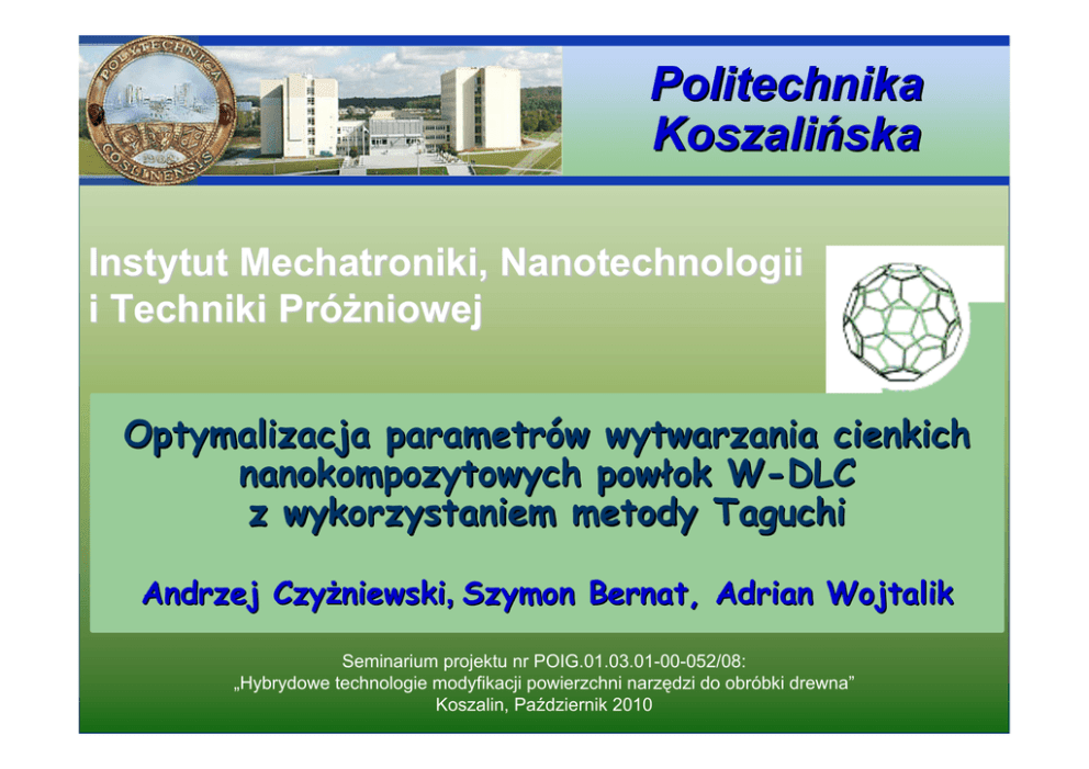 Politechnika Koszali ń ska Politechnika Koszalińska Instytut Mechatroniki, Nanotechnologii i Techniki Próżniowej Instytut Mechatroniki, Nanotechnologii i Technik Próżniowych Optymalizacja parametrów wytwarzania cienkich nanokompozytowych powłok W-DLC z wykorzystaniem metody Taguchi Andrzej Czyżniewski, Szymon Bernat, Adrian Wojtalik Seminarium projektu nr POIG.01.03.01-00-052/08: „Hybrydowe technologie modyfikacji powierzchni narzędzi do obróbki drewna” Koszalin, Październik 2010 Politechnika Koszalińska Instytut Mechatroniki, Nanotechnologii i Techniki Próżniowej Plan referatu 1. Wprowadzenie, cel badań 2. Plan eksperymentów i badań 3. Wytwarzanie i metodyka badań powłok 4. Wyniki badań i analiza 5. Podsumowanie Politechnika Koszalińska Instytut Mechatroniki, Nanotechnologii i Techniki Próżniowej Właściwości powłok determinujące parametry skrawne pokrywanych narzędzi Adhezja do podłoża Wytrzymałość - odporność na pękanie Odporność na zużycie ścierne Twardość Chropowatość Współczynnik tarcia systemu powłoka-drewno Właściwości niemechaniczne - współczynnik rozszerzalności cieplnej, przewodność cieplna oraz odporność na korozję chemiczną i elektrochemiczną. Politechnika Koszalińska PLC (a-C:H) (Polymer-Like Carbon) DC, MF, RF-PACVD, MS - bardzo niska twardość Instytut Mechatroniki, Nanotechnologii i Techniki Próżniowej ARC, FARC,PPD, PLD, MS, EV - bardzo wysoka twardość - wysoka odporność na zużycie RMS, ARC, PLD, DC-, RF-PACVD + Me DC, MF, RF-PACVD, MS, IBD - niska twardość - niski współczynnik tarcia DC-, MF-, RF-PACVD, MS, IBD - wysoka twardość - wysoka odporność na zużycie - zróżnicowany wsp. tarcia X=Ti, W, Cr, Nb, Zr, Mo, 1-45% at. Właściwości zależne od wzajemnego udziału fazy GLC (a-C:H) (Graphite-Like Carbon) DLC (a-C:H) (Diamond-Like Carbon) X-C:H, X-C X-DLC a-C, ta-C Powłoki na bazie węgla (DLC) DLC i XC X-C:H + Si, B, F X=Si, F, B 1-15% at. DC-, RF-PACVD, RMS - niski współczynnik tarcia - redukcja energii powierzchniowej - niska zwilżalność NCD (Nanocrystalline Diamond) RF-, MW- PACVD, PPD - wysoka twardość - wysoka odporność na zużycie + (Si, O) +N X-C:H Diamond HF CVD, MW-PACVD - najwyższa twardość - najwyższa odporność na zużycie CNx (C 3N4-?) RMS, PACVD,PPD, FARC, PLD - wysoka twardość - wysoka odporność na zużycie (Si + O) 1-20% at. EV, DC-, RF-PACVD, RMS - „przezroczystość” - odporność na zarysowania - redukcja promieniowania UV Politechnika Koszalińska Instytut Mechatroniki, Nanotechnologii i Techniki Próżniowej Mikrostruktura i właściwości powłok typu X-DLC Powłoki nanokrystaliczne Powłoki nanokompozytowe Nanokrystality < 20 nm Nanokrystality 10 – 1 nm < 5% DLC 10 – 95% DLC XC 10 – 20% DLC DLC Nanokompozytowy efekt umocnienia Twardość wyższa niż powłok o składzie stechiometrycznym 5 nm 5 nm 5 nm Politechnika Koszalińska Instytut Mechatroniki, Nanotechnologii i Techniki Próżniowej Wyniki badań narzędzi do obróbki drewna pokrytych powłokami typu X-DLC P. Beer, A. Czyżniewski et. al., Vacuum 53 (1999) 363366 Obróbka – wytwarzanie forniru (wood peeling process) Noże ze stali narzędziowej 60SMD8 (57-59HRC) CrN – TRS, 0,65 µm, W-C:H (W-DLC) – PRMS, 1,3 µm, 16GPa, LC3 = 40N Wzrost trwałości narzędzi 1,5 – 2,5x I. Endler et. al., DRM 8 (1999) 834-839 Obróbka – struganie Noże z węglików spiekanych (30 x 12 x 1,5 mm) TiC/a-C – PACVD, H = 3500HV, LC = 15 – 30N a-C – Laser-arc PVD, H = 5000HV ? Wzrost trwałości narzędzi - 210 – 250% Politechnika Koszalińska Instytut Mechatroniki, Nanotechnologii i Techniki Próżniowej Przesłanki wyboru powłok W-DLC Nanokompozytowa budowa powłok charakteryzuje się korzystnym skojarzeniem właściwości wytrzymałościowych i plastycznych Węgliki wolframu (WC) charakteryzują odpornością na zużycie ścierne się wysoką Osnowa DLC, która pod wpływem wysokiej temperatury ulega procesom grafityzacji i utleniania, jest źródłem substancji grafitopodobnych o niskiej wytrzymałości na ścinanie, które powstając w styku ostrza z materiałem obrabianym (drewnem) mogą powodować pożądane obniżenie sił skrawania Niska chropowatość Korzystne rezultaty wstępnych badań nad zastosowaniem do narzędzi do obróbki drewna Politechnika Koszalińska Instytut Mechatroniki, Nanotechnologii i Techniki Próżniowej Cel badań Ustalenie optymalnych wartości wybranych parametrów wytwarzania powłok W-DLC metodą impulsowego reaktywnego rozpylania magnetronowego, które zapewnią uzyskanie najkorzystniejszych ich właściwości z punktu widzenia zastosowania do pokrywania narzędzi do obróbki drewna Politechnika Koszalińska Instytut Mechatroniki, Nanotechnologii i Techniki Próżniowej Plan eksperymentów i badań Sposób optymalizacji - metoda Taguchi[1] Główne kryterium optymalizacji parametrów wytwarzania powłok: Adhezja powłoki określana obciążenie krytyczne LC3 w teście rysy Kryteria pomocnicze: Twardość powłoki (H) Stosunek twardości do modułu sprężystości (H/E) Współczynnik tarcia powłoka-drewno sosnowe (fs) [1] J. Pietraszek, Metoda Taguchi optymalizacji jakości, StatSoft Polska 1999. poprzez Politechnika Koszalińska Instytut Mechatroniki, Nanotechnologii i Techniki Próżniowej Wybrane optymalizowane parametry wytwarzania Lp. Optymalizowany parametr Wartość parametru 1 2 3 1 Natężenie przepływu acetylenu (IC2H2) [cm3/min] 16 22 28 2 Napięcie polaryzacji podłoży (UB) [V] -50 -150 -250 3 Grubość powłoki W-DLC (tW-DLC) [µm] 2,5/1,3 3,5/2,0 5/3,0 4 Grubość podwarstwy chromu (tCr) [µm] 0,3/0,1 0,6/0,2 0,9/0,3 Politechnika Koszalińska Instytut Mechatroniki, Nanotechnologii i Techniki Próżniowej Tablica eksperymentów Nr ek. Natężenie przepływu acetylenu Napięcie polaryzacji podłoży [cm3/min] 1 Grubość powłoki W-DLC Grubość podwarstwy chromu Obrót jednoosiowy Obrót planetarny Obrót jednoosiowy Obrót planeta