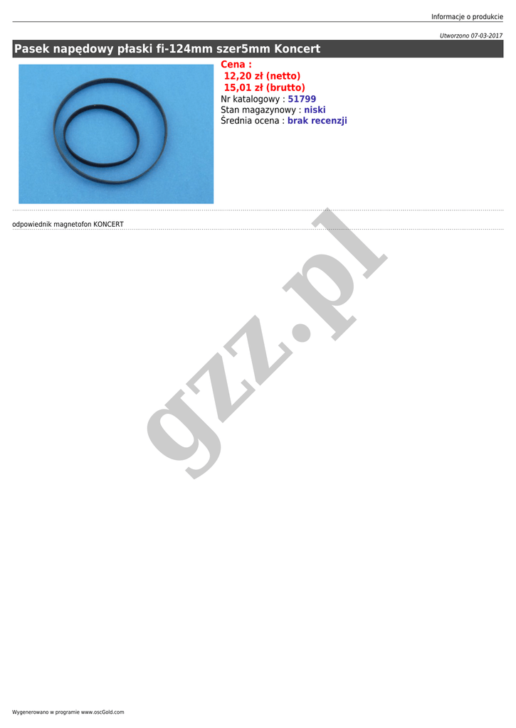 Informacje o produkcie Utworzono 07-03-2017 Pasek napędowy płaski fi-124mm szer5mm Koncert Cena : 12,20 zł (netto) 15,01 zł (brutto) Nr katalogowy : 51799 Stan magazynowy : niski Średnia ocena : brak recenzji gz z .p l odpowiednik magnetofon KONCERT Wygenerowano w programie www.oscGold.com
