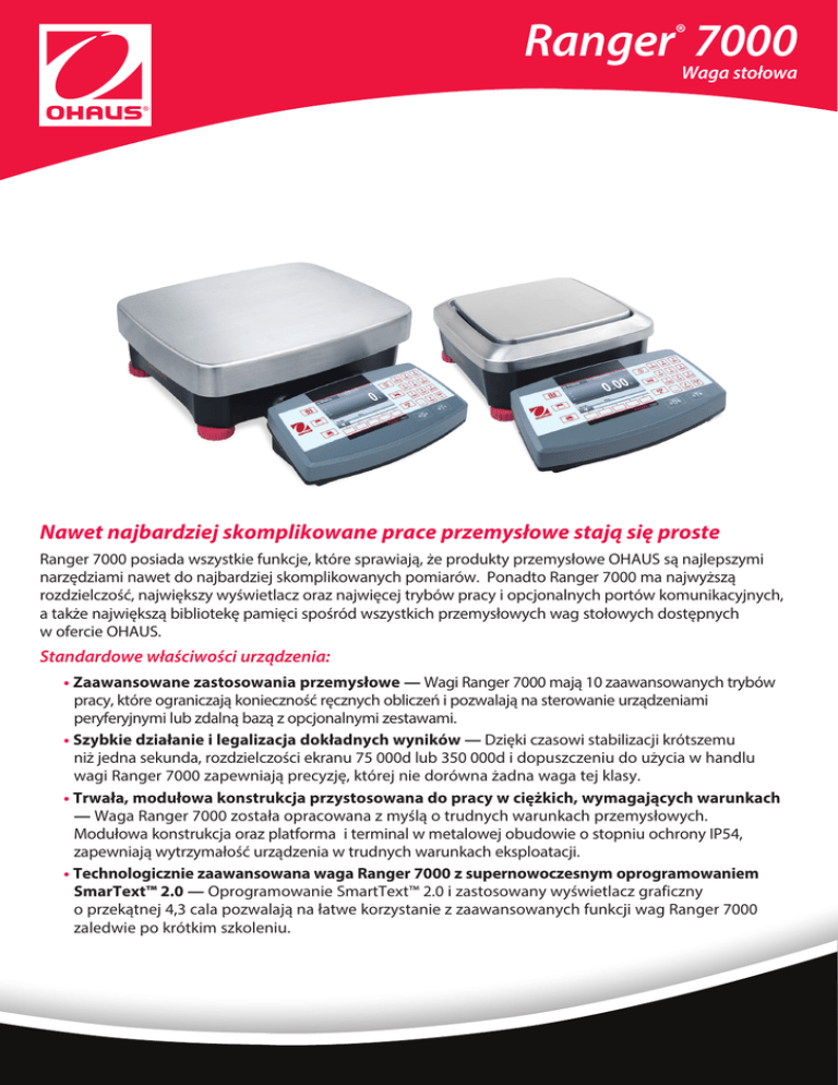 Ranger® 7000 Waga stołowa Nawet najbardziej skomplikowane prace przemysłowe stają się proste Ranger 7000 posiada wszystkie funkcje, które sprawiają, że produkty przemysłowe OHAUS są najlepszymi narzędziami nawet do najbardziej skomplikowanych pomiarów. Ponadto Ranger 7000 ma najwyższą rozdzielczość, największy wyświetlacz oraz najwięcej trybów pracy i opcjonalnych portów komunikacyjnych, a także największą bibliotekę pamięci spośród wszystkich przemysłowych wag stołowych dostępnych w ofercie OHAUS. Standardowe właściwości urządzenia: • Zaawansowane zastosowania przemysłowe — Wagi Ranger 7000 mają 10 zaawansowanych trybów pracy, które ograniczają konieczność ręcznych obliczeń i pozwalają na sterowanie urządzeniami peryferyjnymi lub zdalną bazą z opcjonalnymi zestawami. • Szybkie działanie i legalizacja dokładnych wyników — Dzięki czasowi stabilizacji krótszemu niż jedna sekunda, rozdzielczości ekranu 75 000d lub 350 000d i dopuszczeniu do użycia w handlu wagi Ranger 7000 zapewniają precyzję, której nie dorówna żadna waga tej klasy. • Trwała, modułowa konstrukcja przystosowana do pracy w ciężkich, wymagających warunkach — Waga Ranger 7000 została opracowana z myślą o trudnych warunkach przemysłowych. Modułowa konstrukcja oraz platforma i terminal w metalowej obudowie o stopniu ochrony IP54, zapewniają wytrzymałość urządzenia w trudnych warunkach eksploatacji. • Technologicznie zaawansowana waga Ranger 7000 z supernowoczesnym oprogramowaniem SmarText™ 2.0 — Oprogramowanie SmartText™ 2.0 i zastosowany wyświetlacz graficzny o przekątnej 4,3 cala pozwalają na łatwe korzystanie z zaawansowanych funkcji wag Ranger 7000 zaledwie po krótkim szkoleniu. Ranger® 7000 Waga stołowa Zaawansowane funkcje do wielu zastosowań przemysłowych Dzięki dziesięciu trybom pracy, w tym recepturowaniu i wyznaczaniu gęstości, waga Ranger 7000 spełni potrzeby w zakresie ważenia i pomiaru w praktycznie wszystkich zastosowaniach przemysłowych i procesach produkcyjnych. Waga Ranger 7000 posiada bibliotekę umożliwiającą zapamiętanie 300 wartości wyników ważenia, liczenia i dopełniania oraz 30 przepisów recepturowania. Waga umożliwia podłączenie drugiego urządzenia: platform jedno i czteroczujnikowych o większej nośności, zapewniając precyzyjne wyniki niezależnie Na zdjęciu z opcjonalną drugą wagą od wielkości ważonych przedmiotów. Wyniki ważenia na obu wagach mogą być prezentowane jednocześnie. Waga Ranger 7000 może sterować pracą wielu urządzeń peryferyjnych poprzez opcjonalny przekaźnik we/wy (2 wejścia i 4 wyjścia). Szybkie działanie i legalizacja zapewniają precyzję wyników Standardowe modele wagi Ranger 7000 mają niezwykle wysoką rozdzielczość wyświetlacza: nawet 75 000d (7500d modele z legalizacją), zaś modele o wysokiej rozdzielczości oferują rozdzielczość nawet do 350 000d (35 000d modele z legalizacją). Model R71MHD35 odznacza się wyjątkowo wysoką precyzją odczytu - do 0.1 g - aby sprostać wymaganiom nie tylko zastosowań przemysłowych, ale także warunkom testów laboratoryjnych, gdzie podstawą jest odpowiednia nośność produktu oraz precyzja odczytu. Wszystkie modele o wysokiej rozdzielczości są standardowo wyposażone w funkcję AutoCal™, która zapewnia wysoką wydajność i ułatwia okresową konserwację, codziennie automatycznie kalibrując wagę. Funkcję tę można włączyć lub wyłączyć w zależności od trybu pracy. Przy włączonej funkcji waga przeprowadza autokalibrację, kiedy rozpozna zmianę temperatury, która mogłaby wpłynąć na precyzję ważenia lub co 11 godzin. Wyniki ważenia w wagach Ranger są dostępne w ciągu jednej sekundy od umieszczenia próbki na szalce, co gwarantuje wysoką wydajność i produktywność pracy operatora. Modele Ranger 7000...M zostały zaprojektowane i skonstruowane w taki sposób, aby spełniać surowe wymagania OIML oraz dyrektywy NAWI (w sprawie nieautomatycznych urządzeń ważących), które obowiązują w warunkach określonych przepisami, np. w branży standaryzacyjnej, w sklepach jubilerskich i laboratoriach kontrolnych. Modele Ranger 7000...M zostały zaprojektowane i sprawdzone pod kątem wymaganej precyzji określonej dla klasy II i III zgodnie z dyrektywami WE i normą EN45501. Ranger® 7000 Waga stołowa Zaawansowane tryby pracy Ważenie Określanie wagi przedmiotów w wybranej jednostce miary. *Funkcji Statystyki można używać w trybie ważenia, aby porównać względne odchylenie określonej liczby próbek lub inne dane statystyczne. Ważenie dynamiczne Ważenie niestabilnego ładunku. Urządzenie określa średnią masę w przedziale czasu. *Funkcja Wstrzymaj wyświetlacz powoduje automatyczne wstrzymanie ostatniej stabilnej wartości na wyświetlaczu (funkcja zostanie aktywowana po ustawieniu interwału ważenia dynamicznego na zero). Pomiar gęstości Recepturowanie Dopełnianie Ważenie kontrolne / Liczenie Ważenie różnicowe Ważenie procentowe Oznaczanie gęstości ciał stałych. Dzięki hakowi do ważenia pod stołem można oznaczać gęstość przedmiotów, których umieszczenie na szalce sprawiłoby trudność. Dopełnienie pojemnika do docelowej wagi. Pasek postępu określa stan dopełniania. Możliwość podłączenia przekaźników sterujących we/wy z opcjonalnym zestawem do automatycznego dopełniania. Obliczanie różnicy pomiędzy obecną a początkową masą próbki. Na potrzeby mieszania i realizacji receptur. Dostępny tryb kompensacji, który umożliwia ponowne przeliczenie, w przypadku gdy dodany składnik nie mieści się w granicach tolerancji. Porównanie masy próbki / ilości sztuk z limitami docelowymi. Możliwość połączenia z sygnalizatorem świetlnym poprzez opcjonaly przekaźnik we/wy. Pomiar wagi próbki jako procentowej części uprzednio określonej wagi wzorcowej. Liczenie części Liczenie próbek o jednakowej wadze. Zaaw