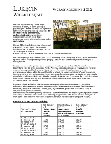 ŁUKĘCIN WCZASY RODZINNE 2012 WIELKI BŁĘKIT Ośrodek Wypoczynkowy "Wielki Błękit" idyllicznie położony, w sercu jednego z piękniejszych i dzikich zakątków na Wybrzeżu Bałtyckim. Obiekt znajduje się niespełna 150 m od szerokiej, piaszczystej, nadmorskiej plaży, w niewielkiej miejscowości Łukęcin, która dzięki panującemu tu mikroklimatowi posiada status uzdrowiska. Oferuje 310 miejsc hotelowych w słonecznych pokojach 2, 3-osobowych z łazienkami i balkonami, jak i w rodzinnych studio 2+1 lub 2+2 oraz apartamentach. Posiada również pokoje z udogodnieniami dla osób niepełnosprawnych. Ośrodek dysponuje Salą Konferencyjną oraz przestronną, komfortową Salą Jadalną, gdzie serwowane są dania kuchni polskiej oraz regionalne specjały. Zarówno Sala Jadalniana jak i Konferencyjna są klimatyzowane. Ośrodek oferuje swoim gościom teren rekreacyjny: boiska sportowe do siatkówki, koszykówki i badmintona, kort do tenisa ziemnego, Nordic Walking, plac zabaw dla dzieci, wypożyczalnię rowerów oraz gry towarzyskie: bilard, snooker i tenis stołowy. Na terenie Ośrodka zostało również przygotowane miejsce, gdzie dla gości Ośrodka w "chacie na balach pod strzechą" organizowane są kolacje w plenerze przy grillu, ognisku i muzyce. Można również odwiedzić Kawiarnię, czy skorzystać z usług Gabinetu Masażu. Na terenie Ośrodka znajduje się Wakacyjne Przedszkole dla dzieci, stanowisko internetowe, hotspot oraz parking dozorowany dla samochodów gości, przechowalnia sprzętu sportowego gości oraz pralnia. Bogata w zabytki architektury i kultury oraz walory przyrodnicze okolica oferuje bogatą paletę możliwości spędzania czasu, zgodnie z indywidualnymi potrzebami naszych gości: kąpiele morskie i słoneczne, przejażdżki rowerowe i konne , golf, rejsy statkiem, przejażdżki malowniczą trasą w zabytkowej kolejce wąskotorowej. Dla melomanów muzyki organowej i chóralnej - polecamy koncerty we wspaniałych wnętrzach Katedry romańskiej w Kamieniu Pomorskim, które odbywają się przez całe lato. Można również skorzystać z ofert jedno i kilkudniowych wycieczek zorganizowanych po najciekawszych zakątkach regionu. Cennik w zł. od osoby za dobę: Turnusy 7 dniowe sobota-sobota: 02.06.-07.07.2012 I nocleg + VP II nocleg + HP 07.07.-18.08.2012 I nocleg + VP II nocleg + HP 18.08.-01.09.2012 I nocleg + VP II nocleg + HP Blok Hotelowy nr 2 - Pokój stand. - Studio stand. z TV Sat Blok Hotelowy nr 3*** Apartament trzypokojowy dla 4 osób (cena za 4 osoby) Blok Hotelowy nr 3 * * * Pokój Wysoki standard 115,00 100,00 560,00 500,00 130,00 115,00 137,00 122,00 688,00 628,00 162,00 147,00 117,00 102,00 568,00 508,00 132,00 117,00 CENA OBEJMUJE: nocleg, wyżywienie zgodnie z opisem HP lub VP, boiska do: siatkówki, koszykówki, badmintona wraz ze sprzętem, Nordic Walking, gry towarzyskie: tenis stołowy, boule, turnball, Ball is Back, poranna gimnastyka Tai Chi (m-ce lipiec + sierpień), rodzinne zawody sportowe dla osób dorosłych i dzieci (m-ce lipiec + sierpień, 1 x w tygodniu), Nordic Walking z instruktorem (m-ce lipiec + sierpień, 1 x w tygodniu), Siłownia, plac zabaw dla dzieci, Wakacyjne Przedszkole dla dzieci pow. 3 lat, dzieci młodsze z opiekunem (m-ce lipiec + sierpień, czynne codziennie), program animacyjny dla dzieci (m-ce lipiec + sierpień), dyskoteki dla dzieci i młodzieży (m-ce lipiec + sierpień, 1x w tygodniu), kolacja w plenerze przy grillu i muzyce (m-ce lipiec + sierpień, 1 x w tygodniu), HotSpot (Recepcja, Sala Jadalniana, Sala Konferencyjna), wieczorki przy muzyce w Kawiarni Ośrodka, Dzieci od 0 - 4 lat - pobyt gratisowy: wspólne spanie z rodzicami oraz bufet śniadaniowy i kolacyjny w ramach wyżywienia rodziców Dzieci od 4 - 12 lat - 15 % rabat Pokój 2-osobowy dla 1 osoby - dopłata 50 % ceny noclegu Pokój 3,4-osobowy dla 2 osób - dopłata 10 zł /osobę za 1 dobę Studio 2-pokojowe standardowe dla 2 osób - dopłata 10 zł /osobę za 1 dobę Wspólne spanie - 50 % ceny noclegu Dostawka - 70% od ceny noclegu Doba hotelowa rozpoczyna się o godz. 16.00 i kończy o godz. 10.30 Dodatkowo płatne: * Opłata klimatyczna * Lodówka (chłodziarka) – 9 zł / doba * Parking - 9 zł / doba * Wypożyczalnia rowerów * Kort do tenisa ziemnego * Gry towarzyskie: bilard, snooker * Masaże (Gabinet Masażu czynny od II połowy czerwca do końca sierpnia) * Pralnia * Ksero * Stanowisko Internetowe HP - (pakiet: Bufet śniadaniowy + Podwieczorek (deser np. ciasto lub owoce lub lody etc. + kawa / herbata oraz sok dla dzieci) + Obiadokolacja tj. 2-daniowy obiad, bufet sałatkowy, bufet kolacyjny, kompot, herbata) VP - (pakiet: Bufet śniadaniowy + Lunch (lekkie dania serwowane na ciepło, w tym danie uwzględniające potrzeby żywieniowe dzieci, bufet sałatkowy oraz sok, herbata) + Podwieczorek (deser np. ciasto lub owoce lub lody etc. + kawa / herbata oraz sok dla dzieci) Obiadokolacja ( 2- daniowy obiad, bufet sałatkowy, bufet kolacyjny, kompot, herbata) PRZEDSIĘBIORSTWO PRZYTUŁA STANISŁAW 21 - 010 Łęczna, ul. Stefanii Pawlak 3, tel./fax (81) 752 15 75 [email protected] www.stanpol.info