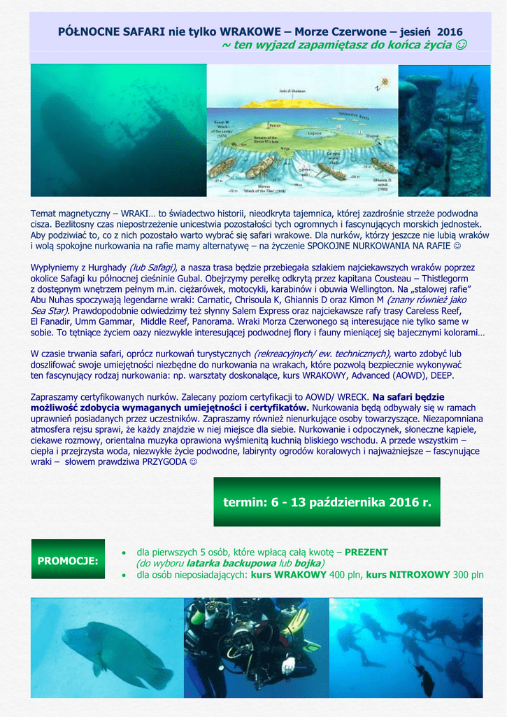 PÓŁNOCNE SAFARI nie tylko WRAKOWE – Morze Czerwone – jesień 2016 ~ ten wyjazd zapamiętasz do końca życia ☺ Temat magnetyczny – WRAKI… to świadectwo historii, nieodkryta tajemnica, której zazdrośnie strzeże podwodna cisza. Bezlitosny czas niepostrzeżenie unicestwia pozostałości tych ogromnych i fascynujących morskich jednostek. Aby podziwiać to, co z nich pozostało warto wybrać się safari wrakowe. Dla nurków, którzy jeszcze nie lubią wraków i wolą spokojne nurkowania na rafie mamy alternatywę – na życzenie SPOKOJNE NURKOWANIA NA RAFIE Wypłyniemy z Hurghady (lub Safagi), a nasza trasa będzie przebiegała szlakiem najciekawszych wraków poprzez okolice Safagi ku północnej cieśninie Gubal. Obejrzymy perełkę odkrytą przez kapitana Cousteau – Thistlegorm z dostępnym wnętrzem pełnym m.in. ciężarówek, motocykli, karabinów i obuwia Wellington. Na „stalowej rafie” Abu Nuhas spoczywają legendarne wraki: Carnatic, Chrisoula K, Ghiannis D oraz Kimon M (znany również jako Sea Star). Prawdopodobnie odwiedzimy też słynny Salem Express oraz najciekawsze rafy trasy Careless Reef, El Fanadir, Umm Gammar, Middle Reef, Panorama. Wraki Morza Czerwonego są interesujące nie tylko same w sobie. To tętniące życiem oazy niezwykle interesującej podwodnej flory i fauny mieniącej się bajecznymi kolorami… W czasie trwania safari, oprócz nurkowań turystycznych (rekreacyjnych/ ew. technicznych), warto zdobyć lub doszlifować swoje umiejętności niezbędne do nurkowania na wrakach, które pozwolą bezpiecznie wykonywać ten fascynujący rodzaj nurkowania: np. warsztaty doskonalące, kurs WRAKOWY, Advanced (AOWD), DEEP. Zapraszamy certyfikowanych nurków. Zalecany poziom certyfikacji to AOWD/ WRECK. Na safari będzie możliwość zdobycia wymaganych umiejętności i certyfikatów. Nurkowania będą odbywały się w ramach uprawnień posiadanych przez uczestników. Zapraszamy również nienurkujące osoby towarzyszące. Niezapomniana atmosfera rejsu sprawi, że każdy znajdzie w niej miejsce dla siebie. Nurkowanie i odpoczynek, słoneczne kąpiele, ciekawe rozmowy, orientalna muzyka oprawiona wyśmienitą kuchnią bliskiego wschodu. A przede wszystkim – ciepła i przejrzysta woda, niezwykłe życie podwodne, labirynty ogrodów koralowych i najważniejsze – fascynujące wraki – słowem prawdziwa PRZYGODA termin: 6 - 13 października 2016 r. PROMOCJE: dla pierwszych 5 osób, które wpłacą całą kwotę – PREZENT (do wyboru latarka backupowa lub bojka) dla osób nieposiadających: kurs WRAKOWY 400 pln, kurs NITROXOWY 300 pln ICE PRINCESS czyli nasza łódź Motorowy jacht drewniany z 2007r. Generalny remont 2012r. . Długość 34 m Szerokość: 7,75 m Silniki 2x 950 HP, generatory 2 x 80 kW Perkins 4 pokłady (w tym pokłady słoneczno - relaksacyjne) 12 dwuosobowych kabin wyposażonych w łazienkę, toaletę, minibar, klimatyzację. Łóżka w kabinach usytuowane są obok siebie. W salonie: TV, DVD, audio. Pokład nurkowy: z komfortowym zejściem do wody i miejscem na przechowywanie sprzętu. Wyposażenie łodzi: zbiorniki wodne 25 ton, odsalarka 3T/d, dwa kompresory do ładowania butli (2 x 250l/ min.), mixer nitroxowy, radar, echo, HF, GPS, VHF, EPIRB, łodzie i kamizelki ratunkowe, dwa riby 6,5m (2 x 40 KW Yamaha). Zestaw tlenowy i apteczka. PROGRAM NURKOWY Możesz dowolnie zaplanować swój grafik nurkowań korzystając z propozycji naszych kursów, warsztatów czy po prostu ciesząc się z niezwykłego czasu, który spędzisz pod wodą… Pamiętaj, że zawsze możesz skorzystać z naszej opieki, rady i pomocy, bo dla nas najważniejszy jest Twój komfort i Twoje bezpieczeństwo. przykładowe miejsca nurkowe - WRAKI THISTLEGORM CARNATIC SS Thistlegorm – brytyjski statek handlowy zbud. w 1940 r. Miał 126 m długości i 17,5 m szerokości. W czasie II Wojny Św. został wcielony do marynarki wojennej. W X 1941 r. opłynął Afrykę i wpłynął na Morze Czerwone. Załadowany zapasami dla V Armii Bryt. stacjonującej w Aleksandrii zakotwiczył na morzu przed wpłynięciem do Kanału Sueskiego. Rankiem 6 X zaatakowały go dwa niemieckie bombowce lecące z bazy na Krecie. Cztery bomby uderzyły w skład amunicji, rozsadzając pokład. Statek stanął w pionie i poszedł na dno. Wrak został odkryty przez J.Y.Cousteau w l 50. XX w, a na pocz. lat 90 tych został ponownie "odkryty" dla nurkowania rekreacyjnego i stał się kultowym miejscem nurkowym. Statek ma dostępną ładownię wraz z ładunkiem (ciężarówki, motocykle, skrzydła samolotów, silniki, pociągi, amunicja, pojazdy opancerzone, inne uzbrojenie, transportery, motorowery BSA, jeepy, tracki, stosy karabinów, sprzęt radiowy, amunicja, zapas obuwia Wellington). Jest wystawiony na silne działanie prądów pływowych. Warunki i głębokość czynią wrak dostępny dla doświadczonych nurków. Nazywany "Wine Wreck" ze względu na ładunek wina, portwajnu, szampana, piwa i wody sodowej, który wraz z £40,000 złota wiózł przed zatonięiem. Drewniany parowco-żaglowiec. Zatonął 14 XI 1869 r. i przez ponad 100 lat był jedynym wrakiem tej rafy. Dopiero w latach 1978- 1983 dołączyły do niego kolejne cztery statki. Położony w zakresie 15-28 m. Spoczywa na lewej burcie, równolegle do ściany rafy. Drewniane pokłady zmurszały, a stalowe ramy porośnięte grubą warstwą koralowców miękkich stanowią przepiękne motywy fotograficzne. Nurkowanie w kadłubie przypomina spacer pomiędzy drewnianymi arkadami…. GHIANNIS D Najmłodszy i najlepiej zachowany wrak rafy Abu Nuhas. Najciekawsza jest rufa, odcięta od reszty okrętu, spoczywa na lewej burcie na głębokości 23m przechylona pod kątem 45°. Nurek wpływający do wnętrza może łatwo stracić orientację z powodu nachylenia wszystkich ścian i podłóg. Po stronie sterburty nadal wisi trap, po którym ewakuowała się załoga. Widoczna jest także częściowo schowana w piachu i mocno pogięta śruba. Na wschod