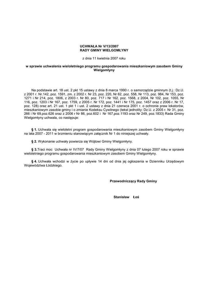 UCHWAŁA Nr V/13/2007 RADY GMINY WIELGOMŁYNY z dnia 11