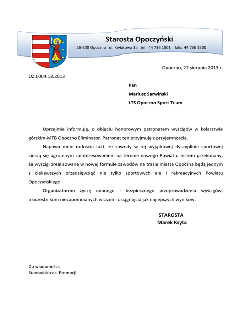 Starosta Opoczyński 26-300 Opoczno ul. Kwiatowa 1a tel. 44 736 1501 faks 44 736 1500 Opoczno, 27 sierpnia 2013 r. OZ.I.004.18.2013 Pan Mariusz Sarwiński LTS Opoczno Sport Team Uprzejmie informuję, o objęciu honorowym patronatem wyścigów w kolarstwie górskim-MTB Opoczno Eliminator. Patronat ten przyjmuję z przyjemnością. Napawa mnie radością fakt, że zawody w tej wyjątkowej dyscyplinie sportowej cieszą się ogromnym zainteresowaniem na terenie naszego Powiatu. Jestem przekonany, że wyścigi zrealizowane w nowej formule zawodów na trasie miasta Opoczna będą jednym z ciekawszych przedsięwzięć nie tylko sportowych ale i rekreacyjnych Powiatu Opoczyńskiego. Organizatorom życzę udanego i bezpiecznego przeprowadzenia wyścigów, a uczestnikom niezapomnianych wrażeń i osiągnięcia jak najlepszych wyników. STAROSTA Marek Ksyta Do wiadomości: Stanowisko ds. Promocji