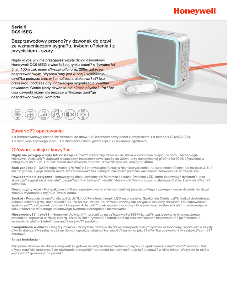 Seria 9 DC915EG Bezprzewodowy przeno?ny dzwonek do drzwi ze wzmacniaczem sygna?u, trybem u?pienia i z przyciskiem - szary Nigdy wi?cej ju? nie przegapisz wizyty dzi?ki dzwonkowi Honeywell DC915EG z wiod?c? na rynku bateri? o ?ywotno?ci 5 lat, 100m zakresem s?yszalno?ci oraz 200m zakresem bezprzewodowym. Wyposa?ony jest w opcj? wyciszenia dzwi?ku podczas snu, wi?c mo?esz zrelaksowa? si? bez przeszkód, podczas gdy innowacyjna sygnalizacja ?wietlna powiadomi Ciebie kiedy dzwonka nie b?dzie s?ycha?. Po??cz dwa dzwonki razem dla jeszcze wi?kszego zasi?gu bezprzewodowego i komfortu. Zawarto?? opakowania: 1 x Bezprzewodowy przeno?ny dzwonek do drzwi,1 x Bezprzewodowy panel z przyciskiem,1 x bateria x CR2032 (3V), 1 x Instrukcja szybkiego startu, 1 x Bezpiecze?stwo i gwarancja,1 x Deklaracja zgodno?ci, G?ówne funkcje i korzy?ci: Nigdy nie przegap wizyty lub dostawy - Umie?? przeno?ny dzwonek do drzwi w dowolnym miejscu w domu, technologia Honeywell ActivLink™ zapewni niezawodny bezprzewodowy zasi?g do 200m, przy maksymalnej g?o?no?ci 90dB s?yszalnej w odleg?o?ci do 100m. Po??cz razem dwa dzwonki do drzwi, a zwi?kszysz ich zasi?g do 400m. Brak zak?óce? - Dzi?ki regulowanej g?o?no?ci i innowacyjnej funkcji u?pienia/wyciszenia, na czas nieokre?lony, lub na czas 3, 6, 9 lub 12 godzin, Twoja rodzina mo?e si? zrelaksowa? bez ?adnych zak?óce? podczas wieczorów filmowych lub w trakcie snu. Powiadomienia optyczne - Innowacyjny efekt uzyskany dzi?ki ramce i diodzie ?wietlnej LED, które zapewniaj? dyskretn?, lecz skuteczn? sygnalizacj? wizualn?, uzupe?nion? w wybran? melodi?, która w g?o?nym otoczeniu alarmuje Ciebie, kiedy nie s?ycha? dzwonka. Rewolucyjny wzór - Kompaktowe i pi?knie zaprojektowane w harmonizuj?cej palecie bia?ego i szarego - nasze dzwonki do drzwi zosta?y wykonane z my?l? o Twoim domu. Spokój - Poczucie pewno?ci dla go?ci, dzi?ki pod?wietleniu lampki LED na przycisku. Spokój dla Ciebie dzi?ki funkcji dyskretnego pukania odtwarzaj?cej inn? melodi? tak, ?e od razu wiesz, ?e cz?onek rodziny lub przyjaciel stoi przy drzwiach. Dla zapewnienia spokoju po??cz dzwonek do drzwi Honeywell ActivLink™ z akcesoriami ochrony Honeywell oraz zestawami alarmu domowego w celu utworzenia w?asnego unikatowego systemu ostrzegania i alarmowania. Niezawodno?? i jako?? - Honeywell ActivLink™, pracuj?cy na cz?stotliwo?ci 868MHz, dzi?ki zastosowaniu innowacyjnego protoko?u, zapewnia wi?kszy zasi?g, przed?u?on? ?ywotno?? baterii do 5 lat oraz zwi?kszon? niezawodno?? po??czenia, a wszystko to obj?te 2-letni? gwarancj? na jako?? produktu. Kompaktowa wielko?? i bogaty d?wi?k - Wszystkie dzwonki do drzwi Honeywell oferuj? cyfrowo wzmocniony, krystalicznie czysty d?wi?k dobrze s?yszalny w ca?ym domu i ogrodzie, obejmuj?cy wiod?c? na rynku jako?? d?wi?ku opakowan? w zaskakuj?co ma?? obudow?! ?atwa instalacja Wszystkie dzwonki do drzwi Honeywell s? gotowe do u?ycia bezpo?rednio po wyj?ciu z opakowania z mo?liwo?ci? monta?u bez u?ycia narz?dzi oraz prost? do otwierania przegródk? na baterie tak, aby mo?na je by?o ustawi? w kilka minut. Wszystko to obj?te jest 2-letni? gwarancj? na produkt. Specyfikacja: Bezprzewodowy przeno?ny dzwonek do drzwi Kolor Grey Monta? na?cienny Opcja Cz?stotliwo?? / Bezprzewodowy zasi?g* 868MHz / 200m Rozszerzacz zakresu Tak Zakres s?yszalno?c9 (g?o?no??) 100m (90dB) Melodie 8 D?wi?k Sterowanie g?o?no?ci? / Tryb spania i wyciszenia / Wewn?trzna syrena Czas alarmu (min) 2 (Tryb wewn?trznej syreny) Alerty wizualne Wska?nik LED / 8-kolorowa lampka Halo / Lampka LED Kolory Halo Czerwone, zielone, niebieskie, cyjan, magenta, ?ó?ty, bia?y, bursztynowy Zasilanie Bateria: 4 x LR14 (C) 1.5V - (nie za??czone) ?ywotno?? baterii (lata) 5 Funkcje baterii Wska?nik niskiego stanu baterii / ?atwo otwierana przegródka na baterie Mains Power via Micro USB Opcjonalne zasilanie zewn?trzne USB 5V 500mA Maksymalna pojemno?? urz?dzenia 6 x Bezprzewodowy panel z przyciskiem/Bezprzewodowy czujnik ruchu/Bezprzewodowy czujnik na drzwi i okna Reset fabryczny Tak Temperatura robocza / przechowywania 0°C to +40°C/-20°C to +60°C Wymiary (mm) / Masa (g) 126 (h) x 126 (w) x 41.8 (d) / 264 (g) Zamocowania Obejmy / Ko?ki rozporowe / ?ruby Bezprzewodowy panel z przyciskiem Kolor bia?y Monta? na?cienny Opcja Opcje monta?u bez ?rubokr?ta (na klej) Tak Cz?stotliwo?? / Bezprzewodowy zasi?g* 868MHz / 200m Alerty wizualne Lampka zaufania LED Zasilanie Bateria: 1 x CR2032 (3V) - (included) ?ywotno?? baterii (lata) 2 Funkcje baterii Wska?nik niskiego stanu baterii / ?atwo otwierana przegródka na baterie Wzór panelu z przyciskiem Panorama Tabliczka na wtyk Tak Rating IP IP55 Temperatura robocza / przechowywania -20°C to +50°C/-20°C to +60°C Wymiary (mm) / Masa (g) 30 (h) x 70 (w) x 16 (d) / 23.5 (g) Zamocowania Obejmy / Ko?ki rozporowe / ?ruby / Przylepce Pack Kod EAN / Standardowy kod EAN opakowania 5004100967954 / 5004100968098 Wymiary opakowania (mm) / Masa (g) 216 (h) x 150 (w) x 70 (d) / 525 (g) Standardowa ilo?? opakowa? 4 * Zasi?g mierzony na terenie otwartym; ?ciany, sufity i struktury metalowe mog? go ograniczy?. livewell.honeywell.com | © 2015 Honeywell International Inc.