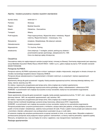 Alpinka - kwatera prywatna o bardzo wysokim standardzie Symbol oferty: 5445120/111 Państwo: Słowacja Region: Beskidy Kysuckie Miasto: Ošćadnica - Oszczadnica Transport: Własny Profil wyjazdu: Pobyt wypoczynkowy, Wyjazd dla dzieci i młodzieży, Wyjazd Wyżywienie: śniadanie, Obiadokolacje, We własnym zakresie Zakwaterowanie: Kwatera prywatna Wyposażenie: TV, Kuchnia, Parking świadczenia: Cena obejmuje: 7 noclegów, pościel, parking przy obiekcie i rodzinny, Wyjazd biznesowo - motywacyjny, Inny przechowalnia sprzętu sportowego, ubezpieczenie KL i NW. Cena nie obejmuje opłaty klimatycznej. Oscadnica Oszczadnica należy do najsłynniejszych centrów turystyki letniej i zimowej na Słowacji. Dominantą miejscowości jest najwyższy szczyt Beskidów Kysuckich Wielka Racza (VEĽKÁ RAČA / 1236m n.p.m.), gdzie znajduje się słynny TOP ośrodek narciarski SNOW PARADISE. Pensjonat ALPINKA Pensjonat rodzinny ALPINKA usytuowany jest w cichym i spokojnym zakątku miejscowości, skąd gości w okresie zimowym do ośrodka narciarskiego bezpłatnie dowozi miejscowy SKIBUS. Pensjonat oferuje zakwaterowanie w 5 apartamentach z klimatem rodzinnym, w przytulnych i stylowo wyposażonych apartamentach. Apartamenty oferują dla gości prywatność i wygodę. Każdy posiada wyposażoną kuchnie, kolorową telewizję kablową, mini wieżę, internet, łazienkę oraz WC. Do relaksu i wypoczynku przygotowana jest lampa solna, która znajduje się w każdym apartamencie. Istnieje również możliwość bezpłatnego wypożyczania słońca górskiego, widea z wideokasetami i odtwarzacza DVD. NOWOŚĆ- w przechowalni nart znajduje się suszarka na buty narciarskie, każdy but ma samodzielne wygrzewanie. Zakwaterowanie Nasze apartamenty oferują dla gości prywatność i wygodę, każdy posiada wyposażoną kuchnie, TV SAT, mini - wieżę, szybki darmowy Internet - WiFi, we wsyzstkich apartamentach, sejf, łazienka i WC. Do relaksu i wypoczynku przygotowana jest lampa solna, która znajduje się w każdym apartamencie. Istnieje również możliwość bezpłatnego uyzwania lampy kwarcowej, odtwarzacza DVD i magnetowidu. NOWOŚĆ- w przechowalni nart znajduje się suszarka na buty narciarskie, każdy but ma samodzielne wygrzewanie. Pensjonat posiada ładne i przytulne pomieszczenie z minibarem, służące także jako jadalnia, w której podajemy domowe posiłki w formie śniadań i obiadokolacji. Jadalnia może pomieścić 20 osób. Prosto z jadalni można przejść pod zadaszony taras z kominkiem, bilardem, piłkarzykami oraz profesjonalnym automatem do gry w rzutki (dart). W suterenie znajduje się zamykane pomieszczenie na sprzęt narciarski w zimie, a na rowery latem. Wszystkie urządzenia i pomieszczenia pensjonatu służą wyłącznie naszym gościom i domownikom, co tworzy rodzinną atmosferę i zapewnia spokój. Wierzymy, że będziecie się u nas czuli lepiej niż w domu i spędzicie u nas niezapomniane i beztroskie dni. Rodzaje apartamentów 1/3 TYP A - dla 5 osób - na poddaszu pensjonatu sypialnia z łózkiem podwójnym oraz pojedynczym, pokój gościnny z 2 łóżkami, kąt jadalny (lodówka, kuchenka, czajnik elektryczny, naczynie), komplet wypoczynkowy, kolorowa kablowa telewizja, mini - wieża + łazienka i WC Apartament TYB B dla 4 osób - na poddaszu sypialnia z łóżkiem małżeńskim, pokój gościnny z 2 miejscami do spania, kąt jadalny (kuchenka, lodówka, czajnik elektryczny, naczynie), komplet wypoczynkowy, kolorowa kablowa telewizja, mini - wieża + łazienka i WC TYP C - dla 5 osób na poddaszu pensjonatu sypialnia z łóżkiem małżeńskie oraz łóżkiem pojedynczym oraz balkonem, pokój gościnny z 2 łóżkami, kąt jadalny (kuchenka, lodówka, czajnik elektryczny, naczynie), komplet wypoczynkowy, kolorowa kablowa telewizja, mini - wieża + łazienka i WC Apartament TYP D dla 4 osób na pierwszym piętrze sypialnia z 2 łóżkami oraz łóżkiem piętrowym, komplet wypoczynkowy, kolorowa telewizja kablowa, CD - mini - wieża kąt jadalny (kuchenka, lodówka, czajnik elektryczny, naczynie), łazienka i samodzielne WC Apartament TYP E dla 4 osób na pierwszym piętrze pensjonatu sypialnia z 2 łóżkami i 1 łóżkiem piętrowym, komplet wypoczynkowy, kolorowa telewizja kablowa, CD - mini - wieżą + balkon, kąt jadalny (kuchenka, lodówka, czajnik elektryczny, naczynie), łazienka i WC Promocja Nocując u nas otrzymujecie Państwo kartę rabatową PARK SNOW Card, dzięki której kupicie 6-dniowy skipass z rabatem 30%, co daje oszczędność 6 € dziennie." Wyżywienie We własnym zakresie - każdy apartament posiada kompletnie wyposażony aneks kuchenny. Możliwość wykupienia posiłków podawanych w pensjonacie (kuchnia domowa) Śniadania - w formie bufetu (szwedzki stół) 5€/osoba Obiadokolacja - zupa, danie główne, deser 5€/osoba Śniadanie + obiadokolacja 10€/osoba Oferta wyżywienia dla dzieci do lat 10 Śniadanie - 2,5€ Obiadokolacja- 3,5€ Śniadanie + obiadokolacja - 6€ Jak do nas dojechać ? Współrzędne geogaficzne 49°26´ szerokości północne 18°53´ długości wschodniej GPS: E 18.86748° N 49.42429° x: 4200 y: 4326 SAMOCHODEM: z głównej drogi Czadca - Żylina zjazd do Oszczadnicy, następnie w lewo pod wiaduktem do ronda, na którym skręcamy w prawo; stąd po 2 km po prawej stronie drogi znajduje się tablica Rodzinny pensjonat ALPINKA - APARTAMENTY ALPINKA i wjazd do pensjonatu. AUTOBUSEM: przystanek Oszczadica VOJTUS, z którego do pensjonatu jest 50 m POCIĄGIEM: z dworca kolejowego 2,5 km TERMINY: od: 2017-03-11 do: 2017-03-18 (8 dni), miejsca: zamów cena od: 499 PLN = 115 EUR od: 2017-03-18 do: 2017-03-25 (8 dni), miejsca: zamów cena od: 499 PLN = 115 EUR od: 2017-03-25 do: 2017-04-01 (8 dni), miejsca: zamów cena od: 499 PLN = 115 EUR 2/3 CENNIK: Długość pobytu: 8 dni Grupa cenowa: B7 Pobyt w obiekcie (do wyboru) (*) Apartament 4 osobowy standardowo dla osób: 4 Apartament 4-os. + dostawka standardowo dla osób: 5 Apartametn
