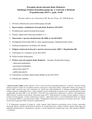 Porządek obrad zebrania Rady Rodziców Szkolnego Punktu Konsultacyjnego im. J. Lelewela w Brukseli 19 października 2015 r., godz. 19:00 Zebranie odbywa się w Konsulacie RP, Rue des Francs 28, 1040 Bruksela. 1. Otwarcie zebrania przez przewodniczącego Zarządu 2. Sprawozdanie z działalności Zarządu Rady Rodziców 2014/2015 3. Przedstawienie raportu Komisji Rewizyjnej 4. Pytania i odpowiedzi dotyczące punktów 2 i 3 5. Głosowanie w sprawie absolutorium dla ZRR za rok 2014/2015 6. Wystąpienie Kierownika SPK nt. stanu organizacyjnego i funkcjonowania szkoły 7. Dyskusja programowa na bieżący rok szkolny 8. Podjęcie ostatecznych decyzji w sprawie stowarzyszenia ABSL* i Regulaminu RR 9. Uchwalenie ew. wniosków na rok 2015/2016 10. Wybór komisji skrutacyjnej 11. Wybory nowych organów Rady Rodziców – Zarządu i Komisji Rewizyjnej - zgłoszenia kandydatów - prezentacja kandydatów - głosowanie (tajne**) - podliczenie głosów 12. Uchwalenie wysokości dobrowolnej składki na rok 2015/2016 13. Zakończenie zebrania * Stowarzyszenie (ASBL) zostało założone w 2012 r. przez ówczesny Zarząd Rady Rodziców i w oparciu o decyzję walnego zebrania rodziców służyło do wszystkich rozliczeń związanych z aktywnością Rady. Zarząd RR wybrany rok później nie przejął ASBL, ponieważ jego nowi członkowie nie chcieli brać odpowiedzialności za działania poprzedników. Podczas walnego zebrania w październiku 2014 r. rodzice udzielili wreszcie absolutorium (w oparciu m.in. o raport Komisji Rewizyjnej za poprzednie dwa lata) ZRR za rok 2012/2013 i 2013/2014 oraz postanowili (większością 2/3 głosów), aby każdorazowy ZRR korzystał z formuły stowarzyszenia. Pod koniec lutego 2015 r. Rada Rodziców (zwołana wreszcie zgodnie z Ustawą o systemie oświaty) przyjęła - również większością 2/3 głosów - odpowiednie zapisy w nowym Regulaminie Rady. Ze względu na zastrzeżenia ORPEG co do umieszczenia ASBL w Regulaminie, konieczne jest ponowne rozważenie tej kwestii - biorąc również pod uwagę pismo MEN otrzymane 2 października br. ** W Regulaminie przyjętym 26 lutego br. wybór organów Rady Rodziców przewidziano jawny (Ustawa wprowadza obowiązek tajności wyborów przedstawicieli rodziców na szczeblu klasowym). Tajność wyborów organów Rady (jako tryb 'najbardziej demokratyczny i transparentny') zaleciła w swoich dodatkowych uwagach pani Anna Atłas (dyrektor ORPEG), 1 września br.