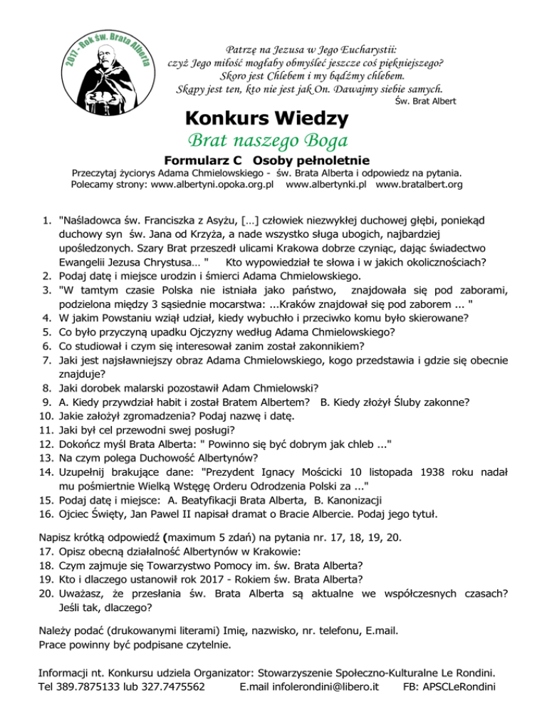 Patrzę na Jezusa w Jego Eucharystii: czyż Jego miłość mogłaby obmyśleć jeszcze coś piękniejszego? Skoro jest Chlebem i my bądźmy chlebem. Skąpy jest ten, kto nie jest jak On. Dawajmy siebie samych. Św. Brat Albert Konkurs Wiedzy Brat naszego Boga Formularz C Osoby pełnoletnie Przeczytaj życiorys Adama Chmielowskiego - św. Brata Alberta i odpowiedz na pytania. Polecamy strony: www.albertyni.opoka.org.pl www.albertynki.pl www.bratalbert.org 1. "Naśladowca św. Franciszka z Asyżu, […] człowiek niezwykłej duchowej głębi, poniekąd duchowy syn św. Jana od Krzyża, a nade wszystko sługa ubogich, najbardziej upośledzonych. Szary Brat przeszedł ulicami Krakowa dobrze czyniąc, dając świadectwo Ewangelii Jezusa Chrystusa… " Kto wypowiedział te słowa i w jakich okolicznościach? 2. Podaj datę i miejsce urodzin i śmierci Adama Chmielowskiego. 3. "W tamtym czasie Polska nie istniała jako państwo, znajdowała się pod zaborami, podzielona między 3 sąsiednie mocarstwa: ...Kraków znajdował się pod zaborem ... " 4. W jakim Powstaniu wziął udział, kiedy wybuchło i przeciwko komu było skierowane? 5. Co było przyczyną upadku Ojczyzny według Adama Chmielowskiego? 6. Co studiował i czym się interesował zanim został zakonnikiem? 7. Jaki jest najsławniejszy obraz Adama Chmielowskiego, kogo przedstawia i gdzie się obecnie znajduje? 8. Jaki dorobek malarski pozostawił Adam Chmielowski? 9. A. Kiedy przywdział habit i został Bratem Albertem? B. Kiedy złożył Śluby zakonne? 10. Jakie założył zgromadzenia? Podaj nazwę i datę. 11. Jaki był cel przewodni swej posługi? 12. Dokończ myśl Brata Alberta: " Powinno się być dobrym jak chleb ..." 13. Na czym polega Duchowość Albertynów? 14. Uzupełnij brakujące dane: "Prezydent Ignacy Mościcki 10 listopada 1938 roku nadał mu pośmiertnie Wielką Wstęgę Orderu Odrodzenia Polski za ..." 15. Podaj datę i miejsce: A. Beatyfikacji Brata Alberta, B. Kanonizacji 16. Ojciec Święty, Jan Pawel II napisał dramat o Bracie Albercie. Podaj jego tytuł. Napisz krótką odpowiedź (maximum 5 zdań) na pytania nr. 17, 18, 19, 20. 17. Opisz obecną działalność Albertynów w Krakowie: 18. Czym zajmuje się Towarzystwo Pomocy im. św. Brata Alberta? 19. Kto i dlaczego ustanowił rok 2017 - Rokiem św. Brata Alberta? 20. Uważasz, że przesłania św. Brata Alberta są aktualne we współczesnych czasach? Jeśli tak, dlaczego? Należy podać (drukowanymi literami) Imię, nazwisko, nr. telefonu, E.mail. Prace powinny być podpisane czytelnie. Informacji nt. Konkursu udziela Organizator: Stowarzyszenie Społeczno-Kulturalne Le Rondini. Tel 389.7875133 lub 327.7475562 E.mail [email protected] FB: APSCLeRondini
