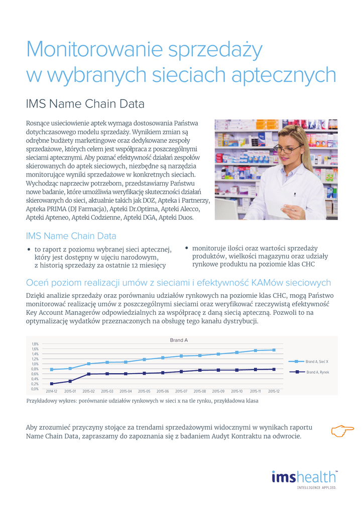 Monitorowanie sprzedaży w wybranych sieciach aptecznych IMS Name Chain Data Rosnące usieciowienie aptek wymaga dostosowania Państwa dotychczasowego modelu sprzedaży. Wynikiem zmian są odrębne budżety marketingowe oraz dedykowane zespoły sprzedażowe, których celem jest współpraca z poszczególnymi sieciami aptecznymi. Aby poznać efektywność działań zespołów skierowanych do aptek sieciowych, niezbędne są narzędzia monitorujące wyniki sprzedażowe w konkretnych sieciach. Wychodząc naprzeciw potrzebom, przedstawiamy Państwu nowe badanie, które umożliwia weryfikację skuteczności działań skierowanych do sieci, aktualnie takich jak DOZ, Apteka i Partnerzy, Apteka PRIMA (DJ Farmacja), Apteki Dr.Optima, Apteki Alecco, Apteki Apteneo, Apteki Codzienne, Apteki DGA, Apteki Duos. IMS Name Chain Data monitoruje ilości oraz wartości sprzedaży raport z poziomu wybranej sieci aptecznej, • •toktóry produktów, wielkości magazynu oraz udziały jest dostępny w ujęciu narodowym, rynkowe produktu na poziomie klas CHC z historią sprzedaży za ostatnie 12 miesięcy Oceń poziom realizacji umów z sieciami i efektywność KAMów sieciowych Dzięki analizie sprzedaży oraz porównaniu udziałów rynkowych na poziomie klas CHC, mogą Państwo monitorować realizację umów z poszczególnymi sieciami oraz weryfikować rzeczywistą efektywność Key Account Managerów odpowiedzialnych za współpracę z daną siecią apteczną. Pozwoli to na optymalizację wydatków przeznaczonych na obsługę tego kanału dystrybucji. 1,8% 1,6% 1,4% 1,2% 1,0% 0,8% 0,6% 0,4% 0,2% 0,0% Brand A Brand A, Sieć X Brand A, Rynek 2014-12 2015-01 2015-02 2015-03 2015-04 2015-05 2015-06 2015-07 2015-08 2015-09 2015-10 2015-11 2015-12 Przykładowy wykres: porównanie udziałów rynkowych w sieci x na tle rynku, przykładowa klasa Aby zrozumieć przyczyny stojące za trendami sprzedażowymi widocznymi w wynikach raportu Name Chain Data, zapraszamy do zapoznania się z badaniem Audyt Kontraktu na odwrocie. Monitorowanie zobowiązań kontraktowych w aptekach sieciowych Rosnące znaczenie sieci aptecznych powoduje, że coraz częściej decydują się Państwo na zawarcie umowy określającej formę i czas promocji wybranych produktów. Pojawia się wtedy pytanie – w jaki sposób sprawnie monitorować wykonanie tego typu kontraktu? Jak ocenić: •Czy i jak apteki sieciowe wywiązują się ze zobowiązań? •Jaki jest udział aptek, które nie realizują zapisów umowy? •Czy konkurencja również podjęła takie kroki? Dotychczas angażowali Państwo swoje zespoły przedstawicielskie do weryfikacji kontraktów z sieciami aptek. Wiązało się to z ograniczeniem ich działań promocyjnych. Dlatego też, oferujemy badanie, które pozwala monitorować realizację zobowiązań kontraktowych aptek sieciowych w dowolnym czasie. Audyt nabiera szczególnego znaczenia przy weryfikacji realizacji kontraktów w sieciach nie objętych serwisem Name Chain Data. Audyt Kontraktu umożliwia szybkie i precyzyjne dotarcie do wskazanych aptek sieciowych, również tych o dużym rozproszeniu terytorialnym. Badanie przeprowadzane jest na Państwa zlecenie i wykonywane przez liczny zespół badaczy, co zapewnia krótki termin realizacji. W celu zrozumienia, jak wyniki audytu przekładają się na poziom sprzedaży w poszczególnych sieciach, zapraszamy do zapoznania się z serwisem IMS Name Chain Data na odwrocie. Więcej informacji Aby uzyskać dodatkowe informacje, proszę o kontakt z Key Account Managerem, który obsługuje Państwa firmę z ramienia IMS Health. IMS Health ul. Konstruktorska 13, 02-673 Warszawa, Polska Tel: +48 22 598 03 00, www.imshealth.com ©2016 IMS Health Incorporated and its affiliates. All rights reserved. Trademarks are registered in the United States and in various other countries.