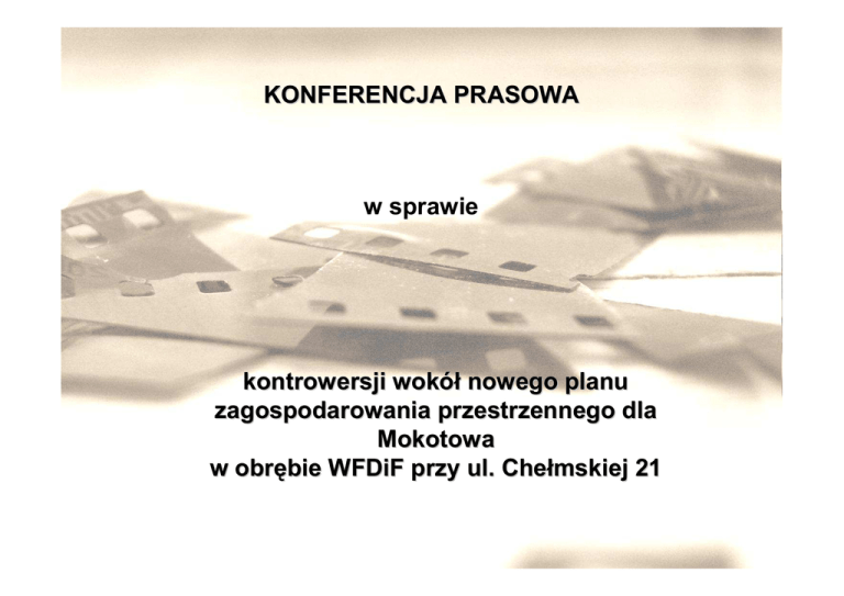 KONFERENCJA PRASOWA w sprawie kontrowersji wokół nowego planu zagospodarowania przestrzennego dla Mokotowa w obrębie WFDiF przy ul. Chełmskiej 21 WFDiF to 60 lat tradycji w produkcji filmów dokumentalnych i fabularnych, a takŜe najpopularniejszych seriali. Tu tworzyła się legenda "Polskiej Szkoły Dokumentu”. Jerzy Hoffman, Ślesicki, Kazimierz Karabasz. Krzysztof Kieślowski, Marcel Łoziński, Jerzy Bossak, Tadeusz Makarczyński, Jan Łomnicki, Tu swoje filmy realizowali m.in..: Edward Skórzewski, Władysław Maria Kwiatkowska, Ludwik Perski, Andrzej Brzozowski, Krystyna Gryczełowska, Danuta Halladin i wielu innych..: WFDiF to przede wszystkim producent własnych projektów dokumentalnych i fabularnych. Z najnowszych warto wymienić: „Do potomnego” Antoniego Krauze, „Kresy – Arkadia i Piekło” Wincentego Ronisza, „Opowiem ci jak wrócę” Filipa Bajona, „Cień pod kamieniem” Tomasza Dobrowolskiego, „Wilcza 11” Aleksandry Domańskiej, „Czternaście dni. Prowokacja bydgoska” Jacka Petryckiego i Grzegorza Eberhardta, „My, Cichociemni. Głosy Ŝyjących” Pawła Kędzierskiego W WFDiF swoje filmy realizowali m.in.: Andrzej Wajda: "Wesele", "Krajobraz po bitwie", "Brzezina", "Dyrygent", "Panny z Wilka", "Człowiek z marmuru", "Człowiek z Ŝelaza" Krzysztof Zanussi: "Za ścianą", "Iluminacja", "Bilans kwartalny", "Barwy ochronne", "Spirala” Krzysztof Kieślowski: "Bez końca", "Krótki film o zabijaniu", "Krótki film o miłości", "Dekalog" W latach 70 i 80 powstały tu wielkie seriale telewizyjne, m.in.: „Noce i dnie” dnie” Jerzego Antczaka „Polskie drogi” drogi” Janusza Morgensterna „Dom” Dom” Jana Łomnickiego Z naszej bazy produkcyjnej korzystały największe produkcje filmowe, m.in.: „Quo Vadis” reŜ. Jerzy Kawalerowicz „Pianista” reŜ. Roman Polański „Ogniem i mieczem”, „Stara Baśń”, reŜ. Jerzy Hoffman „Zemsta” reŜ. Andrzej Wajda Wytwórnia jest równieŜ koproducentem duŜej części polskich produkcji filmowych. Z ostatnich warto wymienić m.in.: „Ile waŜy koń trojański” Juliusza Machulskiego „Mniejsze zło” Janusza Morgensterna „Senność” Magdaleny Piekorz „Stary człowiek i pies” Witolda Leszczyńskiego „Boisko bezdomnych” Kasi Adamik Filmy fabularne produkowane przez WFDiF odnoszą sukcesy frekwencyjne i zdobywają prestiŜowe nagrody i wyróŜnienia, m.in.: „Tam i z powrotem” w reŜ. Wojciecha Wójcika - nagroda za reŜyserię, montaŜ i kostiumy do filmu oraz nagroda publiczności Złoty Klakier na Festiwalu Polskich Filmów Fabularnych w Gdyni w 2002 r.; nagroda publiczności na festiwalu w Kazimierzu Dolnym w 2002 r. „Ogród Luizy” w reŜyserii Macieja Wojtyszki – Nagroda Specjalna Jury oraz Specjalna Nagroda Aktorska dla Marcina Dorocińskiego na Festiwalu Polskich Filmów Fabularnych w Gdyni w 2007 r. „Serce na dłoni” w reŜ. Krzysztofa Zanussiego – nagroda Srebrnego Marka Aureliusza za najlepszą rolę męską dla Bohdana Stupki na III MFF w Rzymie w 2008 r. NAJNOWSZE PRODUKCJE FABULARNE: „Generał Nil” w reŜ. Ryszarda Bugajskiego „RóŜyczka” w reŜ. Jana Kidawy-Błońskiego „Operacja Dunaj” w reŜ. Jacka Głomba „Galerianki” w reŜ. Katarzyny Rosłaniec „ENEN” w reŜ. Feliksa Falka WYTWÓRNIA FILMÓW DOKUMENTALNYCH I FABULARNYCH TO TAKśE: Miejsce pracy 1,5 tys. osób Laboratorium Filmowe obsługujące obróbkę ponad 40 proc. powstających filmów. Tylko w 2008 r. w Laboratorium: wywołano tu 10 mln mb taśmy filmowej; wykonano 1.200 kopii seryjnych do filmów fabularnych wykonano 160 tys. kopii filmów reklamowych do kin oraz 16 tys. kopii zwiastunów Produkcja i autoring kopii cyfrowych w formacie 4K Nowoczesne archiwum filmowe do przechowywania posiadanych zbiorów, w którym znajduje się m.in.: 100 tys. sygnatur 4.200 filmów dokumentalnych zrealizowanych przez i w WFDiF 3.866 wydań Polskiej Kroniki Filmowej Siedziba ponad 40 firm i instytucji filmowych Wytwórnia nie otrzymuje dotacji budŜetowych na działalność statutową. Od lat wypracowuje zysk, który inwestuje w rozwój i modernizację. Pierwszy projekt miejscowego planu zagospodarowania przestrzennego dla Mokotowa w obszarze Sielc Nowy miejscowy plan zagospodarowania przestrzennego dla Mokotowa w obszarze Sielc PROJEKT ZAGOSPODAROWANIA W OBECNEJ POSTACI: UniemoŜliwi bieŜącą działalność i rozwój WFDiF, np. modernizację i remonty istniejących budynków, budowę nowych hal Nie uwzględnia prawa własności do gruntów Nie uwzględnia lokalizacji istniejących budynków (przewiduje pasy zieleni i drogi w miejscu istniejących budynków) Zakłada budowę nowej sieci dróg rozdzielającej Wytwórnię na 6 części Przewiduje wyburzenie ponad 20 istniejących i uŜytkowanych budynków, w tym m.in.: Mistrzowskiej Szkoły ReŜyserii Andrzeja Wajdy, hal zdjęciowych, archiwum filmowego, zakładu montaŜu i dźwięku, budynków Filmoteki Narodowej kliknij tutaj JAK POSTĘPUJE W TEJ SPRAWIE STOŁECZNY RATUSZ? Ignoruje poprawki zgłoszone przez WFDiF Nie odpowiada na pisma interwencyjne Ministra Kultury i Dziedzictwa Narodowego Działa wbrew stanowisku Rady Dzielnicy Mokotów i Komisji Ładu Przestrzennego Miasta Warszawy Nie przedstawia planu alternatywnego – nowej lokalizacji dla WFDiF Nie deklaruje współfinansowania ewentualnej budowy nowej siedziby Wytwórni w innej lokalizacji KONSEKWENCJE DLA POLSKIEGO PRZEMYSŁU FILMOWEGO: Wstrzymanie planowanych inwestycji na terenie WFDiF Likwidacja nowoczesnej i stale rozwijającej się Państwowej Instytucji Filmowej Zniszczenie historycznej Wytwórni związanej z największymi sukcesami polskiej kinematografii Utrata miejsca pracy kilkuset osób związanych z Wytwórnią Likwidacja szkoły filmowej o światowej renomie
