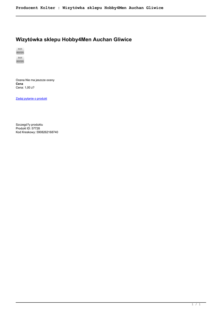 Producent Kolter : Wizytówka sklepu Hobby4Men Auchan Gliwice Wizytówka sklepu Hobby4Men Auchan Gliwice Ocena Nie ma jeszcze oceny Cena Cena: 1,00 z? Zadaj pytanie o produkt Szczegó?y produktu Produkt ID: 57728 Kod Kreskowy: 5908262168740 1 / 1 Powered by TCPDF (www.tcpdf.org)