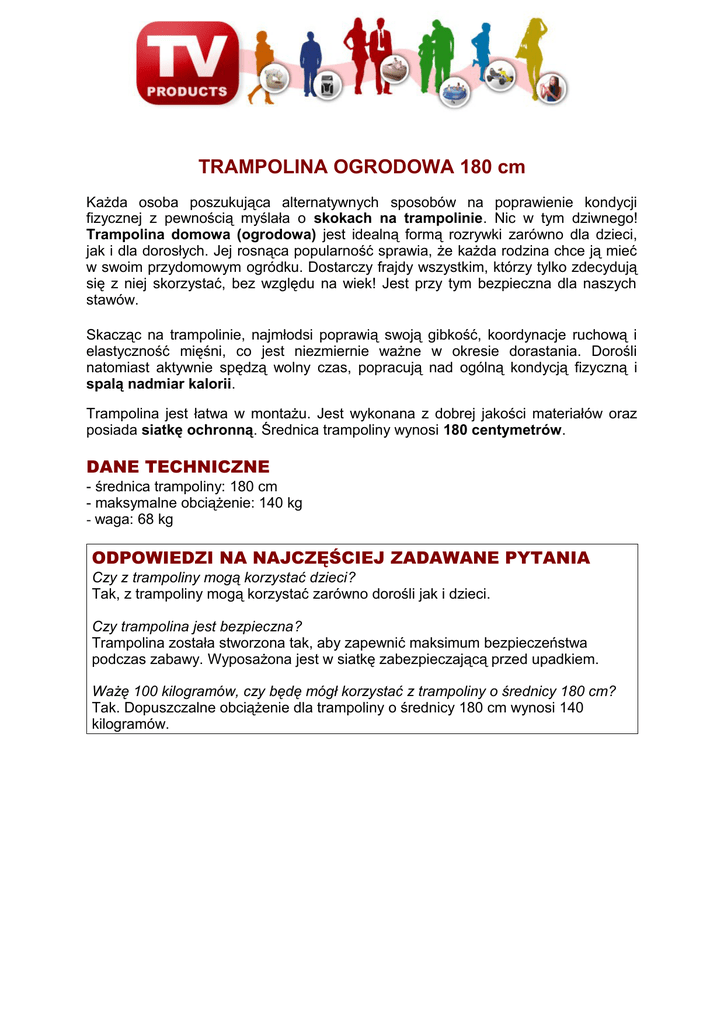 TRAMPOLINA OGRODOWA 180 cm Każda osoba poszukująca alternatywnych sposobów na poprawienie kondycji fizycznej z pewnością myślała o skokach na trampolinie. Nic w tym dziwnego! Trampolina domowa (ogrodowa) jest idealną formą rozrywki zarówno dla dzieci, jak i dla dorosłych. Jej rosnąca popularność sprawia, że każda rodzina chce ją mieć w swoim przydomowym ogródku. Dostarczy frajdy wszystkim, którzy tylko zdecydują się z niej skorzystać, bez względu na wiek! Jest przy tym bezpieczna dla naszych stawów. Skacząc na trampolinie, najmłodsi poprawią swoją gibkość, koordynacje ruchową i elastyczność mięśni, co jest niezmiernie ważne w okresie dorastania. Dorośli natomiast aktywnie spędzą wolny czas, popracują nad ogólną kondycją fizyczną i spalą nadmiar kalorii. Trampolina jest łatwa w montażu. Jest wykonana z dobrej jakości materiałów oraz posiada siatkę ochronną. Średnica trampoliny wynosi 180 centymetrów. DANE TECHNICZNE - średnica trampoliny: 180 cm - maksymalne obciążenie: 140 kg - waga: 68 kg ODPOWIEDZI NA NAJCZĘŚCIEJ ZADAWANE PYTANIA Czy z trampoliny mogą korzystać dzieci? Tak, z trampoliny mogą korzystać zarówno dorośli jak i dzieci. Czy trampolina jest bezpieczna? Trampolina została stworzona tak, aby zapewnić maksimum bezpieczeństwa podczas zabawy. Wyposażona jest w siatkę zabezpieczającą przed upadkiem. Ważę 100 kilogramów, czy będę mógł korzystać z trampoliny o średnicy 180 cm? Tak. Dopuszczalne obciążenie dla trampoliny o średnicy 180 cm wynosi 140 kilogramów.