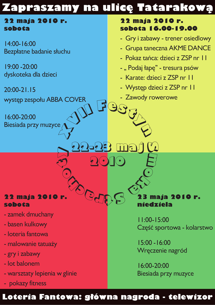 Zapraszamy na ulicę Tatarakową 22 maja 2010 r. sobota 22 maja 2010 r. sobota 16.00-19.00 - Gry i zabawy - trener osiedlowy 14:00-16:00 Bezpłatne badanie słuchu - Grupa taneczna AKME DANCE - Pokaz tańca: dzieci z ZSP nr 11 19:00 -20:00 dyskoteka dla dzieci - „ Podaj łapę” - tresura psów 20:00-21.15 - Występ dzieci z ZSP nr 11 - Karate: dzieci z ZSP nr 11 y X t o h n y 16:00-20:00 Biesiada przy muzyce - Zawody rowerowe e F s t I I V występ zespołu ABBA COVER - basen kulkowy - loteria fantowa - malowanie tatuaży - gry i zabawy - lot balonem - warsztaty lepienia w glinie Strac - zamek dmuchany a 22 maja 2010 r. sobota Smo k 22-23 maj 2010 23 maja 2010 r. niedziela 11:00-15:00 Część sportowa - kolarstwo 15:00 -16:00 Wręczenie nagród 16:00-20:00 Biesiada przy muzyce - pokazy fitness Loteria Fantowa: główna nagroda - telewizor