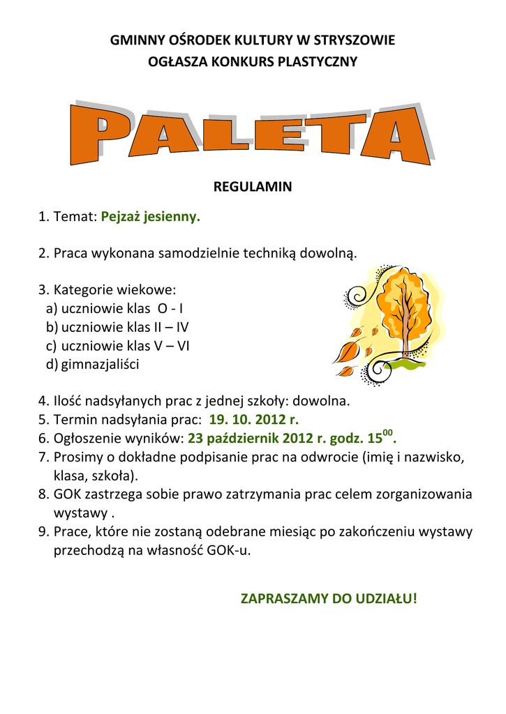 GMINNY OŚRODEK KULTURY W STRYSZOWIE OGŁASZA KONKURS PLASTYCZNY REGULAMIN 1. Temat: Pejzaż jesienny. 2. Praca wykonana samodzielnie techniką dowolną. 3. Kategorie wiekowe: a) uczniowie klas O - I b) uczniowie klas II – IV c) uczniowie klas V – VI d) gimnazjaliści 4. Ilość nadsyłanych prac z jednej szkoły: dowolna. 5. Termin nadsyłania prac: 19. 10. 2012 r. 6. Ogłoszenie wyników: 23 październik 2012 r. godz. 1500. 7. Prosimy o dokładne podpisanie prac na odwrocie (imię i nazwisko, klasa, szkoła). 8. GOK zastrzega sobie prawo zatrzymania prac celem zorganizowania wystawy . 9. Prace, które nie zostaną odebrane miesiąc po zakończeniu wystawy przechodzą na własność GOK-u. ZAPRASZAMY DO UDZIAŁU! GMINNY OŚRODEK KULTURY W STRYSZOWIE OGŁASZA KONKURS PLASTYCZNY REGULAMIN Temat: Pejzaż jesienny. Praca wykonana samodzielnie techniką dowolną. Kategorie wiekowe: a) przedszkolaki z grupy „maluszków” b) przedszkolaki z grupy „średniaków” Ilość nadsyłanych prac z jednego przedszkola: max. trzy prace z każdej grupy. Termin nadsyłania prac: 19. 10. 2012 r. Ogłoszenie wyników: 23 październik 2012 r. godz. 1500. Prosimy o dokładne podpisanie prac na odwrocie (imię i nazwisko, wiek, przedszkole). GOK zastrzega sobie prawo zatrzymania prac celem zorganizowania wystawy . Prace, które nie zostaną odebrane miesiąc po zakończeniu wystawy przechodzą na własność GOK-u. ZAPRASZAMY DO UDZIAŁU!