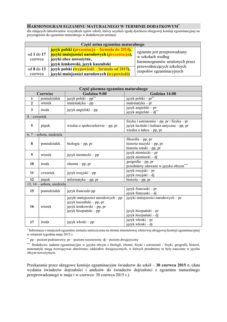 HARMONOGRAM EGZAMINU MATURALNEGO W TERMINIE DODATKOWYM* dla zdających (absolwentów wszystkich typów szkół), którzy uzyskali zgodę dyrektora okręgowej komisji egzaminacyjnej na przystąpienie do egzaminu maturalnego w dodatkowym terminie od 1 do 17 czerwca od 8 do 13 czerwca Część ustna egzaminu maturalnego język polski (prezentacja – formuła do 2014), egzamin jest przeprowadzany języki mniejszości narodowych (prezentacja), w szkołach według języki obce nowożytne, harmonogramów ustalonych przez język łemkowski, język kaszubski przewodniczących szkolnych język polski (wypowiedź – formuła od 2015), zespołów egzaminacyjnych języki mniejszości narodowych (wypowiedź) Czerwiec Część pisemna egzaminu maturalnego Godzina 9:00 Godzina 14:00 1 2 poniedziałek wtorek język polski – pp** matematyka – pp 3 środa język angielski – pp język polski – pr** matematyka – pr język angielski – pr język angielski – dj** 4 – czwartek 5 piątek wiedza o społeczeństwie – pp, pr fizyka i astronomia – pp, pr / fizyka – pr język łaciński i kultura antyczna – pp, pr wiedza o tańcu – pp, pr 6, 7 – sobota, niedziela 8 poniedziałek biologia – pp, pr 9 wtorek język niemiecki – pp 10 środa chemia – pp, pr 11 czwartek język rosyjski – pp piątek informatyka – pp, pr 12 13, 14 – sobota, niedziela 15 16 17 poniedziałek wtorek środa język francuski pp języki mniejszości narodowych – pp język kaszubski – pp, pr język łemkowski – pp, pr język hiszpański – pp język włoski – pp filozofia – pp, pr historia muzyki – pp, pr historia sztuki – pp, pr język niemiecki – pr język niemiecki – dj geografia – pp, pr przedmioty zdawane w języku obcym*** język rosyjski – pr język rosyjski – dj historia – pp, pr język francuski – pr język francuski – dj języki mniejszości narodowych – pr język hiszpański – pr język hiszpański – dj język włoski – pr język włoski – dj Informacja o miejscach egzaminu zostanie umieszczona na stronie internetowej właściwej okręgowej komisji egzaminacyjnej w ostatnim tygodniu maja 2015 r. * ** pp – poziom podstawowy; pr – poziom rozszerzony; dj – poziom dwujęzyczny Dodatkowe zadania egzaminacyjne w języku obcym z biologii, chemii, fizyki i astronomii / fizyki, geografii, historii, matematyki mogą rozwiązywać absolwenci oddziałów dwujęzycznych, w których przedmioty te były nauczane w języku obcym nowożytnym. *** Przekazanie przez okręgowe komisje egzaminacyjne świadectw do szkół – 30 czerwca 2015 r. (data wydania świadectw dojrzałości i aneksów do świadectw dojrzałości z egzaminu maturalnego przeprowadzanego w maju i w czerwcu: 30 czerwca 2015 r.).