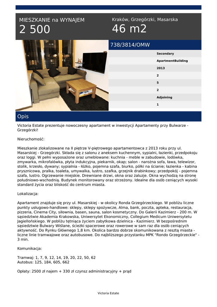 MIESZKANIE na WYNAJEM 2 500 Kraków, Grzegórzki, Masarska 46 m2 738/3814/OMW Secondary ApartmentBuilding 2013 2 5 2 Adjoining 1 Opis Victoria Estate prezentuje nowoczesny apartament w inwestycji Apartamenty przy Bulwarze Grzegórzki! Nieruchomość: Mieszkanie zlokalizowane na II piętrze V-piętrowego apartamentowca z 2013 roku przy ul. Masarskiej - Grzegórzki. Składa się z salonu z aneksem kuchennym, sypialni, łazienki, przedpokoju oraz loggi. W pełni wyposażone oraz umeblowane: kuchnia - meble w zabudowie, lodówka, zmywarka, mikrofalówka, płyta indukcyjna, piekarnik, okap; salon - narożna sofa, ława, telewizor, stolik, krzesło, dywany; sypialnia - łóżko, pojemna szafa, biurko, półki na ścianie; łazienka - kabina prysznicowa, pralka, toaleta, umywalka, lustro, szafka, grzejnik drabinkowy; przedpokój - pojemna szafa, lustro. Ogrzewanie miejskie. Drewniane drzwi, okna oraz żaluzje. Okna wychodzą na stronę południowo-wschodnią. Budynek monitorowany oraz strzeżony. Idealne dla osób ceniących wysoki standard życia oraz bliskość do centrum miasta. Lokalizacja: Apartament znajduje się przy ul. Masarskiej - w okolicy Ronda Grzegórzeckiego. W pobliżu liczne punkty usługowo-handlowe: sklepy, sklepy spożywcze, Alma, bank, poczta, apteka, restauracja, pizzeria, Cinema City, siłownia, basen, sauna, salon kosmetyczny. Do Galerii Kazimierz - 200 m. W sąsiedztwie Akademia Krakowska, Uniwersytet Ekonomiczny, Collegium Medicum Uniwersytetu Jagiellońskiego. W pobliżu tętniąca życiem zabytkowa dzielnica - Kazimierz. W bezpośrednim sąsiedztwie Bulwary Wiślane, ścieżki spacerowe oraz rowerowe w sam raz dla osób ceniących aktywność. Do Rynku Głównego 1,8 km. Okolica bardzo dobrze skomunikowana z resztą miasta liczne linie tramwajowe oraz autobusowe. Do najbliższego przystanku MPK "Rondo Grzegórzeckie" 3 min. Komunikacja: Tramwaj: 1, 7, 9, 12, 14, 19, 20, 22, 50, 62 Autobus: 125, 184, 605, 662 Opłaty: 2500 zł najem + 330 zł czynsz administracyjny + prąd Victoria Estate Serdecznie polecam i zapraszam do oglądania! Małgorzata Wicha tel. +48 511 560 721 email: [email protected] Victoria Estate Powered by TCPDF (www.tcpdf.org)