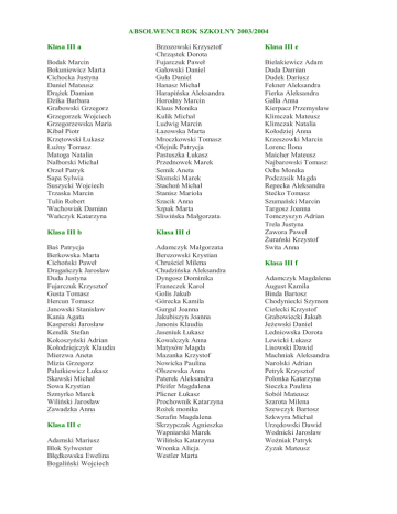 ABSOLWENCI ROK SZKOLNY 2003/2004 Bodak Marcin Bokuniewicz Marta Cichocka Justyna Daniel Mateusz Drążek Damian Dzika Barbara Grabowski Grzegorz Grzegorzek Wojciech Grzegorzewska Maria Kibał Piotr Krzętowski Łukasz Łużny Tomasz Matoga Natalia Nalborski Michał Orzeł Patryk Sapa Sylwia Suszycki Wojciech Trzaska Marcin Tulin Robert Wachowiak Damian Wańczyk Katarzyna Brzozowski Krzysztof Chrząstek Dorota Fujarczuk Paweł Gałowski Daniel Guła Daniel Hanasz Michał Harapińska Aleksandra Horodny Marcin Klaus Monika Kulik Michał Ludwig Marcin Łazowska Marta Mroczkowski Tomasz Olejnik Patrycja Pastuszka Łukasz Przednowek Marek Semik Aneta Słomski Marek Stachoń Michał Stanisz Mariola Szacik Anna Szpak Marta Sliwińska Małgorzata Klasa III b Klasa III d Baś Patrycja Berkowska Marta Cichoński Paweł Dragańczyk Jarosław Duda Justyna Fujarczuk Krzysztof Gusta Tomasz Hercun Tomasz Janowski Stanisław Kania Agata Kasperski Jarosław Kendik Stefan Kokoszyński Adrian Kołodziejczyk Klaudia Mierzwa Aneta Mizia Grzegorz Palutkiewicz Łukasz Skawski Michał Sowa Krystian Szmyrko Marek Wiliński Jarosław Zawadzka Anna Adamczyk Małgorzata Berezowski Krystian Chruściel Milena Chudzińska Aleksandra Dyngosz Dominika Franeczek Karol Golis Jakub Górecka Kamila Gurgul Joanna Jakubiszyn Joanna Janonis Klaudia Jaseniuk Łukasz Kowalczyk Anna Matysów Magda Mazanka Krzystof Nowicka Paulina Olszewska Anna Paterek Aleksandra Pfeifer Magdalena Plicner Łukasz Prochownik Katarzyna Rożek monika Serafin Magdalena Skrzypczak Agnieszka Wapniarski Marek Wilińska Katarzyna Wronka Alicja Westler Marta Klasa III a Klasa III c Adamski Mariusz Blok Sylwester Błędkowska Ewelina Bogaliński Wojciech Klasa III e Bielakiewicz Adam Duda Damian Dudek Dariusz Fekner Aleksandra Fierka Aleksandra Galla Anna Kierpacz Przemysław Klimczak Mateusz Klimczak Natalia Kołodziej Anna Krzeszowki Marcin Lorenc Ilona Maicher Mateusz Najbarowski Tomasz Ochs Monika Podczasik Magda Repecka Aleksandra Stećko Tomasz Szumański Marcin Targosz Joanna Tomczyszyn Adrian Trela Justyna Zawora Paweł Żurański Krzystof Swita Anna Klasa III f Adamczyk Magdalena August Kamila Binda Bartosz Chodyniecki Szymon Cielecki Krzystof Grabowiecki Jakub Jeżewski Daniel Ledniowska Dorota Lewicki Łukasz Lisowski Dawid Machniak Aleksandra Narolski Adrian Petryk Krzysztof Polonka Katarzyna Sieczka Paulina Soból Mateusz Szarota Milena Szewczyk Bartosz Szkwyra Michał Urzędowski Dawid Wodnicki Jarosław Woźniak Patryk Zyzak Mateusz Klasa III k Klasa III p Bąk Adrianna Cieślik Mateusz Dratnal Damian Juzyk Filip Klimczak Marcin Kling Piotr Kloc Tomasz Kulka Artur Marok Dawid Michniewicz Robert Młynarczyk Dominik Najduk Szymon Potoczek Patrycja Siwek Beata Stachnik Adam Szafruga Paweł Targosz Paweł Tomczyszyn Kamila Wodnicka Zuzanna Zieliński Paweł Ziemiański Paweł Sadowski Jarosław Bednarz Szymon Bieniek Tomasz Dziadzio Przemysław Eksner Romuald Gałuszka Joanna Golanowska Jagoda Jasek Pzemysław Kmiecik Maciej Koziar Wojciech Kożuch Karolina Kożuch Nicola Kryś Paweł Kurek Bartosz Łuczyszyn Józef Marcinek Rafał Masternak Mateusz Matkowska Magdalena Mikołajczyk Magdalena Mordarski Damian Mucha Mariusz Nędzyński Kamil Rajmus Małgorzata Seman Daria Suś Maciej Sztaba Dawid Szymczakowska Joanna Tokarz Wojciech Zakarczemny Mateusz Zawaryńska Patrycja Matysiak Arkadiusz Galińska Ewa Klasa III m Bartosz Aneta Biegalski Wojciech Bielawska Anna Chodyniecka Agnieszka Ćwięcek Anna Haza Michał Hrycalik Marcin Hutek Weronika Kaczorowski Kamil Kiestra Karolina Kudoloch Ewelina Kustra Klaudia Latyńska Joanna Miłoszewicz Magda Nakonieczny Tomasz Piórkowski Paweł Luta Małgorzata Pryga Robert Rudecki Mateusz Rudnicka Agnieszka Semik Anna Sołtys Robert Szczypta Daniel Szewczyk Aneta Trepeta Marcin Wierdak Agnieszka Wiktorowska Malwina Wizimirska Ewa Wraga Aleksandra Klasa III r Broczkowski Piotr Bułka Anna Drewniak Malwina Furca Katarzyna Głasek Karol Gniewczyńska Aleksandra Grzeszczyszyn Michał Jakubiec Magdalena Jaruszewicz Magdalena Konrad Marta Kowalczyk Dominika Krawczyk Bartosz Łoś Karolina Maćków Aneta Mielczarek Katarzyna Mielnicka Magdalena Olesiak Piotr Oszczęda Estera Pusz Marek Sajboth Arkadiusz Siarka Przemysław Sykuf Grzegorz Szybkowski Bartosz Turowska Alicja Warwas Łukasz Wojtyna Agnieszka Wolnicki Dawid Zdonek Mateusz Klasa III w Adamczyk Renata Bielakiewicz Łukasz Bielawski Maciej Bryk Dawid Czok Dawid Florek Agnieszka Garbicz Mateusz Gąsiorek Mateusz Harkawy Grzegorz Kotygin Mateusz Królczyk Mateusz Krzywy Izabela Krzyżanowski Dariusz Kubies Aleksandra Kubies Krzysztof Lubiniecki Grzegorz Łagocka Marzena Michel Adam Siwiec Magdalena Sołtys Konrad Sprycha Małgorzata Stańczyk Tomasz Stećko Andrzej Surmiński Jarosław Szymończyk Rafał Terlecki Marcin Trzebuchowska Zuzanna Warmuz Damian Wilk Anna Zabilski Michał Zbróg Mariusz Wójtowicz Michał