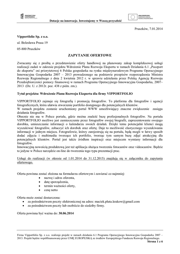 Dotacje na innowacje. Inwestujemy w Waszą przyszłość Pruszków, 7.01.2014 Vipportfolio Sp. z o.o. ul. Bolesława Prusa 19 05-800 Pruszków ZAPYTANIE OFERTOWE Zwracamy się z prośbą o przedstawienie oferty handlowej na planowany zakup kompleksowej usługi realizacji zadań w zakresie projektu Wdrożenie Planu Rozwoju Eksportu w ramach Działania 6.1 „Paszport do eksportu” osi priorytetowej 6 Polska gospodarka na rynku międzynarodowym Programu Operacyjnego Innowacyjna Gospodarka 2007 – 2013 prowadzonego na podstawie przepisów rozporządzenia Ministra Rozwoju Regionalnego z dnia 2 kwietnia 2012 r. w sprawie udzielania przez Polską Agencję Rozwoju Przedsiębiorczości pomocy finansowej w ramach Programu Operacyjnego Innowacyjna Gospodarka, 2007– 2013 (Dz. U. z 2012r. poz. 438 z późn. zm.). Tytuł projektu: Wdrożenie Planu Rozwoju Eksportu dla firmy VIPPORTFOLIO VIPPORTFOLIO zajmuje się fotografią i promocją fotografów. To platforma dla fotografów i agencji fotograficznych, która ułatwia stworzenie portfolio dostępnego dla potencjalnych klientów. W ramach projektu zostanie uruchomiony portal WWW umożliwiający znaczne zwiększenie zasięgu działania fotografów. Obecnie nie ma w Polsce portalu, gdzie można znaleźć bazę profesjonalnych fotografów. Na portalu VIPPORTFOLIO możliwe jest zamieszczenie przez fotografów swojej biografii, zaprezentowanie swojego dorobku, umieszczanie informacji o kalendarzu swoich działań. Dzięki temu potencjalni klienci mogą wyszukiwać fotografów, zobaczyć ich dorobek oraz ofertę. Daje to możliwość elastycznego wyszukiwania informacji w jednym miejscu. Fotografowie, którzy zarejestrują się na portalu, będą mogli w łatwy sposób dodać zdjęcia i multimedia tworzące ich portfolio, tworząc tym samym bazę zdjęć atrakcyjną dla potencjalnych klientów. Portal jest także źródłem inspiracji oraz miejscem wymiany informacji dla fotografów. Innowacyjną nowością produktową jest też aplikacja służąca tworzeniu fotocastów oraz videocastów. Będzie to jedyne w Polsce narzędzie on-line do tworzenia tego typu prezentacji prac. Usługi do realizacji (w okresie od 1.01.2014 do 31.12.2015) znajdują się w załączniku do zapytania ofertowego. Oferta powinna zostać złożona na formularzu ofertowym i zawierać co najmniej: · nazwę i adres oferenta, · datę sporządzenia, · termin ważności oferty, · cenę netto Oferta może zostać dostarczona: · za pośrednictwem poczty elektronicznej na adres: [email protected] · za pośrednictwem poczty lub osobiście do siedziby firmy. Oferta powinna być ważna do: 30.06.2014 Firma Vipportfolio Sp. z o.o. realizuje projekt w ramach działania 6.1 Programu Operacyjnego Innowacyjna Gospodarka 2007 – 2013. Projekt będzie współfinansowany przez UNIĘ EUROPEJSKĄ ze środków Europejskiego Funduszu Rozwoju Regionalnego. Strona 1 z 6 Dotacje na innowacje. Inwestujemy w Waszą przyszłość Zapytanie ofertowe zamieszczono również na stronie www oraz w siedzibie zamawiającego w miejscu publicznie dostępnym. Wszelkie zapytania odnośnie Oferty należy składać wyłącznie na adres: [email protected] Termin składania ofert upływa w dniu: 31.01.2014 Oferty dostarczone po wyżej określonym terminie nie będą rozpatrywane. Firma Vipportfolio Sp. z o.o. realizuje projekt w ramach działania 6.1 Programu Operacyjnego Innowacyjna Gospodarka 2007 – 2013. Projekt będzie współfinansowany przez UNIĘ EUROPEJSKĄ ze środków Europejskiego Funduszu Rozwoju Regionalnego. Strona 2 z 6 Dotacje na innowacje. Inwestujemy w Waszą przyszłość Kryteria wyboru najkorzystniejszej oferty: Lp. 1 Nazwa Cena całkowita Sposób oceny Porównanie cen oferentów do budżetu jaki jest przeznaczony na działanie. Maksymalna ilość punktów 100 100 Zamawiający zastrzega, że postępowanie przetargowe może zamknąć w przypadku wystąpienia istotnej zmiany okoliczności powodującej, że prowadzone postępowanie lub wykonanie zamówienia nie leży w interesie Zamawiającego a także to, że może wybrać do poszczególnych zadań najkorzystniejszych oferentów. Firma Vipportfolio Sp. z o.o. realizuje projekt w ramach działania 6.1 Programu Operacyjnego Innowacyjna Gospodarka 2007 – 2013. Projekt będzie współfinansowany przez UNIĘ EUROPEJSKĄ ze środków Europejskiego Funduszu Rozwoju Regionalnego. Strona 3 z 6 Dotacje na innowacje. Inwestujemy w Waszą przyszłość Załącznik ofertowy – 1 Działanie Wycena Organizacja i udział w misjach gospodarczych za granicą: Kompleksowa usługa polegająca na zorganizowaniu misji na rynek docelowy INDIE. Kompleksowa usługa polegająca na zorganizowaniu misji na rynek docelowy KANADA. Kompleksowa usługa polegająca na zorganizowaniu misji na rynek docelowy USA. Kompleksowa usługa polegająca na zorganizowaniu misji na rynek docelowy BRAZYLIA. Określenie potencjalnych partnerów handlowych, przygotowanie ofert współpracy oraz negocjacji handlowych na rynku INDIE. Usługę oszacowano na 80 roboczogodzin. Określenie potencjalnych partnerów handlowych, przygotowanie ofert współpracy oraz negocjacji handlowych na rynku KANADA. Usługę oszacowano na 80 roboczogodzin. Określenie potencjalnych partnerów handlowych, przygotowanie ofert współpracy oraz negocjacji handlowych na rynku USA. Usługę oszacowano na 80 roboczogodzin. Określenie potencjalnych partnerów handlowych, przygotowanie ofert współpracy oraz negocjacji handlowych na rynku BRAZYLIA. Usługę oszacowano na 80 roboczogodzin. Przygotowanie materiałów promocyjnych niezbędnych do: Organizacja i udział w misjach gospodarczych: INDIE, obejmować będzie: przygotowanie materiałów promocyjnych firmy wraz z niezbędnym tłumaczeniem. Materiały będą posiadać oznaczenia zgodnie z zaleceniami PARP informującymi o wsparciu ze środków UE. Przygotowanie materiałów promocyjnych niezbędnych do: Organizacja i udział w misjach gospodarczych: KANADA, obej
