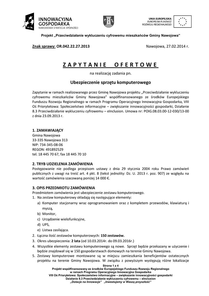 Projekt „Przeciwdziałanie wykluczeniu cyfrowemu mieszkańców Gminy Nawojowa” Znak sprawy: OR.042.22.27.2013 Nawojowa, 27.02.2014 r. ZAPYTANIE OFERTOWE na realizację zadania pn. Ubezpieczenie sprzętu komputerowego Zapytanie w ramach realizowanego przez Gminę Nawojowa projektu „Przeciwdziałanie wykluczeniu cyfrowemu mieszkańców Gminy Nawojowa” współfinansowanego ze środków Europejskiego Funduszu Rozwoju Regionalnego w ramach Programu Operacyjnego Innowacyjna Gospodarka, VIII Oś Priorytetowa: Społeczeństwo informacyjne – zwiększanie innowacyjności gospodarki, Działanie 8.3 Przeciwdziałanie wykluczeniu cyfrowemu – eInclusion. Umowa nr: POIG.08.03.00-12-030/13-00 z dnia 23.09.2013 r. 1. ZAMAWIAJĄCY Gmina Nawojowa 33-335 Nawojowa 313 NIP: 734-345-08-06 REGON: 491892529 tel. 18 445 70 67, fax 18 445 70 10 2. TRYB UDZIELENIA ZAMÓWIENIA Postępowanie nie podlega przepisom ustawy z dnia 29 stycznia 2004 roku Prawo zamówień publicznych z uwagi na treść art. 4 pkt. 8 (tekst jednolity: Dz. U. 2013 r. poz. 907) ze względu na wartość zamówienia szacowaną poniżej 14 000 €. 3. OPIS PRZEDMIOTU ZAMÓWIENIA Przedmiotem zamówienia jest ubezpieczenie zestawu komputerowego. 1. Na zestaw komputerowy składają się następujące elementy: a) Komputer stacjonarny wraz oprogramowaniem oraz z kompletem przewodów, klawiaturą i myszą, b) Monitor, c) Urządzenie wielofunkcyjne, d) UPS, e) Listwa zasilająca. 2. Łączna ilość zestawów komputerowych: 150 zestawów. 3. Okres ubezpieczenia: 2 lata (od 10.03.2014r. do 09.03.2016r.) 4. Wszystkie elementy zestawu komputerowego są nowe. Sprzęt będzie przekazany w użyczenie i będzie znajdował się w 150 gospodarstwach domowych na terenie Gminy Nawojowa. 5. Zestawy komputerowe montowane są w miejscu zamieszkania beneficjentów ostatecznych projektu na terenie Gminy Nawojowa. W związku z powyższym występują różne lokalizacje Strona 1 z 4 Projekt współfinansowany ze środków Europejskiego Funduszu Rozwoju Regionalnego w ramach Programu Operacyjnego Innowacyjna Gospodarka VIII Oś Priorytetowa: Społeczeństwo informacyjne – zwiększanie innowacyjności gospodarki Działanie 8.3 Przeciwdziałanie wykluczeniu cyfrowemu – eInclusion „Dotacje na Innowacje” „Inwestujemy w Waszą przyszłość” Projekt „Przeciwdziałanie wykluczeniu cyfrowemu mieszkańców Gminy Nawojowa” 6. 7. 8. 9. montażu oraz należy przyjąć, że sprzęt jest zlokalizowany w miejscach nie posiadających zabezpieczeń antywłamaniowych, monitoringu itp. Wartość jednostkowa zestawu wynosi: 3 493,00 zł (słownie: trzy tysiące czterysta dziewięćdziesiąt trzy złote 00/100). Wartość odtworzeniowa sprzętu: 3 493,00 zł x 150 = 523 950,00 zł Zakres ubezpieczenia – od wszystkich ryzyk (szkody materialne) w tym m.in.: działania użytkowników sprzętu (w szczególności niewłaściwe używanie, niedbalstwo) rabunku lub kradzieży z włamaniem, celowych uszkodzeń przez osoby trzecie, pośredniego uderzenia pioruna, przepięcia lub zjawiska indukcji, zalania spowodowanego naturalnymi wodami płynącymi, wodami gruntowymi, opadami, innymi czynnikami atmosferycznymi, wodą wodociągową, uderzenia pioruna, wybuchu lub upadku statku powietrznego, pożaru, osmalenia, przypalenia, działania sadzy, działania wysokiej temperatury, gaszenia pożaru, osuwisk skalnych, burzy, wiatru, gradu, lawiny, zapadania bądź usuwania się ziemi, Suma ubezpieczenia i wysokość odszkodowania: a) Sumę ubezpieczenia stanowi wartość odtworzeniowa sprzętu objętego ubezpieczeniem. b) Zamawiający nie przewiduje udziału własnego zmniejszającego kwotę przysługującego odszkodowania. 4. WYMAGANY TERMIN REALIZACJI ZAMÓWIENIA Okres ubezpieczenia wynosi 2 lata (od 10.03.2014r. do 09.03.2016r.). 5. OPIS SPOSOBU PRZYGOTOWANIA OFERTY Oferta powinna składać się z: 1) Wypełnionego i podpisanego „Formularza ofertowego” stanowiącego załącznik nr 1 do niniejszego zapytania, 2) Formularz ofertowy powinien być podpisany przez osoby uprawnione do występowania w imieniu Wykonawcy i opatrzony pieczęcią, 3) Oferta ma być napisana w języku polskim oraz czytelnie. 4) Każdy Wykonawca może przedłożyć wyłącznie jedną ofertę. Oferta Wykonawcy, który przedłoży więcej niż jedną ofertę, zostanie odrzucona, 5) Nie dopuszcza się realizacji częściowej – oferta ma obejmować całość zamówienia. 6. KRYTERIUM WYBORU OFERTY – WAGA (%) Cena – 100%. 7. MIEJSCE ORAZ TERMIN SKŁADANIA OFERT 1) Ofertę można złożyć w jeden z następujących sposobów: przesłać pocztą na adres: Gmina Nawojowa, 33-335 Nawojowa 313, dostarczyć osobiście do siedziby Zamawiającego. 2) Ofertę należy dostarczyć do dnia 06 marca 2014 r. do godz. 10:00 (decyduje data i godzina wpływu). Ofertę należy opatrzyć dopiskiem: „Ubezpieczenie sprzętu komputerowego”. Strona 2 z 4 Projekt współfinansowany ze środków Europejskiego Funduszu Rozwoju Regionalnego w ramach Programu Operacyjnego Innowacyjna Gospodarka VIII Oś Priorytetowa: Społeczeństwo informacyjne – zwiększanie innowacyjności gospodarki Działanie 8.3 Przeciwdziałanie wykluczeniu cyfrowemu – eInclusion „Dotacje na Innowacje” „Inwestujemy w Waszą przyszłość” Projekt „Przeciwdziałanie wykluczeniu cyfrowemu mieszkańców Gminy Nawojowa” 3) Oferty złożone po terminie nie będą rozpatrywane. 4) W toku badania i oceny ofert Zamawiający może żądać od oferentów wyjaśnień dotyczących treści złożonych ofert. 5) Dodatkowych informacji udzielają: Paweł Kupczak oraz Jacek Boruch pod numerem telefonu 18 449 27 54 lub 533 635 471 oraz adresem e-mail: [email protected]. Strona 3 z 4 Projekt współfinansowany ze środków Europejskiego Funduszu Rozwoju Regionalnego w ramach Programu Operacyjnego Innowacyjna Gospodarka VIII Oś Priorytetowa: Społeczeństwo informacyjne – zwiększanie innowacyjności gospodarki Działanie 8.3 Przeciwdziałanie wyklucze