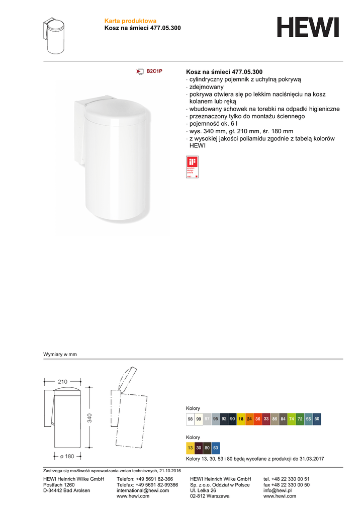 Karta produktowa Kosz na śmieci 477.05.300 B2C1P Kosz na śmieci 477.05.300 ⋅ cylindryczny pojemnik z uchylną pokrywą ⋅ zdejmowany ⋅ pokrywa otwiera się po lekkim naciśnięciu na kosz kolanem lub ręką ⋅ wbudowany schowek na torebki na odpadki higieniczne ⋅ przeznaczony tylko do montażu ściennego ⋅ pojemność ok. 6 l ⋅ wys. 340 mm, gł. 210 mm, śr. 180 mm ⋅ z wysokiej jakości poliamidu zgodnie z tabelą kolorów HEWI Wymiary w mm Kolory 98 99 97 95 92 90 33 50 Kolory 13 30 80 53 Kolory 13, 30, 53 i 80 będą wycofane z produkcji do 31.03.2017 Zastrzega się możliwość wprowadzania zmian technicznych, 21.10.2016 HEWI Heinrich Wilke GmbH Postfach 1260 D-34442 Bad Arolsen Telefon: +49 5691 82-366 Telefax: +49 5691 82-99366 [email protected] www.hewi.com HEWI Heinrich Wilke GmbH Sp. z o.o. Oddział w Polsce Ul. Lelka 26 02-812 Warszawa tel. +48 22 330 00 51 fax +48 22 330 00 50 [email protected] www.hewi.com