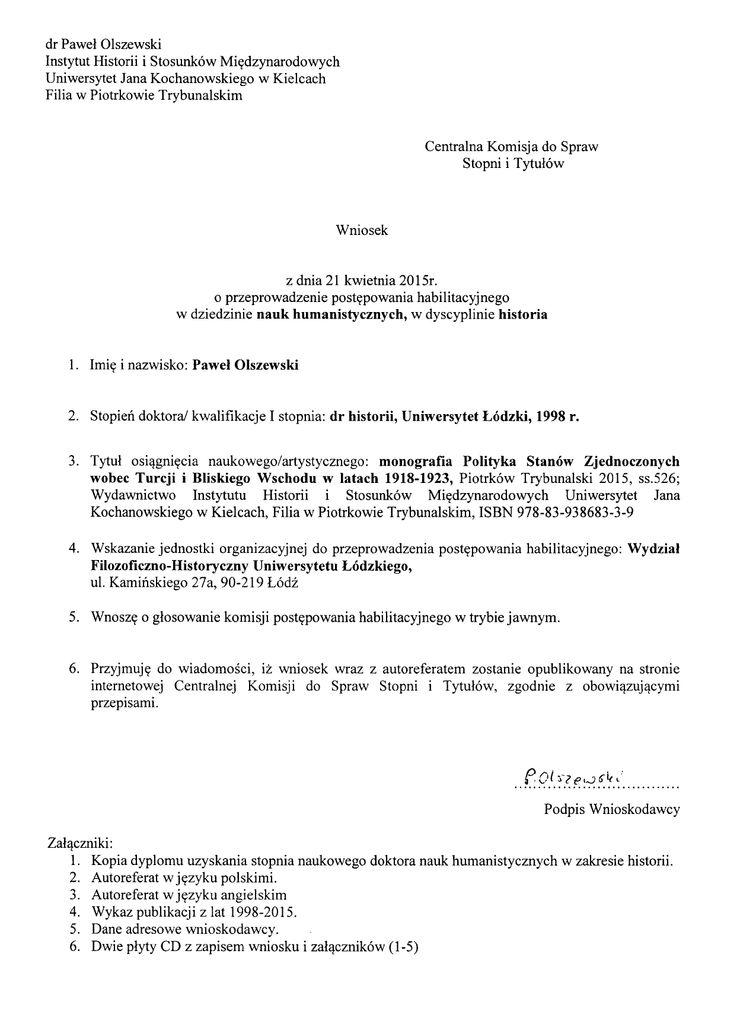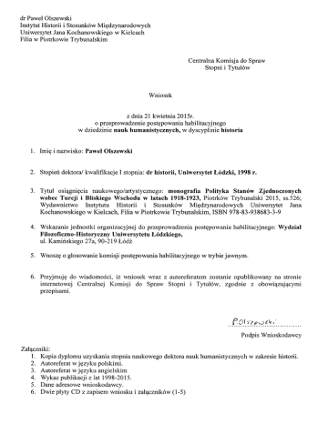 dr Pawel Olszewski Instytut Historii i Stosunkow Mi^dzynarodowych Uniwersytet Jana Kochanowskiego w Kielcach Filia w Piotrkowie Trybunalskim Centralna Komisja do Spraw Stopni i Tj^ulow Wniosek z dnia 21 kwietnia 2015r. 0 przeprowadzenie postepowania habilitacyjnego w dziedzinie nauk humanistycznych, w dyscyplinie historia 1. Imi^ i nazwisko: Pawel Olszewski 2. Stopien doktora/ kwalifikacje I stopnia: dr historii, Uniwersytet Lodzki, 1998 r. 3. Tytul osi^gni^cia naukowego/artystycznego: monografla Polityka Stanow Zjednoczonych wobec Turcji i Bliskiego Wschodu w latach 1918-1923, Piotrkow Trybunalski 2015, ss.526; Wydawnictwo Instytutu Historii i Stosunkow Mi^dzynarodowych Uniwersytet Jana Kochanowskiego w Kielcach, Fiha w Piotrkowie Trybunalskim, ISBN 978-83-938683-3-9 4. Wskazanie jednostki organizacyjnej do przeprowadzenia postepowania habilitacyjnego: Wydzial Filozoficzno-Historyczny Uniwersytetu Lodzkiego, ul. Kamihskiego 27a, 90-219 Lodz 5. Wnosz? o glosowanie komisji postepowania habilitacyjnego w trybie jawnym. 6. Przyjmuje do wiadomosci, iz wniosek wraz z autoreferatem zostanie opublikowany na stronie internetowej Centralnej Komisji do Spraw Stopni i Tytulow, zgodnie z obowi^zuj^cymi przepisami. Podpis Wnioskodawcy Zal^czniki: 1. Kopia dyplomu uzyskania stopnia naukowego doktora nauk humanistycznych w zakresie historii. 2. Autoreferat wj^zyku polskimi. 3. Autoreferat wj^zyku angielskim 4. Wykaz publikacji z lat 1998-2015. 5. Dane adresowe wnioskodawcy. 6. Dwie plyty CD z zapisem wniosku i zal^cznikow (1-5)