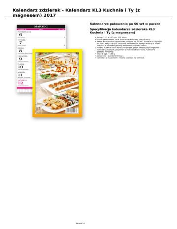 Kalendarz zdzierak - Kalendarz KL3 Kuchnia i Ty (z magnesem) 2017 Kalendarze pakowania po 50 szt w paczce Specyfikacja kalendarza zdzieraka KL3 Kuchnia i Ty (z magnesem) format 13,5 x 20,5 cm, 112 stron; okładka kredowana, druk środka dwukolorowy, dwustronny; awers: kalendarium tygodniowe, miejsce na notatki, numeracja tygodni i dni roku, fazy Księżyca, skrócone kalendarium danego miesiąca, znaki zodiaku, w niedziele godziny wschodu i zachodu Słońca; rewers: kuchnia na co dzień i od święta, groch z fasolą czyli bogactwo roślin strączkowych, przysmaki z różnych stron świata, kuchenne gadżety, horoskop; waga 1 egz. – 132 g; pakowane – standard 50 egz.; kalendarz z magnesem - można zawiesić na lodówce. Strona 1/1 Powered by TCPDF (www.tcpdf.org)