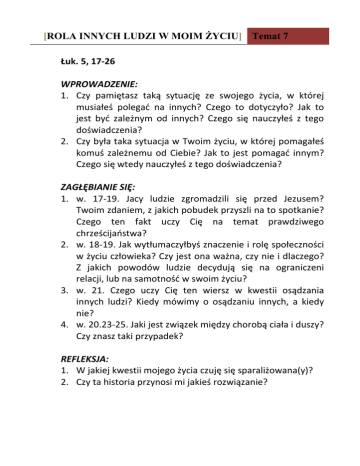 [ROLA INNYCH LUDZI W MOIM ŻYCIU] Temat 7 Łuk. 5, 17-26 WPROWADZENIE: 1. Czy pamiętasz taką sytuację ze swojego życia, w której musiałeś polegać na innych? Czego to dotyczyło? Jak to jest być zależnym od innych? Czego się nauczyłeś z tego doświadczenia? 2. Czy była taka sytuacja w Twoim życiu, w której pomagałeś komuś zależnemu od Ciebie? Jak to jest pomagać innym? Czego się wtedy nauczyłeś z tego doświadczenia? ZAGŁĘBIANIE SIĘ: 1. w. 17-19. Jacy ludzie zgromadzili się przed Jezusem? Twoim zdaniem, z jakich pobudek przyszli na to spotkanie? Czego ten fakt uczy Cię na temat prawdziwego chrześcijaństwa? 2. w. 18-19. Jak wytłumaczyłbyś znaczenie i rolę społeczności w życiu człowieka? Czy jest ona ważna, czy nie i dlaczego? Z jakich powodów ludzie decydują się na ograniczeni relacji, lub na samotność w swoim życiu? 3. w. 21. Czego uczy Cię ten wiersz w kwestii osądzania innych ludzi? Kiedy mówimy o osądzaniu innych, a kiedy nie? 4. w. 20.23-25. Jaki jest związek między chorobą ciała i duszy? Czy znasz taki przypadek? REFLEKSJA: 1. W jakiej kwestii mojego życia czuję się sparaliżowana(y)? 2. Czy ta historia przynosi mi jakieś rozwiązanie?
