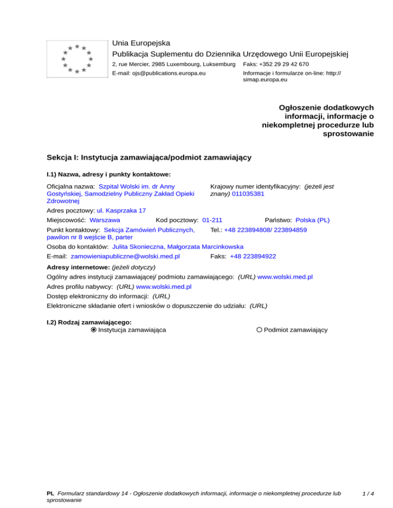 Unia Europejska Publikacja Suplementu do Dziennika Urzędowego Unii Europejskiej 2, rue Mercier, 2985 Luxembourg, Luksemburg Faks: +352 29 29 42 670 E-mail: [email protected] Informacje i formularze on-line: http:// simap.europa.eu Ogłoszenie dodatkowych informacji, informacje o niekompletnej procedurze lub sprostowanie Sekcja I: Instytucja zamawiająca/podmiot zamawiający I.1) Nazwa, adresy i punkty kontaktowe: Oficjalna nazwa: Szpital Wolski im. dr Anny Gostyńskiej, Samodzielny Publiczny Zakład Opieki Zdrowotnej Krajowy numer identyfikacyjny: (jeżeli jest znany) 011035381 Adres pocztowy: ul. Kasprzaka 17 Miejscowość: Warszawa Kod pocztowy: 01-211 Punkt kontaktowy: Sekcja Zamówień Publicznych, pawilon nr 8 wejście B, parter Państwo: Polska (PL) Tel.: +48 223894808/ 223894859 Osoba do kontaktów: Julita Skonieczna, Małgorzata Marcinkowska E-mail: [email protected] Faks: +48 223894922 Adresy internetowe: (jeżeli dotyczy) Ogólny adres instytucji zamawiającej/ podmiotu zamawiającego: (URL) www.wolski.med.pl Adres profilu nabywcy: (URL) www.wolski.med.pl Dostęp elektroniczny do informacji: (URL) _____ Elektroniczne składanie ofert i wniosków o dopuszczenie do udziału: (URL) _____ I.2) Rodzaj zamawiającego: Instytucja zamawiająca Podmiot zamawiający PL Formularz standardowy 14 - Ogłoszenie dodatkowych informacji, informacje o niekompletnej procedurze lub sprostowanie 1/4 Sekcja II: Przedmiot zamówienia II.1.1) Nazwa nadana zamówieniu: Dostawa angiograficznego aparatu rtg ramię C - sprawa nr EP/44/2016 II.1.2) Krótki opis zamówienia lub zakupu: (podano w pierwotnym ogłoszeniu) 1. Przedmiotem zamówienia jest dostawa angiograficznego aparatu rtg ramię C obejmująca dostawę stacjonarnego angiografu kardiologicznego z zawieszeniem sufitowym, stacjonarnym stołem z pływającym blatem, podwójnym systemem sterowania na sali zabiegowej i w sterowni, płaskim wzmacniaczem obrazu, stacją hemodynamiczną, systemem UPS, oprogramowaniem redukującym dawkę promieniowania oraz polepszającym widoczność stentów z dodatkowym wyposażeniem i akcesoriami. 2. Wspólny Słownik Zamówień: 33111720-4 - Urządzenia do angiografii 3. Zamawiający nie dopuszcza składania ofert częściowych. Oferty niezawierające pełnego zakresu przedmiotu zamówienia zostaną odrzucone. 4. Zestawienie parametrów granicznych stanowi Załącznik nr 8 do SIWZ. Należy go wypełnić wpisując odpowiedź tak lub nie lub oferowany parametr. 5. Zamawiający nie dopuszcza składania ofert wariantowych. 6. Miejsce realizacji: siedziba Szpitala Wolskiego. II.1.3) Wspólny Słownik Zamówień (CPV) Główny przedmiot Słownik główny 33111720 Słownik uzupełniający (jeżeli dotyczy) PL Formularz standardowy 14 - Ogłoszenie dodatkowych informacji, informacje o niekompletnej procedurze lub sprostowanie 2/4 Sekcja IV: Procedura IV.1)Rodzaj procedury (podano w pierwotnym ogłoszeniu) Otwarta Ograniczona Ograniczona przyspieszona Negocjacyjna Negocjacyjna przyspieszona Dialog konkurencyjny Negocjacyjna z uprzednim ogłoszeniem Negocjacyjna bez uprzedniego ogłoszenia Negocjacyjna z publikacją ogłoszenia o zamówieniu Negocjacyjna bez publikacji ogłoszenia o zamówieniu Udzielenie zamówienia bez uprzedniej publikacji ogłoszenia o zamówieniu w Dzienniku Urzędowym Unii Europejskiej IV.2)Informacje administracyjne IV.2.1)Numer referencyjny: (podano w pierwotnym ogłoszeniu) EP/44/2016 IV.2.2)Dane referencyjne ogłoszenia w przypadku ogłoszeń przesłanych drogą elektroniczną: Pierwotne ogłoszenie przesłane przez eNotices TED eSender Login: ENOTICES_zam5 Dane referencyjne ogłoszenia: 2016-078135 rok i numer dokumentu IV.2.3)Ogłoszenie, którego dotyczy niniejsza publikacja: Numer ogłoszenia w Dz.U.: _____ z dnia: ______ (dd/mm/rrrr) IV.2.4)Data wysłania pierwotnego ogłoszenia: 20/06/2016 (dd/mm/rrrr) PL Formularz standardowy 14 - Ogłoszenie dodatkowych informacji, informacje o niekompletnej procedurze lub sprostowanie 3/4 Sekcja VI: Informacje uzupełniające VI.1) Ogłoszenie dotyczy: Procedury niepełnej Sprostowania Informacji dodatkowych VI.2) Informacje na temat niepełnej procedury udzielenia zamówienia: Postępowanie o udzielenie zamówienia zostało przerwane Postępowanie o udzielenie zamówienia uznano za nieskuteczne Zamówienia nie udzielono Zamówienie może być przedmiotem ponownej publikacji VI.3) Informacje do poprawienia lub dodania : VI.3.1) Zmiana oryginalnej informacji podanej przez instytucję zamawiającą Publikacja w witrynie TED niezgodna z oryginalną informacją, przekazaną przez instytucję zamawiającą Oba przypadki VI.3.2) W ogłoszeniu pierwotnym W odpowiedniej dokumentacji przetargowej (więcej informacji w odpowiedniej dokumentacji przetargowej) W obu przypadkach (więcej informacji w odpowiedniej dokumentacji przetargowej) VI.3.3) Tekst, który należy poprawić w pierwotnym ogłoszeniu Miejsce, w którym znajduje się Zamiast: zmieniany tekst: VI.3.4) Daty, które należy poprawić w pierwotnym ogłoszeniu Miejsce, w którym znajdują się Zamiast: zmieniane daty: 25/07/2016 Godzina: 12:00 IV.3.4) Termin składania ofert lub (dd/mm/rrrr) wniosków o dopuszczenie do udziału w postępowaniu: Miejsce, w którym znajdują się zmieniane daty: IV.3.8) Warunki otwarcia ofert: Zamiast: 25/07/2016 Godzina: 12:30 (dd/mm/rrrr) Powinno być: Powinno być: 01/08/2016 Godzina: 12:00 (dd/mm/rrrr) Powinno być: 01/08/2016 Godzina: 12:30 (dd/mm/rrrr) VI.3.5) Adresy i punkty kontaktowe, które należy poprawić VI.3.6) Tekst, który należy dodać do pierwotnego ogłoszenia Miejsce, w którym należy dodać tekst: Tekst do dodania: VI.4) Inne dodatkowe informacje: _____ VI.5) Data wysłania niniejszego ogłoszenia: 21/06/2016 (dd/mm/rrrr) - ID:2016-078569 PL Formularz standardowy 14 - Ogłoszenie dodatkowych informacji, informacje o niekompletnej procedurze lub sprostowanie 4/4