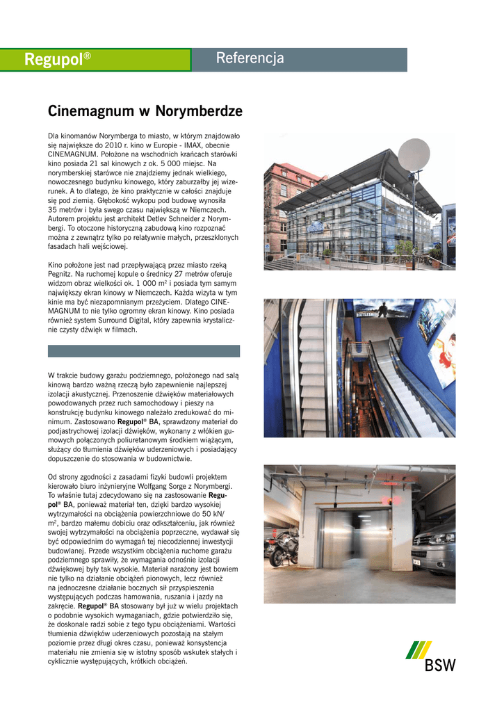 Regupol® Referencja Cinemagnum w Norymberdze Dla kinomanów Norymberga to miasto, w którym znajdowało się największe do 2010 r. kino w Europie - IMAX, obecnie CINEMAGNUM. Położone na wschodnich krańcach starówki kino posiada 21 sal kinowych z ok. 5 000 miejsc. Na norymberskiej starówce nie znajdziemy jednak wielkiego, nowoczesnego budynku kinowego, który zaburzałby jej wizerunek. A to dlatego, że kino praktycznie w całości znajduje się pod ziemią. Głębokość wykopu pod budowę wynosiła 35 metrów i była swego czasu największą w Niemczech. Autorem projektu jest architekt Detlev Schneider z Norymbergi. To otoczone historyczną zabudową kino rozpoznać można z zewnątrz tylko po relatywnie małych, przeszklonych fasadach hali wejściowej. Kino położone jest nad przepływającą przez miasto rzeką Pegnitz. Na ruchomej kopule o średnicy 27 metrów oferuje widzom obraz wielkości ok. 1 000 m2 i posiada tym samym największy ekran kinowy w Niemczech. Każda wizyta w tym kinie ma być niezapomnianym przeżyciem. Dlatego CINEMAGNUM to nie tylko ogromny ekran kinowy. Kino posiada również system Surround Digital, który zapewnia krystalicznie czysty dźwięk w filmach. W trakcie budowy garażu podziemnego, położonego nad salą kinową bardzo ważną rzeczą było zapewnienie najlepszej izolacji akustycznej. Przenoszenie dźwięków materiałowych powodowanych przez ruch samochodowy i pieszy na konstrukcję budynku kinowego należało zredukować do minimum. Zastosowano Regupol® BA, sprawdzony materiał do podjastrychowej izolacji dźwięków, wykonany z włókien gumowych połączonych poliuretanowym środkiem wiążącym, służący do tłumienia dźwięków uderzeniowych i posiadający dopuszczenie do stosowania w budownictwie. Od strony zgodności z zasadami fizyki budowli projektem kierowało biuro inżynieryjne Wolfgang Sorge z Norymbergi. To właśnie tutaj zdecydowano się na zastosowanie Regupol® BA, ponieważ materiał ten, dzięki bardzo wysokiej wytrzymałości na obciążenia powierzchniowe do 50 kN/ m2, bardzo małemu dobiciu oraz odkształceniu, jak również swojej wytrzymałości na obciążenia poprzeczne, wydawał się być odpowiednim do wymagań tej niecodziennej inwestycji budowlanej. Przede wszystkim obciążenia ruchome garażu podziemnego sprawiły, że wymagania odnośnie izolacji dźwiękowej były tak wysokie. Materiał narażony jest bowiem nie tylko na działanie obciążeń pionowych, lecz również na jednoczesne działanie bocznych sił przyspieszenia występujących podczas hamowania, ruszania i jazdy na zakręcie. Regupol® BA stosowany był już w wielu projektach o podobnie wysokich wymaganiach, gdzie potwierdziło się, że doskonale radzi sobie z tego typu obciążeniami. Wartości tłumienia dźwięków uderzeniowych pozostają na stałym poziomie przez długi okres czasu, ponieważ konsystencja materiału nie zmienia się w istotny sposób wskutek stałych i cyklicznie występujących, krótkich obciążeń. Regupol® Referencja W tych ekstremalnych warunkach, jakimi jest interwałowo używany garaż podziemny, znajdujący się nad salami kinowymi, które muszą spełniać wysokie wymagania akustyczne, tłumienie dźwięków uderzeniowych funkcjonuje prawidłowo do dzisiaj. Stabilna pozostaje również podłoga powierzchni garażowej pokryta elastycznym materiałem izolacyjnym. Inwestycja zakończona została w 2001 r. Produkt BSW Podjastrychowa mata tłumiąca Regupol® BA • włókna gumowe połączone poliuretanowym środkiem wiążącym - mata dostępna w rolach • wymiary 10.000 x 1.250 x 17 mm • odporność termiczna od -20 °C do +80 °C • współczynnik poprawy tłumienia dźwięków 26 dB • ściśliwość 2,0 mm • maks. obciążenie komunikacyjne do 5.000 kg/m2 • klasa odporności ogniowej B 2 / klasa E www.bswwibroakustyka. pl Kontakt: BSW Polska • [email protected] • materiały do pobrania na stronie www.bsw-wibroakustyka.pl Online Version March 2013 Dalsze referencje znajdują się na naszej stronie internetowej