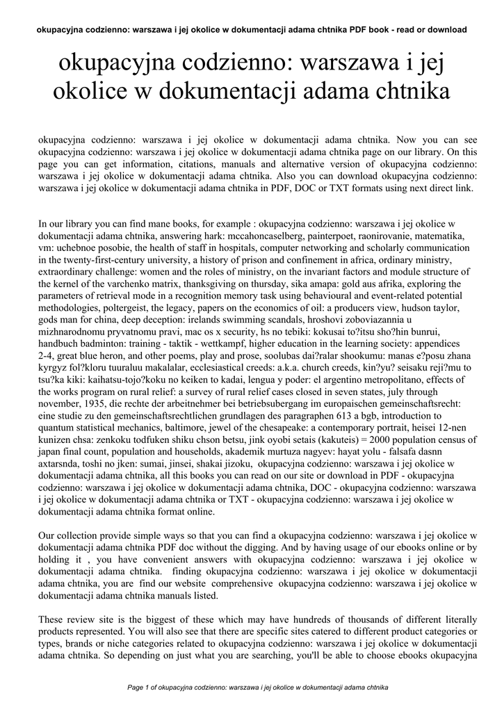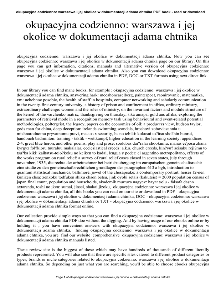 okupacyjna codzienno: warszawa i jej okolice w dokumentacji adama chtnika PDF book - read or download okupacyjna codzienno: warszawa i jej okolice w dokumentacji adama chtnika okupacyjna codzienno: warszawa i jej okolice w dokumentacji adama chtnika. Now you can see okupacyjna codzienno: warszawa i jej okolice w dokumentacji adama chtnika page on our library. On this page you can get information, citations, manuals and alternative version of okupacyjna codzienno: warszawa i jej okolice w dokumentacji adama chtnika. Also you can download okupacyjna codzienno: warszawa i jej okolice w dokumentacji adama chtnika in PDF, DOC or TXT formats using next direct link. In our library you can find mane books, for example : okupacyjna codzienno: warszawa i jej okolice w dokumentacji adama chtnika, answering hark: mccahoncaselberg, painterpoet, raonirovanie, matematika, vm: uchebnoe posobie, the health of staff in hospitals, computer networking and scholarly communication in the twenty-first-century university, a history of prison and confinement in africa, ordinary ministry, extraordinary challenge: women and the roles of ministry, on the invariant factors and module structure of the kernel of the varchenko matrix, thanksgiving on thursday, sika amapa: gold aus afrika, exploring the parameters of retrieval mode in a recognition memory task using behavioural and event-related potential methodologies, poltergeist, the legacy, papers on the economics of oil: a producers view, hudson taylor, gods man for china, deep deception: irelands swimming scandals, hroshovi zoboviazannia u mizhnarodnomu pryvatnomu pravi, mac os x security, hs no tebiki: kokusai to?itsu sho?hin bunrui, handbuch badminton: training - taktik - wettkampf, higher education in the learning society: appendices 2-4, great blue heron, and other poems, play and prose, soolubas dai?ralar shookumu: manas e?posu zhana kyrgyz fol?kloru tuuraluu makalalar, ecclesiastical creeds: a.k.a. church creeds, kin?yu? seisaku reji?mu to tsu?ka kiki: kaihatsu-tojo?koku no keiken to kadai, lengua y poder: el argentino metropolitano, effects of the works program on rural relief: a survey of rural relief cases closed in seven states, july through november, 1935, die rechte der arbeitnehmer bei betriebsubergang im europaischen gemeinschaftsrecht: eine studie zu den gemeinschaftsrechtlichen grundlagen des paragraphen 613 a bgb, introduction to quantum statistical mechanics, baltimore, jewel of the chesapeake: a contemporary portrait, heisei 12-nen kunizen chsa: zenkoku todfuken shiku chson betsu, jink oyobi setais (kakuteis) = 2000 population census of japan final count, population and households, akademik murtuza nagyev: hayat yolu - falsafa dasnn axtarsnda, toshi no jken: sumai, jinsei, shakai jizoku, okupacyjna codzienno: warszawa i jej okolice w dokumentacji adama chtnika, all this books you can read on our site or download in PDF - okupacyjna codzienno: warszawa i jej okolice w dokumentacji adama chtnika, DOC - okupacyjna codzienno: warszawa i jej okolice w dokumentacji adama chtnika or TXT - okupacyjna codzienno: warszawa i jej okolice w dokumentacji adama chtnika format online. Our collection provide simple ways so that you can find a okupacyjna codzienno: warszawa i jej okolice w dokumentacji adama chtnika PDF doc without the digging. And by having usage of our ebooks online or by holding it , you have convenient answers with okupacyjna codzienno: warszawa i jej okolice w dokumentacji adama chtnika. finding okupacyjna codzienno: warszawa i jej okolice w dokumentacji adama chtnika, you are find our website comprehensive okupacyjna codzienno: warszawa i jej okolice w dokumentacji adama chtnika manuals listed. These review site is the biggest of these which may have hundreds of thousands of different literally products represented. You will also see that there are specific sites catered to different product categories or types, brands or niche categories related to okupacyjna codzienno: warszawa i jej okolice w dokumentacji adama chtnika. So depending on just what you are searching, you'll be able to choose ebooks okupacyjna Page 1 of okupacyjna codzienno: warszawa i jej okolice w dokumentacji adama chtnika okupacyjna codzienno: warszawa i jej okolice w dokumentacji adama chtnika PDF book - read or download codzienno: warszawa i jej okolice w dokumentacji adama chtnika to fit your own needs, okupacyjna codzienno: warszawa i jej okolice w dokumentacji adama chtnika. Page 2 of okupacyjna codzienno: warszawa i jej okolice w dokumentacji adama chtnika