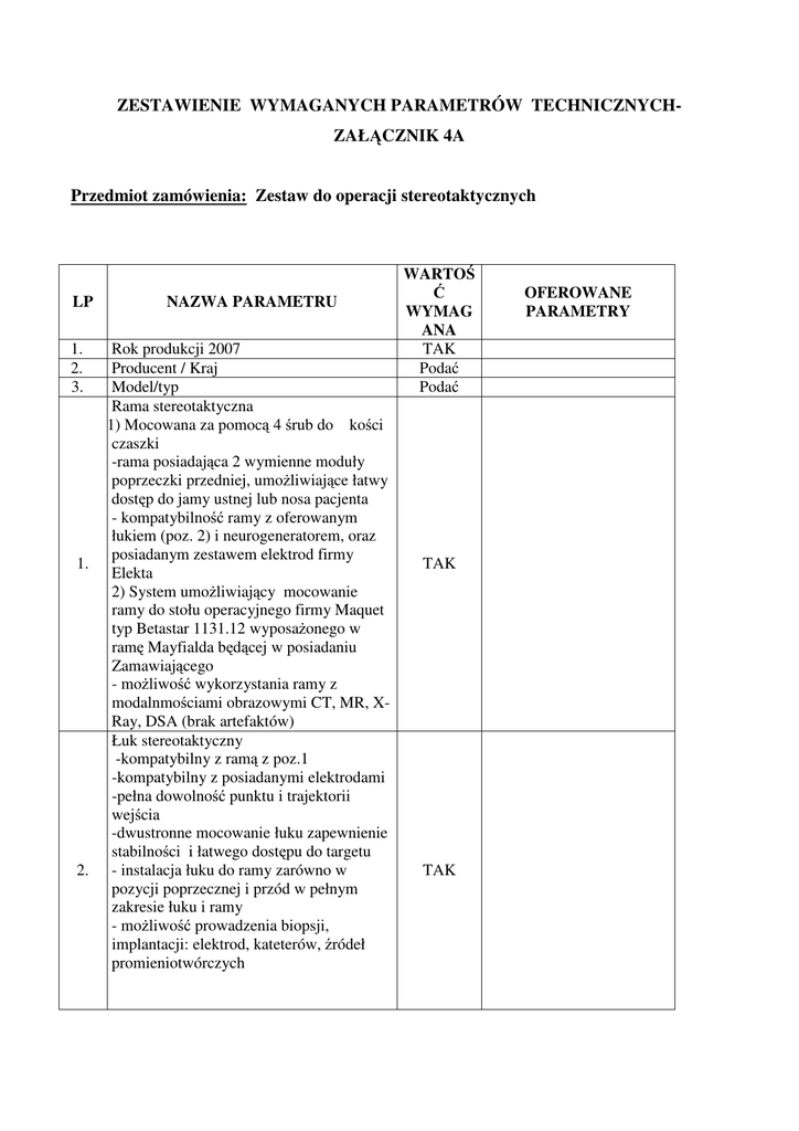ZESTAWIENIE WYMAGANYCH PARAMETRÓW TECHNICZNYCHZAŁĄCZNIK 4A Przedmiot zamówienia: Zestaw do operacji stereotaktycznych LP 1. 2. 3. 1. 2. NAZWA PARAMETRU Rok produkcji 2007 Producent / Kraj Model/typ Rama stereotaktyczna 1) Mocowana za pomocą 4 śrub do kości czaszki -rama posiadająca 2 wymienne moduły poprzeczki przedniej, umożliwiające łatwy dostęp do jamy ustnej lub nosa pacjenta - kompatybilność ramy z oferowanym łukiem (poz. 2) i neurogeneratorem, oraz posiadanym zestawem elektrod firmy Elekta 2) System umożliwiający mocowanie ramy do stołu operacyjnego firmy Maquet typ Betastar 1131.12 wyposażonego w ramę Mayfialda będącej w posiadaniu Zamawiającego - możliwość wykorzystania ramy z modalnmościami obrazowymi CT, MR, XRay, DSA (brak artefaktów) Łuk stereotaktyczny -kompatybilny z ramą z poz.1 -kompatybilny z posiadanymi elektrodami -pełna dowolność punktu i trajektorii wejścia -dwustronne mocowanie łuku zapewnienie stabilności i łatwego dostępu do targetu - instalacja łuku do ramy zarówno w pozycji poprzecznej i przód w pełnym zakresie łuku i ramy - możliwość prowadzenia biopsji, implantacji: elektrod, kateterów, źródeł promieniotwórczych WARTOŚ Ć WYMAG ANA TAK Podać Podać TAK TAK OFEROWANE PARAMETRY 3. 4. 5. 6. 7. 8. 9 10 Zestaw do lokalizacji CT/CT indicato/, kompatybilny ze stosowanym aparatem CT, wraz z regulowanym uchwytem mocującym do stołu CT Zamawiający posiada aparat firmy GE Medical System Polska nr.CTLS8 ULTRA Neurogenerator: - wpełni kompatybilny z wykorzystywanym zestawem elektrod - możliwość wykonywania zabiegów: termolezji, stymulacji, pomiar impedancji - zdalne sterowanie w procesie stymulacji -ciągły monitoring impedancji -automatyczna kontrola temperatury w procesie termolezji - możliwość stosowania elektrody jednobiegunowej, dwubiegunowej lub dwóch elektrod jednobiegunowych w trybie dwukanałowym Śruby tytanowe 45 i 65mm po 2 szt. Kompatybilne z ramą stereotaktyczną z poz. 1 Uchwyt stereo Kompatybilny z poz. 1,3,4,5 CT Adapter kompatybilny z Tomografem Komputerowym firmy GE Medical System Polska nr.CTLS8 ULTRA będącym w posiadaniu Zamawiającego i poz. 1,2,3,4,5,6. CT table fixation kompatybilny z Tomografem Komputerowym firmy GE Medical System Polska nr.CTLS8 ULTRA będącym w posiadaniu Zamawiającego i poz. 1,2,3,4,5,6. Okres zagwarantowania dostępności części zamiennych i materiałów zużywalnych od daty sprzedaży Bezpłatny przegląd konserwacyjny sprzętu przed upływem okresu gwarancji TAK TAK TAK TAK TAK TAK Min. 5 lat Podać TAK 11 Czas reakcji serwisu po zgłoszeniu awarii aparatu Do 24 godz. Podać 12 Instrukcja obsługi aparatu w języku polskim TAK Oświadczamy, że oferowane, powyżej wyspecyfikowane urządzenie jest kompletne i po zainstalowaniu i uruchomieniu będzie gotowe do pracy zgodnie z przeznaczeniem bez dodatkowych zakupów inwestycyjnych, z wyłączeniem materiałów eksploatacyjnych. Oświadczamy, że oferowane urządzanie, oprócz spełnienia odpowiednich parametrów funkcjonalnych, gwarantuje bezpieczeństwo pacjentów i personelu medycznego oraz zapewnia wymagany poziom usług medycznych …………………dn…………….. ………………………………… Podpis przedstawiciela Wykonawcy
