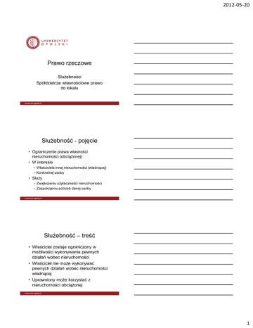 2012-05-20 Prawo rzeczowe Służebności Spółdzielcze własnościowe prawo do lokalu Służebność - pojęcie • Ograniczenie prawa własności nieruchomości (obciążonej) • W interesie – Właściciela innej nieruchomości (władnącej) – Konkretnej osoby • Służy – Zwiększeniu użyteczności nieruchomości – Zaspokojeniu potrzeb danej osoby Służebność – treść • Właściciel zostaje ograniczony w możliwości wykonywania pewnych działań wobec nieruchomości • Właściciel nie może wykonywać pewnych działań wobec nieruchomości władnącej • Uprawniony może korzystać z nieruchomości obciążonej 1 2012-05-20 Klasyfikacja • Czynne i bierne • Osobiste i gruntowe • Przykłady – Droga konieczna – Służebność przesyłu – Służebność widoku – Służebność muru – Służebność płotu Służebność gruntowa • Obciąża nieruchomość na rzecz właściciela innej nieruchomości (władnącej) • Stanowi część składową nieruchomości • Prawo związane z własnością nieruchomości. Ustanowienie służebności • Umowa – Forma aktu notarialnego – Wpis do KW deklaratoryjny – Względna swoboda kształtowania treści • Zasiedzenie – Posiadanie służebności – Upływ czasu – Korzystanie z trwałego i widocznego urządzenia 2 2012-05-20 Ustanowienie służebności II • Orzeczenie sądowe – – – – Droga konieczna Nieumyślne przekroczenie granic Zniesienie współwłasności Służebność przesyłu • Decyzja administracyjna – Decyzja wywłaszczeniowa – Możliwe wywłaszczenie i ustanowienie służebności Treść i wykonywanie • • • • Umowa lub orzeczenie Zasady współżycia społecznego Zwyczaje miejscowe Utrzymywanie urządzeń – właściciel nieruchomości władnącej • Podział nieruchomości – służebność utrzymuje się (zasadniczo) na wszystkich częściach Zmiana treści i wygaśnięcie • Zmiana treści – Umowa – Orzeczenie sądu • Wygaśnięcie – – – – – Zrzeczenie Konfuzja Niewykonywanie przez lat 10 Orzeczenie sądu Decyzja administracyjna 3 2012-05-20 Służebność osobista • • • • Obciąża nieruchomość Na rzecz osoby fizycznej Zaspakaja jej potrzeby Odpowiednie stosowanie przepisów o służebnościach gruntowych – Treść: potrzeby osobiste uprawnionego – Wygasa ze śmiercią uprawnionego (zasada) – Niezbywalność Służebność mieszkania • • • • Prawo do zamieszkiwania w budynku Związane zwykle z dożywociem Prawo przyjęcia domowników Prawo korzystania z pomieszczeń wspólnych • Relacje między uprawnionym a właścicielem jak przy użytkowaniu Służebność przesyłu • Ustanawiana na rzecz przedsiębiorcy przesyłowego • Daje prawo korzystania z urządzeń przesyłowych – Budowy – Eksploatacji • Ustanawiana umową lub orzeczeniem sądu 4 2012-05-20 Służebność przesyłu II • Zbywalna na rzecz konkretnych podmiotów • Wygasa z chwilą likwidacji przedsiębiorcy • Po wygaśnięciu urządzenia mają być zlikwidowane alternatywnie przedsiębiorca płaci odszkodowanie • Wzmianka – projekt służebności wyciągu Spółdzielnie mieszkaniowe • Korporacyjne osoby prawne • Cele budowlane • Obecnie – zasadniczo klasyczne spółdzielnie „urzędnicze” • Spółdzielcze własnościowe prawo do lokalu – kategoria wygasająca Spółdzielcze prawo do lokalu • • • • Ograniczone prawo rzeczowe Obciąża nieruchomość spółdzielczą Daje prawo do używania lokalu Prawo – Zbywalne – Dziedziczne – Podlegające egzekucji 5 2012-05-20 Wygaśnięcie prawa Prawo lokatorskie • Wygaśnięcie prawa – Zrzeczenie się prawa – Konfuzja (rzadko) • Lokatorskie prawo do lokalu – Niezbywalne – Niedziedziczne – Może przekształcić się w • najem • Odrębną własność lokalu Przekształcenia • Prawo własnościowe można przekształcić w odrębną własność lokalu • Prawo lokatorskie można przekształcić w odrębną własność lokalu • Problem konstytucyjności zasad przekształcenia. 6