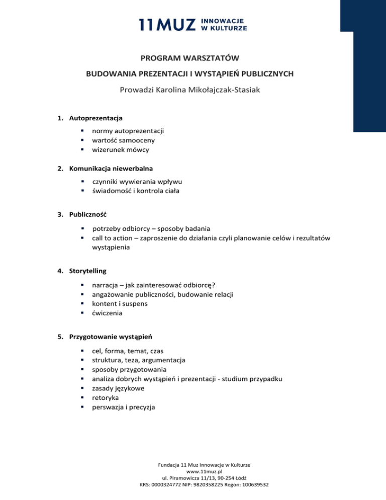 PROGRAM WARSZTATÓW BUDOWANIA PREZENTACJI I WYSTĄPIEŃ PUBLICZNYCH Prowadzi Karolina Mikołajczak-Stasiak 1. Autoprezentacja    normy autoprezentacji wartość samooceny wizerunek mówcy 2. Komunikacja niewerbalna   czynniki wywierania wpływu świadomość i kontrola ciała 3. Publiczność  potrzeby odbiorcy – sposoby badania  call to action – zaproszenie do działania czyli planowanie celów i rezultatów wystąpienia 4. Storytelling     narracja – jak zainteresować odbiorcę? angażowanie publiczności, budowanie relacji kontent i suspens ćwiczenia 5. Przygotowanie wystąpień        cel, forma, temat, czas struktura, teza, argumentacja sposoby przygotowania analiza dobrych wystąpień i prezentacji - studium przypadku zasady językowe retoryka perswazja i precyzja Fundacja 11 Muz Innowacje w Kulturze www.11muz.pl ul. Piramowicza 11/13, 90-254 Łódź KRS: 0000324772 NIP: 9820358225 Regon: 100639532 6. Różnorodność funkcji i celu    sprawozdania, prezentacje, raporty zasady wygłaszania struktura wystąpień 7. Prezentacje multimedialne     cel i forma slajdy – kolor, kontrasty, fonty, zdjęcia dobre przykłady zasady tworzenia 8. Emisja i higiena głosu  ćwiczenia 9. Wygłaszanie prezentacji przed publicznością (możliwość nagrania wideo)   analiza kompetencji mówcy, wskazówki do dalszego rozwoju dla każdego uczestnika. formułowanie informacji zwrotnej 10. Podsumowanie i wnioski z warsztatów Fundacja 11 Muz Innowacje w Kulturze www.11muz.pl ul. Piramowicza 11/13, 90-254 Łódź KRS: 0000324772 NIP: 9820358225 Regon: 100639532