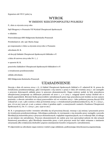 Sygnatura akt VII U 3262/14 WYROK W IMIENIU RZECZYPOSPOLITEJ POLSKIEJ P., dnia 21 stycznia 2015 roku Sąd Okręgowy w Poznaniu VII Wydział Ubezpieczeń Społecznych w składzie: Przewodniczący:SSO Małgorzata Kuźniacka-Praszczyk Protokolant:st. sek. sąd. Marta Jurga po rozpoznaniu w dniu 14 stycznia 2015 roku w Poznaniu odwołania M. R. od decyzji Zakładu Ubezpieczeń Społecznych Oddziału w P. z dnia 18 czerwca 2014 roku Nr (...) w sprawie M. R. przeciwko Zakładowi Ubezpieczeń Społecznych Oddziałowi w P. o świadczenie przedemerytalne oddala odwołanie. SSO Małgorzata Kuźniacka-Praszczyk UZASADNIENIE Decyzją z dnia 18 czerwca 2014 r. ((...)) Zakład Ubezpieczeń Społecznych Oddział w P. odmówił M. R. prawa do świadczenia przedemerytalnego, gdyż rozwiązanie z nią umowy o pracę w dniu 28 września 2013 r. nie nastąpiło z przyczyn dotyczących zakładu pracy (z przyczyn ekonomicznych). Organ rentowy podał, że były pracodawca ubezpieczonej prosperuje na zbliżonym poziomie od 2010 r., a w 2013 r. osiągnął nawet wyższy dochód niż w latach poprzednich. Również liczba pracowników zatrudnianych przez tego pracodawcę jest średnio na tym samym poziomie, a obecnie zatrudnia on więcej pracowników niż we wrześniu 2013 r. Jako podstawę prawną decyzji ZUS wskazał art. 2 ust. 1 pkt 2 ustawy z dnia 30 kwietnia 2004 r. o świadczeniach przedemerytalnych (t.j. Dz. U. z 2013 r., poz. 170 ze zm.) oraz art. 5 ust. 4 ustawy z dnia 17 grudnia 1998 r. o emeryturach i rentach z Funduszu Ubezpieczeń Społecznych (t.j. Dz. U. z 2013 r., poz. 1440 ze zm.). M. R. w przepisanym trybie i terminie odwołała się od powyższej decyzji, wnosząc o jej zmianę i przyznanie prawa do świadczenia przedemerytalnego. Odwołująca podniosła, że rozwiązanie z nią stosunku pracy nastąpiło z powodu likwidacji jej stanowiska pracy z przyczyn ekonomicznych, względnie organizacyjnych, na co wskazuje fakt, że nikogo na jej miejsce nie zatrudniono. Przyczyn ekonomicznych nie należy przy tym sprowadzać jedynie do złej sytuacji finansowej pracodawcy, gdyż likwidacja stanowiska pracy z tych przyczyn może być także związana z zamiarem utrzymania albo zwiększenia dochodów poprzez zmniejszenie kosztów związanych z zatrudnieniem. W odpowiedzi na odwołanie organ rentowy wniósł o jego oddalenie, podtrzymując dotychczasową argumentację. Sąd Okręgowy ustalił następujący stan faktyczny: Odwołująca M. R. ma obecnie 56 lat (ur. (...)), z zawodu jest technologiem przemysłu spożywczego. Do dnia 19 marca 2013 r. odwołująca prowadziła działalność gospodarczą w zakresie produkcji szkliwa ceramicznego, a jednym z jej klientów był Zakład Produkcyjno-Handlowy (...) w C.. Przedmiotem działalności Zakładu Produkcyjno-Handlowego (...) jest produkcja wyrobów ceramicznych. Właścicielem firmy jest Z. D.. Z tytułu prowadzonej działalności gospodarczej Z. D. wykazał dochód w wysokości 64 225,04 zł za 2010 r., 51 671,90 zł za 2011 r. oraz 67 749,92 zł za 2012 r. Od dnia 15 stycznia 2007 r. Z. D. w ramach prowadzonej działalności zatrudnił syna, M. D., któremu powierzył stanowisko pracownika biurowego. W ramach swoich obowiązków na w/w stanowisku, M. D. zajmował się prowadzeniem bieżącej dokumentacji firmy, m.in. wypisywał faktury, przygotowywał dokumentację dla biura rachunkowego, a nadto przyjmował zamówienia od klientów i przekazywał je na produkcję. M. D. nie zajmował się natomiast poszukiwaniem nowych klientów dla firmy – firma działała w małym środowisku i swą działalność opierała na stałych klientach. Od dnia 15 października 2012 r. M. D. korzystał z urlopu wychowawczego. Na jego miejsce, na stanowisko pracownika biurowego, nikogo nie zatrudniono, a jego obowiązki przejął Z. D.. Według stanu na dzień 1 marca 2013 r., w firmie (...) zatrudnionych było (włącznie z M. D.) 11 pracowników, w tym 10 pracowników fizycznych. Pracodawca nie zatrudniał żadnego pracownika na stanowisku przedstawiciela handlowego. W dniu 20 marca 2013 r. Z. D., w ramach prowadzonej przez siebie działalności gospodarczej, zawarł z odwołującą umowę o pracę na czas określony od 20 marca 2013 r. do 20 grudnia 2013 r., na podstawie której zatrudnił ją w swej firmie w pełnym wymiarze czasu pracy na stanowisku przedstawiciela handlowego za wynagrodzeniem 1 600,00 zł brutto miesięcznie. W umowie zastrzeżono prawo stron do jej wcześniejszego rozwiązania za dwutygodniowym wypowiedzeniem. Jako miejsce wykonywania pracy przez odwołującą wskazano siedzibę firmy w C. oraz teren województwa (...). Od dnia 20 marca 2013 r. odwołująca faktycznie pracowała na rzecz firmy (...) w ramach umowy o pracę, jednakże nie jako przedstawiciel handlowy. Odwołująca pomagała Z. D. przy obliczaniu kosztów wyprodukowania poszczególnych towarów, sortowała towar, pakowała go i przygotowywała do wysyłki, zajmowała się także pracami porządkowymi i sprzątaniem. Jedynie w czasie, gdy nie wykonywała powyższych czynności oraz po godzinach pracy, odwołująca poszukiwała klientów w Internecie oraz roznosiła foldery reklamujące działalność firmy, np. po kwiaciarniach czy sklepach. Od września 2013 r. Z. D. w ramach prowadzonej działalności przejął klientów swojego znajomego, który do lipca/ sierpnia 2013 r. prowadził działalność w podobnym zakresie. Od dnia 2 września 2013 r. Z. D., w ramach prowadzonej przez siebie działalności gospodarczej, zatrudnił trzech pracowników na stanowiska produkcyjne. W dniu 13 września 2013 r. pracodawca dokonał wypowiedzenia odwołującej umowy o pracę z zachowaniem dwutygodniowego okresu wypowiedzenia, jako przyczynę wypowiedzenia wskazując likwidację stanowiska pracy. W dniu 28 września 2013 r., po upływie okresu wypowiedzenia, stosunek pracy odwołującej uległ rozwiązaniu. W świadectwie pracy z dnia 28 września 2013 r. wskazano, iż rozwiązanie z nią stosunku p
