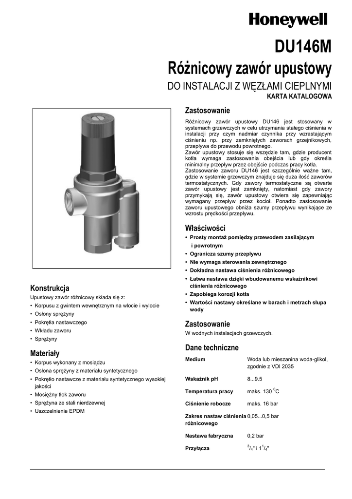 DU146M Różnicowy zawór upustowy DO INSTALACJI Z WĘZŁAMI CIEPLNYMI KARTA KATALOGOWA Zastosowanie Różnicowy zawór upustowy DU146 jest stosowany w systemach grzewczych w celu utrzymania stałego ciśnienia w instalacji przy czym nadmiar czynnika przy wzrastającym ciśnieniu np. przy zamkniętych zaworach grzejnikowych, przepływa do przewodu powrotnego. Zawór upustowy stosuje się wszędzie tam, gdzie producent kotła wymaga zastosowania obejścia lub gdy określa minimalny przepływ przez obejście podczas pracy kotła. Zastosowanie zaworu DU146 jest szczególnie ważne tam, gdzie w systemie grzewczym znajduje się duża ilość zaworów termostatycznych. Gdy zawory termostatyczne są otwarte zawór upustowy jest zamknięty, natomiast gdy zawory przymykają się, zawór upustowy otwiera się zapewniając wymagany przepływ przez kocioł. Ponadto zastosowanie zaworu upustowego obniża szumy przepływu wynikające ze wzrostu prędkości przepływu. Właściwości • Prosty montaż pomiędzy przewodem zasilającym i powrotnym • Ogranicza szumy przepływu • Nie wymaga sterowania zewnętrznego • Dokładna nastawa ciśnienia różnicowego Konstrukcja Upustowy zawór różnicowy składa się z: • Korpusu z gwintem wewnętrznym na wlocie i wylocie • Osłony sprężyny • Pokrętła nastawczego • Wkładu zaworu • Sprężyny Materiały • Korpus wykonany z mosiądzu • Łatwa nastawa dzięki wbudowanemu wskaźnikowi ciśnienia różnicowego • Zapobiega korozji kotła • Wartości nastawy określane w barach i metrach słupa wody Zastosowanie W wodnych instalacjach grzewczych. Dane techniczne Medium Woda lub mieszanina woda-glikol, zgodnie z VDI 2035 Wskaźnik pH 8...9.5 Temperatura pracy 0 maks. 130 C Ciśnienie robocze maks. 16 bar • Osłona sprężyny z materiału syntetycznego • Pokrętło nastawcze z materiału syntetycznego wysokiej jakości • Mosiężny tłok zaworu • Sprężyna ze stali nierdzewnej • Uszczelnienie EPDM Zakres nastaw ciśnienia 0,05...0,5 bar różnicowego Nastawa fabryczna 0,2 bar Przyłącza 3 /4" i 11/4" DU146 Różnicowy zawór upustowy Wymiary Działanie Przy równym ciśnieniu pomiędzy przewodem zasilającym a powrotnym zawór jest zamknięty. Grzyb zaworu pod wpływem nacisku sprężyny jest dociskany do gniazda zaworu. Jeśli pomiędzy przewodem zasilającym a powrotny powstanie ciśnienie różnicowe, to wytworzy siłę nacisku w kierunku sprężyny. Wraz ze wzrostem siły nacisku pokonującej siłę sprężyny następuje otwarcie zaworu i pojawi się stały przepływ przez obejście z przewodu zasilającego do powrotnego. W zależności od wielkości nastawy oraz ciśnienia różnicowego przepływ przez obejście pokreślony na diagramach w dalszej części karty. Oznaczenie DU146-...A =Wersja standardowa Specjalne wersje na specjalne zamówienie wielkość przyłącza Rys. 1. Wymiary Tabela 1. Oznaczenia katalogowe i wymiary Wymiary Przyłącze Numer L I H h m3/godz. katalogowy /4 " 50 36 160 100 3 DU146M-3/4A 1 1 /4 " 58 51 213 155 10 DU146M-11/4A 3 Części zamienne Wkład zaworu 2 Przepływ V Dla zaworów 3/4“ 0900311 Dla zaworów 1 1/4“ 0900312 DU146M Różnicowy zawór upustowy Przykłady zastosowań Rys. 2. DU146 obiegu grzewczym z kotłem wiszącym Uwagi montażowe Zastosowanie • Prosty montaż pomiędzy zasilaniem a powrotem Automatyczne zawory upustowo-różnicowe stosowane są w instalacjach grzewczych do utrzymywania stałego ciśnienia różnicowego oraz do zmniejszenia szumów przepływu. • Bez sterowania zewnętrznego • Nie stosować w instalacjach z węzłami cieplnymi • W celach serwisowych zaleca się zastosowanie zaworów odcinający przed i za zaworem Zawór DU146 może być instalowany w: • instalacjach z 3-drogowym zaworem mieszającym • instalacjach z 4-drogowym zaworem mieszającym • w obiegach grzewczych z kotłami wiszącymi Nomogram przepływu p Δp (bar) (bar) (m sł. wody) 0.6 6 0.5 5 Obroty Turns p (bar) (m. sł. wody) Δp (bar) 0.6 6 Obroty Turns 14 12 0.4 10 4 8 3 6 0.2 2 4 2 min. 0.1 1 0 0 0.3 0 1 2 Rys. 3. Przepływ dla wielkości przyłącza R3/4” 3 V (m/h) 14 0.5 5 0.4 4 0.3 3 0.2 2 0.1 1 0 0 12 10 8 6 4 2 min. 0 1 2 3 4 5 6 7 8 9 10 V (m/h) Rys. 4 Przepływ dla wielkości przyłącza R1 1/4" 3 DU146M Różnicowy zawór upustowy Honeywell sp. z o.o. Ul. Domaniewska 39B 02-672 WarszawaR0113 EN 0H-2701GE25 Tel.: 22 6060900, faks 22 6060982 www.honeywell.com.pl/automatyka_domow 4 4 Honeywell Subject to change DU146M-k-pl-1rMW0713