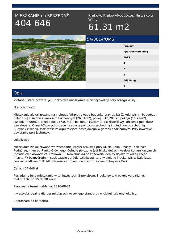 MIESZKANIE na SPRZEDAŻ 404 646 Kraków, Kraków-Podgórze, Na Zakolu Wisły 61.31 m2 54/3814/OMS Primary ApartmentBuilding 2015 4 7 3 Adjoining 1 Opis Victoria Estate prezentuje 3-pokojowe mieszkanie w cichej okolicy przy brzegu Wisły! Nieruchomość: Mieszkanie zlokalizowane na II piętrze VII-piętrowego budynku przy ul. Na Zakolu Wisły - Podgórze. Składa się z salonu z aneksem kuchennym (26,84m2), pokoju (10,78m2), pokoju (11,72m2), łazienki (4,90m2), przedpokoju (7,07m2) i balkonu (10,43m2). Możliwość wykończenia pod klucz dewelopera. Okna PCV, wychodzące na stronę północno-zachodnią i południowo-zachodnią. Budynek z windą. Możliwość zakupu miejsca postojowego w garażu podziemnym. Przy inwestycji powstanie port jachtowy. Lokalizacja: Mieszkanie zlokalizowane we wschodniej części Krakowa przy ul. Na Zakolu Wisły - dzielnica Podgórze, 4 km od Rynku Głównego. Osiedle położone jest blisko dużych węzłów komunikacyjnych (południowa obwodnica Krakowa, ul. Nowohucka) co zapewnia idealny dojazd w każdą część miasta. W bezpośrednim sąsiedztwie ogródki działkowe, tereny zielone i rzeka Wisła. Najbliższe centra handlowe CHT, M1, Galeria Kazimierz, centra biznesowe Enterprise Park. Cena: 404 646 zł Posiadamy inne mieszkania w tej inwestycji: 2-pokojowe, 3-pokojowe, 4-pokojowe o różnych metrażach: od 35 do 98 mkw. Planowany termin oddania: 2016-08-31 Inwestycja idealna dla poszukujących wysokiego standardu w cichej i zielonej okolicy. Zapraszam do kontaktu. Victoria Estate Marcin Golonka tel. +48 502 411 939 tel. 511 560 721 email: [email protected] Victoria Estate Powered by TCPDF (www.tcpdf.org)
