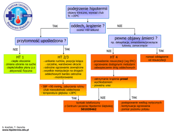 podejrzenie hipotermii objawy kliniczne, wywiad i/lub Tc <35ºC oddech, krążenie ? TAK NIE ocena >60 sekund pewne objawy śmierci ? przytomność upośledzona ? np. dekapitacja, zmiażdżenie/przecięcie tułowia, zamarznięcie TAK NIE HT 1 HT 2/3 ciepłe otoczenie ➔ zmiana ubrania na suche ➔ ciepłe/słodkie płyny p.o ➔ aktywność fizyczna unikanie ruchów, pozycja leżąca ➔ szczelne, warstwowe okrycie ➔ ostrożne ogrzewanie zewnętrzne ➔ wszelkie manipulacje na drogach oddechowych bardzo ostrożnie ➔ monitorowanie ➔ HT 4 ➔ - SBP <90 mmHg, zaburzenia rytmu i/lub niewydolność oddechowa - temperatura głęboka <28ºC TAK prowadzenie resuscytacji (wg ERC) ➔ ogrzewanie dostępnymi metodami ➔ zabezpieczenie dróg oddechowych ➔ rozważ odstąpienie od resuscytacji - zatrzymanie krążenia przed wychłodzeniem - poważny uraz TAK NIE kontakt telefoniczny z Centrum Leczenia Hipotermii Głębokiej 501039462 S. Kosiński, T. Darocha www.hipotermia.edu.pl TAK NIE postępowanie według wytycznych kontynuacja ogrzewania ➔ pomiar poziomu potasu ➔ ➔ TELEFON ALARMOWY CENTRUM LECZENIA HIPOTERMII GŁĘBOKIEJ dla województwa małopolskiego możliwość wdrożenia leczenia pozaustrojowego TEL. 501 039 462 Krakowski Szpital Specjalistyczny im. Jana Pawła II, ul. Prądnicka 80; 31-207 Kraków www.hipotermia.edu.pl