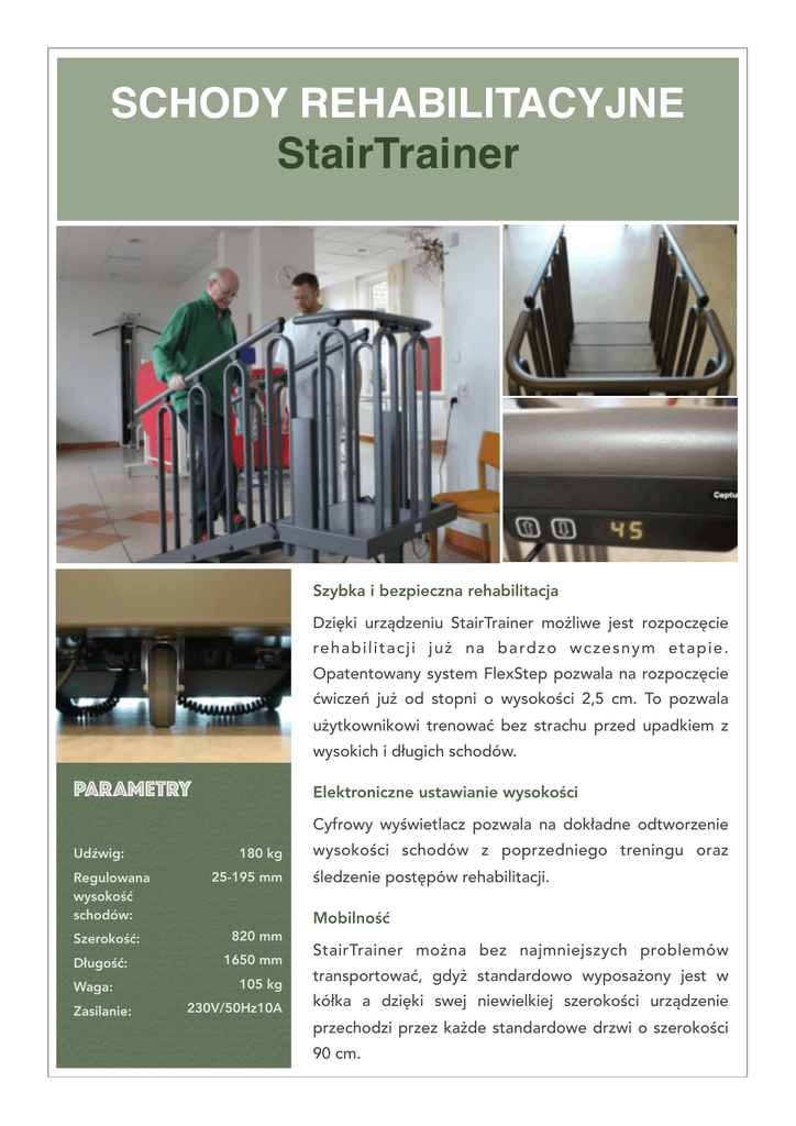 SCHODY REHABILITACYJNE StairTrainer Szybka i bezpieczna rehabilitacja Dzięki urządzeniu StairTrainer możliwe jest rozpoczęcie re h a b i l i t a c j i j u ż n a b a rd z o w c z e s n y m e t a p i e . Opatentowany system FlexStep pozwala na rozpoczęcie ćwiczeń już od stopni o wysokości 2,5 cm. To pozwala użytkownikowi trenować bez strachu przed upadkiem z wysokich i długich schodów. PARAMETRY Elektroniczne ustawianie wysokości Cyfrowy wyświetlacz pozwala na dokładne odtworzenie Udźwig: Regulowana wysokość schodów: Szerokość: Długość: Waga: Zasilanie: 180 kg 25-195 mm 820 mm 1650 mm 105 kg 230V/50Hz10A wysokości schodów z poprzedniego treningu oraz śledzenie postępów rehabilitacji. Mobilność StairTrainer można bez najmniejszych problemów transportować, gdyż standardowo wyposażony jest w kółka a dzięki swej niewielkiej szerokości urządzenie przechodzi przez każde standardowe drzwi o szerokości 90 cm. StairTrainer ZALETY • rehabilitacja po wypadkach • wzmocnienie treningu osób z dysfunkcją chodzenia Bezpieczeństwo StairTrainer wyposażony jest wytrzymale poręcze, co sprawia, że użytkownik nie musi się obawiać upadku w trakcie treningu. Poręcze są na wysokości ok. 1,1 m dla osób dorosłych lub w wersji rozszerzonej dla dzieci również w połowie wysokości. • idealny do ćwiczeń dla osób starszych • kilkanaście opcji ustawienia poziomu trudności • łatwy transport urządzenia np. między salami • cyfrowy wyświetlacz pozwalający na śledzenie postępów Dystrybutor na Polskę: GOLD-BUD Sp.zo.o. Al. Chopina 55; 05-092 Łomianki Dolne emial: [email protected] www.gold-bud.pl