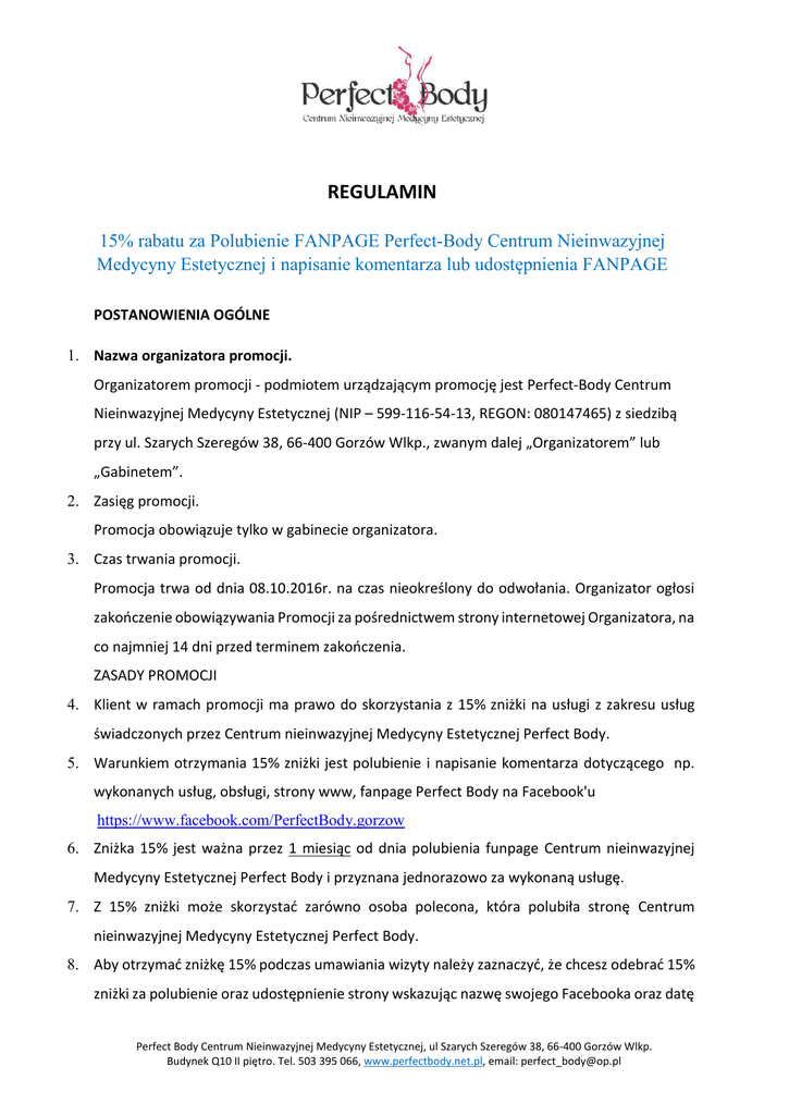 REGULAMIN 15% rabatu za Polubienie FANPAGE Perfect-Body Centrum Nieinwazyjnej Medycyny Estetycznej i napisanie komentarza lub udostępnienia FANPAGE POSTANOWIENIA OGÓLNE 1. Nazwa organizatora promocji. Organizatorem promocji - podmiotem urządzającym promocję jest Perfect-Body Centrum Nieinwazyjnej Medycyny Estetycznej (NIP – 599-116-54-13, REGON: 080147465) z siedzibą przy ul. Szarych Szeregów 38, 66-400 Gorzów Wlkp., zwanym dalej „Organizatorem” lub „Gabinetem”. 2. Zasięg promocji. Promocja obowiązuje tylko w gabinecie organizatora. 3. Czas trwania promocji. Promocja trwa od dnia 08.10.2016r. na czas nieokreślony do odwołania. Organizator ogłosi zakończenie obowiązywania Promocji za pośrednictwem strony internetowej Organizatora, na co najmniej 14 dni przed terminem zakończenia. ZASADY PROMOCJI 4. Klient w ramach promocji ma prawo do skorzystania z 15% zniżki na usługi z zakresu usług świadczonych przez Centrum nieinwazyjnej Medycyny Estetycznej Perfect Body. 5. Warunkiem otrzymania 15% zniżki jest polubienie i napisanie komentarza dotyczącego np. wykonanych usług, obsługi, strony www, fanpage Perfect Body na Facebook'u https://www.facebook.com/PerfectBody.gorzow 6. Zniżka 15% jest ważna przez 1 miesiąc od dnia polubienia funpage Centrum nieinwazyjnej Medycyny Estetycznej Perfect Body i przyznana jednorazowo za wykonaną usługę. 7. Z 15% zniżki może skorzystać zarówno osoba polecona, która polubiła stronę Centrum nieinwazyjnej Medycyny Estetycznej Perfect Body. 8. Aby otrzymać zniżkę 15% podczas umawiania wizyty należy zaznaczyć, że chcesz odebrać 15% zniżki za polubienie oraz udostępnienie strony wskazując nazwę swojego Facebooka oraz datę Perfect Body Centrum Nieinwazyjnej Medycyny Estetycznej, ul Szarych Szeregów 38, 66-400 Gorzów Wlkp. Budynek Q10 II piętro. Tel. 503 395 066, www.perfectbody.net.pl, email: [email protected] polubienia Centrum nieinwazyjnej Medycyny Estetycznej Perfect Body. 9. Promocja nie łączy się z innymi aktualnie obowiązującymi promocjami i ofertami specjalnymi. 10. Zniżki 15% nie można wymienić na ekwiwalent pieniężny. 11. Regulamin może być w każdym czasie jednostronnie zmieniony przez Właściciela w całości lub w części, a zmiany stają się obowiązujące w momencie ich opublikowania na stronie portalu, w zakładce Regulamin. 12. Niniejszy regulamin obowiązuje od dnia 8 października 2016 roku. 13. Klient oświadcza, iż zapoznał się z Regulaminem i akceptuje go w całości. Perfect Body Centrum Nieinwazyjnej Medycyny Estetycznej, ul Szarych Szeregów 38, 66-400 Gorzów Wlkp. Budynek Q10 II piętro. Tel. 503 395 066, www.perfectbody.net.pl, email: [email protected]