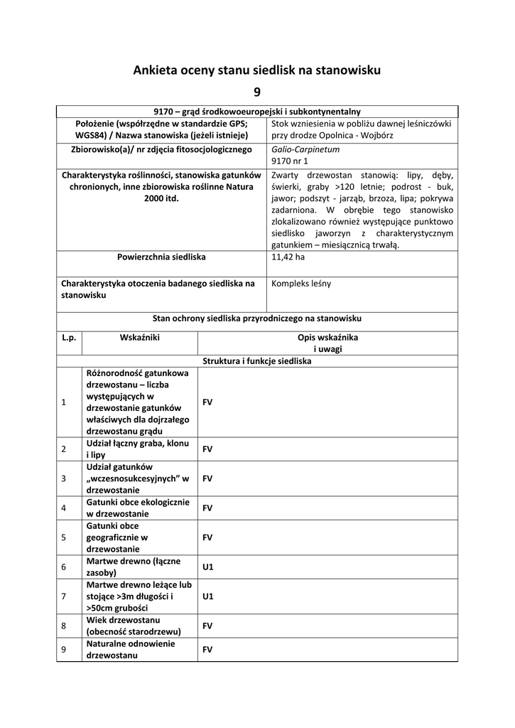 Ankieta oceny stanu siedlisk na stanowisku 9 9170 – grąd środkowoeuropejski i subkontynentalny Położenie (współrzędne w standardzie GPS; Stok wzniesienia w pobliżu dawnej leśniczówki WGS84) / Nazwa stanowiska (jeżeli istnieje) przy drodze Opolnica - Wojbórz Zbiorowisko(a)/ nr zdjęcia fitosocjologicznego Galio-Carpinetum 9170 nr 1 Charakterystyka roślinności, stanowiska gatunków Zwarty drzewostan stanowią: lipy, dęby, chronionych, inne zbiorowiska roślinne Natura świerki, graby >120 letnie; podrost - buk, 2000 itd. jawor; podszyt - jarząb, brzoza, lipa; pokrywa zadarniona. W obrębie tego stanowisko zlokalizowano również występujące punktowo siedlisko jaworzyn z charakterystycznym gatunkiem – miesiącznicą trwałą. Powierzchnia siedliska 11,42 ha Charakterystyka otoczenia badanego siedliska na stanowisku Kompleks leśny Stan ochrony siedliska przyrodniczego na stanowisku L.p. 1 2 3 4 5 6 7 8 9 Wskaźniki Różnorodność gatunkowa drzewostanu – liczba występujących w drzewostanie gatunków właściwych dla dojrzałego drzewostanu grądu Udział łączny graba, klonu i lipy Udział gatunków „wczesnosukcesyjnych” w drzewostanie Gatunki obce ekologicznie w drzewostanie Gatunki obce geograficznie w drzewostanie Martwe drewno (łączne zasoby) Martwe drewno leżące lub stojące >3m długości i >50cm grubości Wiek drzewostanu (obecność starodrzewu) Naturalne odnowienie drzewostanu Opis wskaźnika i uwagi Struktura i funkcje siedliska FV FV FV FV FV U1 U1 FV FV 10 11 Struktura pionowa i przestrzenna drzewostanu Charakterystyczna kombinacja florystyczna runa FV XX nierozpoznane wiosenne geofity charakterystyczne dla tego typu siedlisk ze względu na porę przeprowadzania weryfikacji terenowej Ekspansywne gatunki obce FV w podszycie i runie Ekspansywne gatunki 13 rodzime (apofity) w runie; U1 w tym gatunki porębowe Różnorodność występujących mchów, 14 grzybów, ptaków lub XX owadów (jeżeli są takie dane lub obserwacje) Pozyskanie drewna i inne 15 przekształcenia związane z FV użytkowaniem Inne zniekształcenia 16 (rozjeżdżanie, wydeptanie, FV zaśmiecenie) Perspektywy ochrony FV Inne/ uwagi Zagrożenia (redukcyjny wpływ czynników naturalnych oraz działalność człowieka) Inne wartości przyrodnicze 12 Wymogi co do monitoringu/ uzasadnienie - Propozycje wprowadzenia działań ochronnych Nie usuwanie podrostu grabowego przy wykonywaniu rębni. Preferowanie złożonych rębni stopniowych z wydłużonym okresem odnawiania – pozwalają one uzyskać strukturę lasu bardziej zbliżoną do struktury naturalnego grądu. Ograniczenie rozprzestrzeniania się buka, a tym samym hamowanie przekształcania się gradów w buczyny. Pozostawianie martwych drzew. Prowadzenie zrywki drzew w okresie zimowym, aby eliminować uszkodzenia gleby oraz niszczenie cennych siedlisk roślinnych. W przypadku prowadzenia odnowień niezbędne jest dostosowanie składu gatunkowego drzewostanów do siedlisk „naturowych” poprzez uwzględnienie takich gatunków jak dąb i lipa, a zmniejszenie udziału świerka. Ocena ogólna siedliska na stanowisku FV