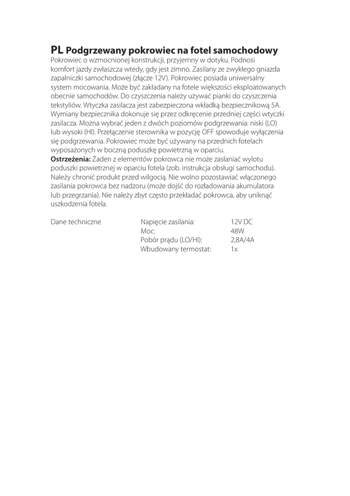 PL Podgrzewany pokrowiec na fotel samochodowy Pokrowiec o wzmocnionej konstrukcji, przyjemny w dotyku. Podnosi komfort jazdy zwłaszcza wtedy, gdy jest zimno. Zasilany ze zwykłego gniazda zapalniczki samochodowej (złącze 12V). Pokrowiec posiada uniwersalny system mocowania. Może być zakładany na fotele większości eksploatowanych obecnie samochodów. Do czyszczenia należy używać pianki do czyszczenia tekstyliów. Wtyczka zasilacza jest zabezpieczona wkładką bezpiecznikową 5A. Wymiany bezpiecznika dokonuje się przez odkręcenie przedniej części wtyczki zasilacza. Można wybrać jeden z dwóch poziomów podgrzewania: niski (LO) lub wysoki (HI). Przełączenie sterownika w pozycję OFF spowoduje wyłączenia się podgrzewania. Pokrowiec może być używany na przednich fotelach wyposażonych w boczną poduszkę powietrzną w oparciu. Ostrzeżenia: Żaden z elementów pokrowca nie może zasłaniać wylotu poduszki powietrznej w oparciu fotela (zob. instrukcja obsługi samochodu). Należy chronić produkt przed wilgocią. Nie wolno pozostawiać włączonego zasilania pokrowca bez nadzoru (może dojść do rozładowania akumulatora lub przegrzania). Nie należy zbyt często przekładać pokrowca, aby uniknąć uszkodzenia fotela. Dane techniczne Napięcie zasilania: Moc: Pobór prądu (LO/HI): Wbudowany termostat: 12V DC 48W 2,8A/4A 1x
