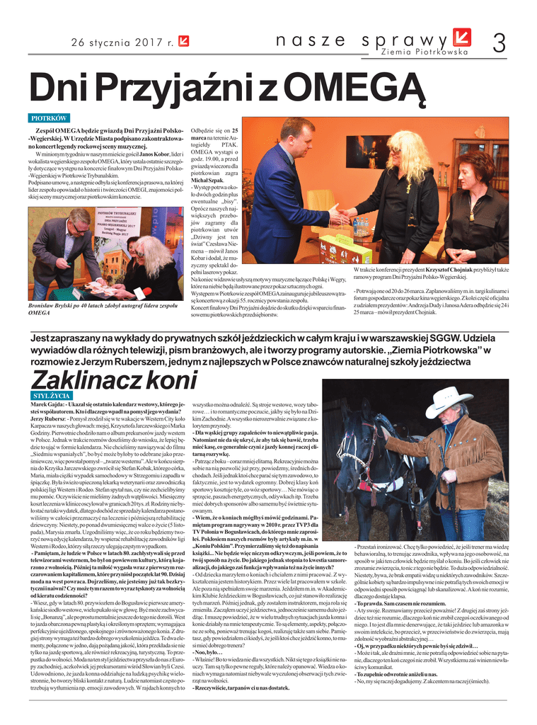 Dni Przyjaźni z OMEGĄ nasze sprawy 2 6 st ycznia 201 7 r. PIOTRKÓW Zespół OMEGA będzie gwiazdą Dni Przyjaźni Polsko-Węgierskiej. W Urzędzie Miasta podpisano zakontraktowano koncert legendy rockowej sceny muzycznej. W minionym tygodniu w naszym mieście gościł Janos Kobor, lider i wokalista węgierskiego zespołu OMEGA, który ustala ostatnie szczegóły dotyczące występu na koncercie finałowym Dni Przyjaźni Polsko-Węgierskiej w Piotrkowie Trybunalskim. Podpisano umowę, a następnie odbyła się konferencja prasowa, na której lider zespołu opowiadał o historii i twórczości OMEGI, znajomości polskiej sceny muzycznej oraz piotrkowskim koncercie. Bronisław Brylski po 40 latach zdobył autograf lidera zespołu OMEGA Ziemia Piotrkowska Odbędzie się on 25 marca na terenie Autogiełdy PTAK. OMEGA wystąpi o godz. 19.00, a przed gwiazdą wieczoru dla piotrkowian zagra Michał Szpak. - Występ potrwa około dwóch godzin plus ewentualne „bisy”. Oprócz naszych największych przebojów zagramy dla piotrkowian utwór „Dziwny jest ten świat” Czesława Niemena – mówił Janos Kobar i dodał, że muzyczny spektakl dopełni laserowy pokaz. Na koniec widzowie usłyszą motywy muzyczne łączące Polskę i Węgry, które na niebie będą ilustrowane przez pokaz sztucznych ogni. Występem w Piotrkowie zespół OMEGAzainauguruje jubileuszową trasę koncertową z okazji 55. rocznicy powstania zespołu. Koncert finałowy Dni Przyjaźni dojdzie do skutku dzięki wsparciu finansowemu piotrkowskich przedsiębiorstw. 3 W trakcie konferencji prezydent Krzysztof Chojniak przybliżył także ramowy program Dni Przyjaźni Polsko-Węgierskiej. - Potrwają one od 20 do 26 marca. Zaplanowaliśmy m.in. targi kulinarne i forum gospodarcze oraz pokaz kina węgierskiego. Z kolei część oficjalna z udziałem prezydentów: Andrzeja Dudy i Janosa Adera odbędzie się 24 i 25 marca – mówił prezydent Chojniak. Jest zapraszany na wykłady do prywatnych szkół jeździeckich w całym kraju i w warszawskiej SGGW. Udziela wywiadów dla różnych telewizji, pism branżowych, ale i tworzy programy autorskie. „Ziemia Piotrkowska” w rozmowie z Jerzym Ruberszem, jednym z najlepszych w Polsce znawców naturalnej szkoły jeździectwa Zaklinacz koni Marek Gajda: - Ukazał się ostatnio kalendarz westowy, którego jesteś współautorem. Kto i dlaczego wpadł na pomysł jego wydania? Jerzy Rubersz: - Pomysł zrodził się w te wakacje w Western City koło Karpacza w naszych głowach: mojej, Krzysztofa Jarczewskiego i Marka Godziny. Pierwotnie chodziło nam o album prekursorów jazdy western w Polsce. Jednak w trakcie rozmów doszliśmy do wniosku, że lepiej będzie to ująć w formie kalendarza. Nie chcieliśmy nawiązywać do filmu „Siedmiu wspaniałych”, bo być może byłoby to odebrane jako prześmiewcze, więc powstał pomysł – „twarze westernu”.Ale w końcu sierpnia do Krzyśka Jarczewskiego zwrócił się Stefan Kobak, którego córka, Maria, miała ciężki wypadek samochodowy w Strzegomiu i zapadła w śpiączkę. Była świeżo upieczoną lekarką weterynarii oraz zawodniczką polskiej ligi Western i Rodeo. Stefan spytał nas, czy nie zechcielibyśmy mu pomóc. Oczywiście nie mieliśmy żadnych wątpliwości. Miesięczny koszt leczenia w klinice oscylował w granicach 20 tys. zł. Rodziny nie było stać na taki wydatek, dlatego dochód ze sprzedaży kalendarza postanowiliśmy w całości przeznaczyć na leczenie i późniejszą rehabilitację dziewczyny. Niestety, po ponad dwumiesięcznej walce o życie (5 listopada), Marysia zmarła. Uzgodniliśmy więc, że co roku będziemy tworzyć nową edycję kalendarza, by wspierać rehabilitację zawodników ligi Western i Rodeo, którzy siłą rzeczy ulegają częstym wypadkom. - Pamiętam, że ludzie w Polsce w latach 80. zachłystywali się przed telewizorami westernem, bo był on powiewem kultury, którą kojarzono z wolnością. Później ta miłość wygasła wraz z pierwszym rozczarowaniem kapitalizmem, które przyniósł początek lat 90. Dzisiaj moda na west powraca. Dojrzeliśmy, nie jesteśmy już tak bezkrytyczni i naiwni? Czy może tym razem to wyraz tęsknoty za wolnością od kieratu codzienności? - Wiesz, gdy w latach 80. przywiozłem do Bogusławic pierwsze amerykańskie siodło westowe, wielu pukało się w głowę. Być może zachwycali się „Bonanzą”, ale po prostu mentalnie jeszcze do tego nie dorośli. West to jazda obarczona pewną plastyką i określonym sprzętem; wymagająca perfekcyjnie ujeżdżonego, spokojnego i zrównoważonego konia. Z drugiej strony wymaga też bardzo dobrego wyszkolenia jeźdźca. Te dwa elementy, połączone w jedno, dają pożądaną jakość, która przekłada sie nie tylko na jazdę sportową, ale również rekreacyjną, turystyczną. To przepustka do wolności. Moda na ten styl jeździectwa przyszła do nas z Europy zachodniej, aczkolwiek jej prekursorami wśród Słowian byli Czesi. Udowodniono, że jazda konna oddziałuje na ludzką psychikę wielostronnie, bo tworzy bliski kontakt z naturą. Ludzie natomiast często potrzebują wytłumienia np. emocji zawodowych. W rajdach konnych to STYL ŻYCIA wszystko można odnaleźć. Są stroje westowe, wozy taborowe… i to romantyczne poczucie, jakby się było na Dzikim Zachodnie. A wszystko nierozerwalnie związane z kolorytem przyrody. - Dla wąskiej grupy zapaleńców to niewątpliwie pasja. Natomiast nie da się ukryć, że aby tak się bawić, trzeba mieć kasę, co generalnie czyni z jazdy konnej raczej elitarną rozrywkę. - Patrząc z boku – coraz mniej elitarną. Rekreacyjnie można sobie na nią pozwolić już przy, powiedzmy, średnich dochodach. Jeśli jednak ktoś chce parać się tym zawodowo, to faktycznie, jest to wydatek ogromny. Dobrej klasy koń sportowy kosztuje tyle, co wóz sportowy… Nie mówiąc o sprzęcie, paszach energetycznych, odżywkach itp. Trzeba mieć dobrych sponsorów albo samemu być 