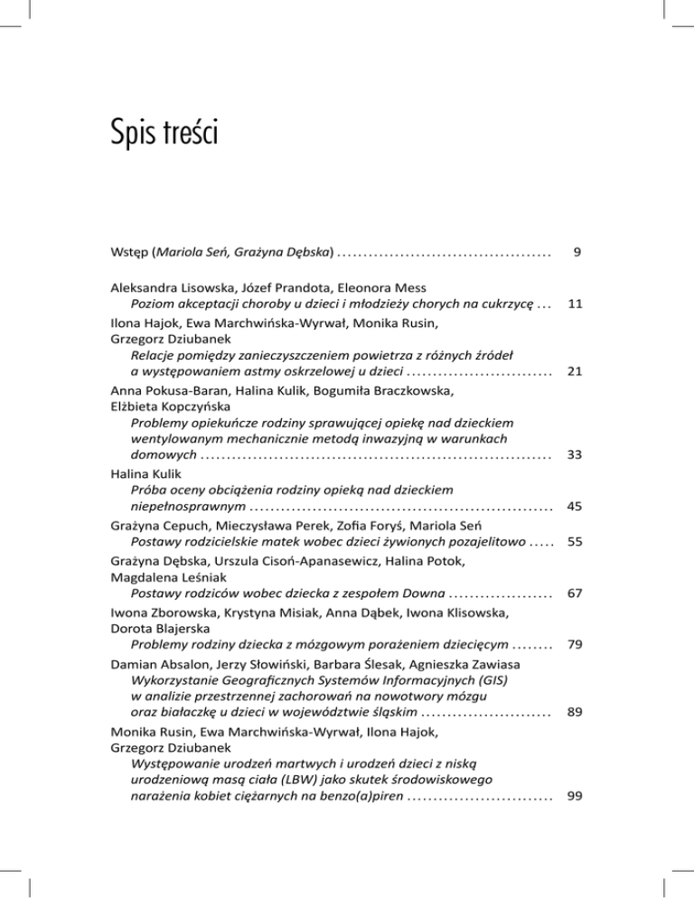 Spis treści Wstęp (Mariola Seń, Grażyna Dębska) . . . . . . . . . . . . . . . . . . . . . . . . . . . . . . . . . . . . . . . . . Aleksandra Lisowska, Józef Prandota, Eleonora Mess Poziom akceptacji choroby u dzieci i młodzieży chorych na cukrzycę . . . Ilona Hajok, Ewa Marchwińska-Wyrwał, Monika Rusin, Grzegorz Dziubanek Relacje pomiędzy zanieczyszczeniem powietrza z różnych źródeł a występowaniem astmy oskrzelowej u dzieci . . . . . . . . . . . . . . . . . . . . . . . . . . . . Anna Pokusa-Baran, Halina Kulik, Bogumiła Braczkowska, Elżbieta Kopczyńska Problemy opiekuńcze rodziny sprawującej opiekę nad dzieckiem wentylowanym mechanicznie metodą inwazyjną w warunkach domowych . . . . . . . . . . . . . . . . . . . . . . . . . . . . . . . . . . . . . . . . . . . . . . . . . . . . . . . . . . . . . . . . . . . Halina Kulik Próba oceny obciążenia rodziny opieką nad dzieckiem niepełnosprawnym . . . . . . . . . . . . . . . . . . . . . . . . . . . . . . . . . . . . . . . . . . . . . . . . . . . . . . . . . . Grażyna Cepuch, Mieczysława Perek, Zofia Foryś, Mariola Seń Postawy rodzicielskie matek wobec dzieci żywionych pozajelitowo . . . . . Grażyna Dębska, Urszula Cisoń-Apanasewicz, Halina Potok, Magdalena Leśniak Postawy rodziców wobec dziecka z zespołem Downa . . . . . . . . . . . . . . . . . . . . Iwona Zborowska, Krystyna Misiak, Anna Dąbek, Iwona Klisowska, Dorota Blajerska Problemy rodziny dziecka z mózgowym porażeniem dziecięcym . . . . . . . . Damian Absalon, Jerzy Słowiński, Barbara Ślesak, Agnieszka Zawiasa Wykorzystanie Geograficznych Systemów Informacyjnych (GIS) w analizie przestrzennej zachorowań na nowotwory mózgu oraz białaczkę u dzieci w województwie śląskim . . . . . . . . . . . . . . . . . . . . . . . . . Monika Rusin, Ewa Marchwińska-Wyrwał, Ilona Hajok, Grzegorz Dziubanek Występowanie urodzeń martwych i urodzeń dzieci z niską urodzeniową masą ciała (LBW) jako skutek środowiskowego narażenia kobiet ciężarnych na benzo(a)piren . . . . . . . . . . . . . . . . . . . . . . . . . . . . 9 11 21 33 45 55 67 79 89 99 6 Spis treści Marcela Ižová, Kvetoslava Drozdíková-Kurišová Koncept bazálnej s mulácie v ošetrovatel’skej praxi . . . . . . . . . . . . . . . . . . . . . 111 Bogumiła Braczkowska, Renata Bonar, Elżbieta Kopczyńska, Halina Kulik Zapalenie zatok przynosowych u dzieci – problemy pielęgnacyjne . . . . . 119 Helena Kaducáková, Katarína Zrubáková The Influence of Nutri on on Health Condi on of Secondary School Teens . . . . . . . . . . . . . . . . . . . . . . . . . . . . . . . . . . . . . . . . . . . . . . . . . . . . . . . . . . . . . . . . . 129 Contents Introduc on (Mariola Seń, Grażyna Dębska) . . . . . . . . . . . . . . . . . . . . . . . . . . . . . . . . . . Aleksandra Lisowska, Józef Prandota, Eleonora Mess The Level of Acceptance of the Disease in Children and Adolescents with Diabetes . . . . . . . . . . . . . . . . . . . . . . . . . . . . . . . . . . . . . . . . . . . . . . . . . . . . . . . . . . . . . . . . Ilona Hajok, Ewa Marchwińska-Wyrwał, Monika Rusin, Grzegorz Dziubanek The Correla on between Air Pollu on from Various Sources and the Incidence of Asthma in Children . . . . . . . . . . . . . . . . . . . . . . . . . . . . . . . . . . Anna Pokusa-Baran, Halina Kulik, Bogumiła Braczkowska, Elżbieta Kopczyńska Care Problems of a Family Looking a er a Child Who Is Mechanically Ven lated by Means of an Invasive Method in Home Condi ons . . . . . . . . . . . . . . . . . . . . . . . . . . . . . . . . . . . . . . . . . . . . . . . . . . . . . . . . . . Halina Kulik An A empt to Evaluate the Burden Resul ng from Looking a er a Disabled Child . . . . . . . . . . . . . . . . . . . . . . . . . . . . . . . . . . . . . . . . . . . . . . . . . . . . . . . . . . . . . . Grażyna Cepuch, Mieczysława Perek, Zofia Foryś, Mariola Seń A tudes of Mothers of Children Fed Parenterally . . . . . . . . . . . . . . . . . . . . . . . . Grażyna Dębska, Urszula Cisoń-Apanasewicz, Halina Potok, Magdalena Leśniak Parental A tudes Towards the Children with Down Syndrome . . . . . . . . . Iwona Zborowska, Krystyna Misiak, Anna Dąbek, Iwona Klisowska, Dorota Blajerska Problems of Family Child with Cerebral Palsy . . . . . . . . . . . . . . . . . . . . . . . . . . . . . Damian Absalon, Jerzy Słowiński, Barbara Ślesak, Agnieszka Zawiasa The Use of Geographical Informa on Systems (GIS) in Spa al Analysis of Brain Cancer and Leukemia in Children in the Silesia Province . . . . . . . . . . . . . . . . . . . . . . . . . . . . . . . . . . . . . . . . . . . . . . . . . . . . . . . . . . . . . . . . . . . . . . Monika Rusin, Ewa Marchwińska-Wyrwał, Ilona Hajok, Grzegorz Dziubanek The Rela on between Environmental Exposure to Benzoapyrene of Pregnant Women and S llbirths and Low Birth Weight (LBW) of their Children . . . . . . . . . . . . . . . . . . . . . . . . . . . . . . . . . . . . . . . . . . . . . . . . . . . . . . . . . . . . . 9 11 21 33 45 55 67 79 89 99 8 Contents Marcela Ižová, Kvetoslava Drozdíková-Kurišová The Concept of Basal S mula on in Nursing Prac ce . . . . . . . . . . . . . . . . . . . . 111 Bogumiła Braczkowska, Renata Bonar, Elżbieta Kopczyńska, Halina Kulik Sinusi s in Children – Ursing Problems . . . . . . . . . . . . . . . . . . . . . . . . . . . . . . . . . . . . 119 Helena Kaducáková, Katarína Zrubáková The Influence of Nutri on on Health Condi on of Secondary School Teens . . . . . . . . . . . . . . . . . . . . . . . . . . . . . . . . . . . . . . . . . . . . . . . . . . . . . . . . . . . . . . . . . 129
