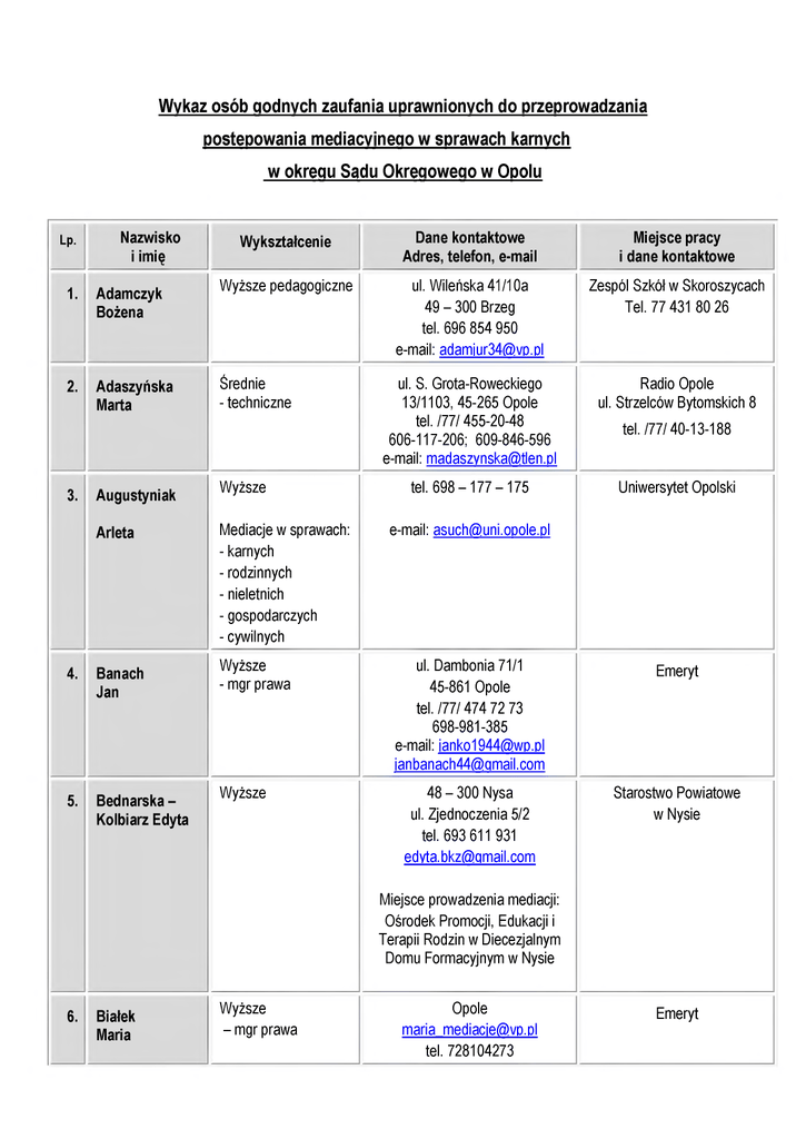 Wykaz osób godnych zaufania uprawnionych do przeprowadzania postępowania mediacyjnego w sprawach karnych w okręgu Sądu Okręgowego w Opolu Lp. 1. Nazw isko i im ię A dam czyk Bożena W ykształcen ie Dane kontaktow e A dres, telefon, e-m ail M iejsce pracy i dane kontaktow e W yższe pedagogiczne ul. W ileńska 4 1/10a Zespól S zkół w S koroszycach 49 - 300 Brzeg Tel. 77 431 80 26 tel. 696 854 950 e-m ail: adam iur34@ vp.pl 2. 3. A daszyńska M arta A ug ustyniak A rleta Średnie - techniczne W yższe M ediacje w sprawach: ul. S. G rota-R ow eckiego 13/1103, 45-265 Opole tel. /77/ 455-20-48 606-117-206; 609-846-596 e-m ail: m adaszynska@ tlen.pl Radio Opole ul. S trzelców Bytom skich 8 tel. 698 - 177 - 175 U niw ersytet Opolski tel. /77/ 40-13-188 e-m ail: asuch@ uni.opole.pl - karnych - rodzinnych - nieletnich - gospodarczych - cyw ilnych 4. Banach Jan W yższe - m gr prawa ul. D am bonia 71/1 Em eryt 45-861 O pole tel. /77/ 474 72 73 698-981-385 e-m ail: ianko1944@ w p.pl ianbanach44@ gm ail.com 5. B ednarska K olbiarz Edyta W yższe 48 - 300 Nysa S tarostw o Powiatowe ul. Z jednoczenia 5/2 w Nysie tel. 693 611 931 edyta.bkz@ gm ail.com M iejsce prow adzenia mediacji: O środek Prom ocji, Edukacji i Terapii Rodzin w D iecezjalnym Dom u Form acyjnym w Nysie 6. Białek Maria W yższe - m gr prawa O pole m aria m ediacie@ vp.pl tel. 728104273 Em eryt 7. C ecuga P rzem ysław a S tudia m agisterskie na kierunku prawo, S tudia w yższe zaw odow e na kierunku adm inistracja publiczna, 45 - 442 Opole, ul. Leśna 3 A dres prow adzenia m ediacji tel. 601 848 408 45 - 221 Opole, 882 388 222 ul. C habrów 60 e-m ail: pcecuga@ gm ail.com O dbyte szkolenia specjalistyczne dla m ediatorów prow adzone przez Krajowe C entrum m ediacji w W arszawie. O becnie podjęte studia pedagogika resocjalizacyjna. 8. C him czak Olga W yższe m agisterskie ul. M orcinka 11/7 49-300 Brzeg tel. /77/ 411-28-88 e-m ail: ochim czk@ interia.pl 9. d r W oś - Radziej W yższe Jolanta 47-100 Strzelce Op., Rożniątów, ul. Krótka 2. tel. 781 312 612 e-m ail: iolantaw 2@ tlen.pl iw os@ rcre.opolskie.pl I Liceum O gólnokształcące ul. Arm ii Krajowej 7 49-300 Brzeg tel. /77/ 416-36-25 Regionalne Centrum Rozwoju Edukacji, 45-315 Opole, ul. G łogow ska 27, tel. +48 774579895, fa x +48 77 4552879 M iejsce prow adzenia mediacji: Opole, ul. Dubois 36 Opole, ul. S em połow skiej 2 Opole, ul. G łogow ska 27 Strzelce Op., ul. M arka Praw ego 27 10. Dutka W yższe Beata ul. Kochanow skiego 16/5 M ediacje prow adzone są: 48 - 100 G łubczyce 48 - 100 G łubczyce tel. 661 - 151 - 240 ul. Kochanow skiego 11 Cech R zem iosł Różnych 11. Fortuna M ałgorzata W yższe m agisterskie - starszy specjalista pracy z rodziną ul. W ierzbow a 2A/6 47-224 Kędzierzyn-Koźle e-mail: m algorzatafortuna@ interia.p tel. 696-672-047 12. J anik Janina W yższe O środek Profilaktyki i W spierania Rodziny ul. C hrobrego 18 47-330 Zdzieszow ice tel. /77/ 484-60-86 ul. Bociana 14, Jędrzychów Stow arzyszenie „Ad astra” - 48 - 300 Nysa tel. 696 431 814 O środek D iagnostyczno T erapeutyczny w Nysie e-m ail: janikjanina1@ gm ial.com R ynek 36 B II piętro tel. 696 431 814 13. Kaliszan Elżbieta W yższe m agisterskie z przygotow aniem pedagogicznym . O pole P racow nik sam orządow y 601 510 786 M ediacje w sprawach karnych, nieletnich, rodzinnych, cyw ilnych, gospodarczych. e - mail: e.kaliszan@ gm ail.com - S tudia podyplom ow e z zakresu legislacji (UW, W ydział Prawa, A dm inistracji i Ekonom ii). 45 - 024 O pole Ul. Kraw iecka 13 - m enadżer sportu (W yższa Szkoła Turystyki i Rekreacji w W arszaw ie - doradztw a zaw odow ego (W yższa S zkoła im. B. Jańskiego w O polu) 14. Kała Karolina W yższe psychologiczne ul. Róż 1A/9 47-320 G ogolin tel. /77/ 547-44-65; 535-447-737 e-m ail: info@ superego.biz.pl P racow nia Psychologiczna i Terapeutyczna SuperEgo Karolina Kała ul. O polska 13 47-300 Krapkowice tel. /77/ 547-44-65 535-447-737 15. Kałużny Paw eł W yższe: - socjolog - socjoterapeuta ul. G enerała G rota R ow eckiego 17/7 49-300 Brzeg tel. 698 649 849 e-m ail: pawel kaluzny@ w p.pl brak danych ul. M ickiew icza 24 Publiczne G im nazjum nr 1 w G łuchołazach tel. /77/ 439-16-89 - m ediator 16. KnoblichK aczm arek A nn a W yższe: - pedagog - psychoterapeuta - m ediator 48-340 G łuchołazy e-m ail: annapedagog@ op.pl annam ediator@ op.pl tel. 606-224-586 17. K obacka Św itoń Joanna W yższe 49 - 300 Brzeg Brak danych tel. 502 945 242 e-m ail: kobackai@ gm ail.com 18. K raw czyk W ioletta W yższe tel. 604 430 264 Brak danych e-mail: m ediator8585@ gm ail.com 49 - 300 Brzeg 19. Kulczycka Iw ona W yższe - psycholog e-m ail: dola@ o2.pll tel. 792-901-919 O środek Profilaktyki i W spierania Rodziny Zdzieszow ice 20. Kutow ski M irosław 21. Loster W ioletta Średnie - techniczne W yższe: - oligofrenopedagog - socjoterapeuta - psychoterapeuta ul. W iśniow a 12 A Chm ielow ice 46-070 Kom prachcice tel. 602-736-425 696-668-944 ul. N ysańska 9/4 49-300 Brzeg tel. /77/ 54-72-308 662-196-744 e-m ail: w iola loster@ autograf.pl JW 4581 w Opolu ul. D om ańskiego 68 tel. /77/ 547-53-27 /77/ 547-56-91 1. G im nazjum w L. Brzeskim 2. G abinet Terapii przy S tow arzyszeniu A bstynenta „T am a” w Brzegu 3. P ryw atny G abinet Psychoterapii 22. M arkocka A gn ieszka W yższe - m gr prawa; S tudia Podyplom owe: „M ediacje i negocjacje: biznesowe, sądow e i pozasądow e” Ligota Dolna, ul. Polna 1 46-200 K luczbork tel. 691-270-514 e-mail: m arkocka.m ediator@ onet.pl Kancelaria Prawno O dszkodow aw cza i M ediacyjna „F ID E S ” ul. K ołłątaja 11 lok. 10 A, 45 - 064 O pole tel.77 333 84 93 biuro@ kancelaria-fides.com .pl 23. M aryjow ska Judyta W yższe, praw nicze M iejsce prow adzenia mediacji: Kancelaria Prawno O dszkodow aw cza i M ediacyjna „F ID E S ” ul. K ołłątaja 11 lok. 10 A, 45 - 064 Opole Ligota Dolna, ul. Polna 1 46-200 Kluczbork tel. 691-270-514 tel. 883 - 775 - 611 iudytam aryiow ska@ w 