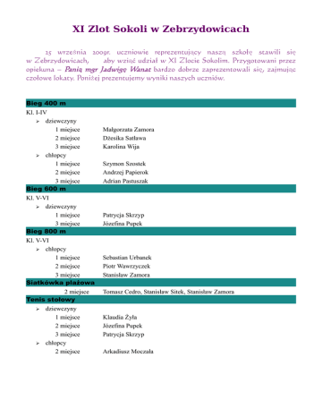 XI Zlot Sokoli w Zebrzydowicach 25 września 2009r. uczniowie reprezentujący naszą szkołę stawili się w Zebrzydowicach, aby wziąć udział w XI Zlocie Sokolim. Przygotowani przez opiekuna – Panią mgr Jadwigę Wanat bardzo dobrze zaprezentowali się, zajmując czołowe lokaty. Poniżej prezentujemy wyniki naszych uczniów. Bieg 400 m Kl. I-IV ➢ dziewczyny 1 miejsce 2 miejsce 3 miejsce ➢ chłopcy 1 miejsce 2 miejsce 3 miejsce Bieg 600 m Kl. V-VI ➢ dziewczyny 1 miejsce 3 miejsce Bieg 800 m Kl. V-VI ➢ chłopcy 1 miejsce 2 miejsce 3 miejsce Siatkówka plażowa 2 miejsce Tenis stołowy ➢ ➢ dziewczyny 1 miejsce 2 miejsce 3 miejsce chłopcy 2 miejsce Małgorzata Zamora Dżesika Satława Karolina Wija Szymon Szostek Andrzej Papierok Adrian Pastuszak Patrycja Skrzyp Józefina Pupek Sebastian Urbanek Piotr Wawrzyczek Stanisław Zamora Tomasz Cedro, Stanisław Sitek, Stanisław Zamora Klaudia Żyła Józefina Pupek Patrycja Skrzyp Arkadiusz Moczała