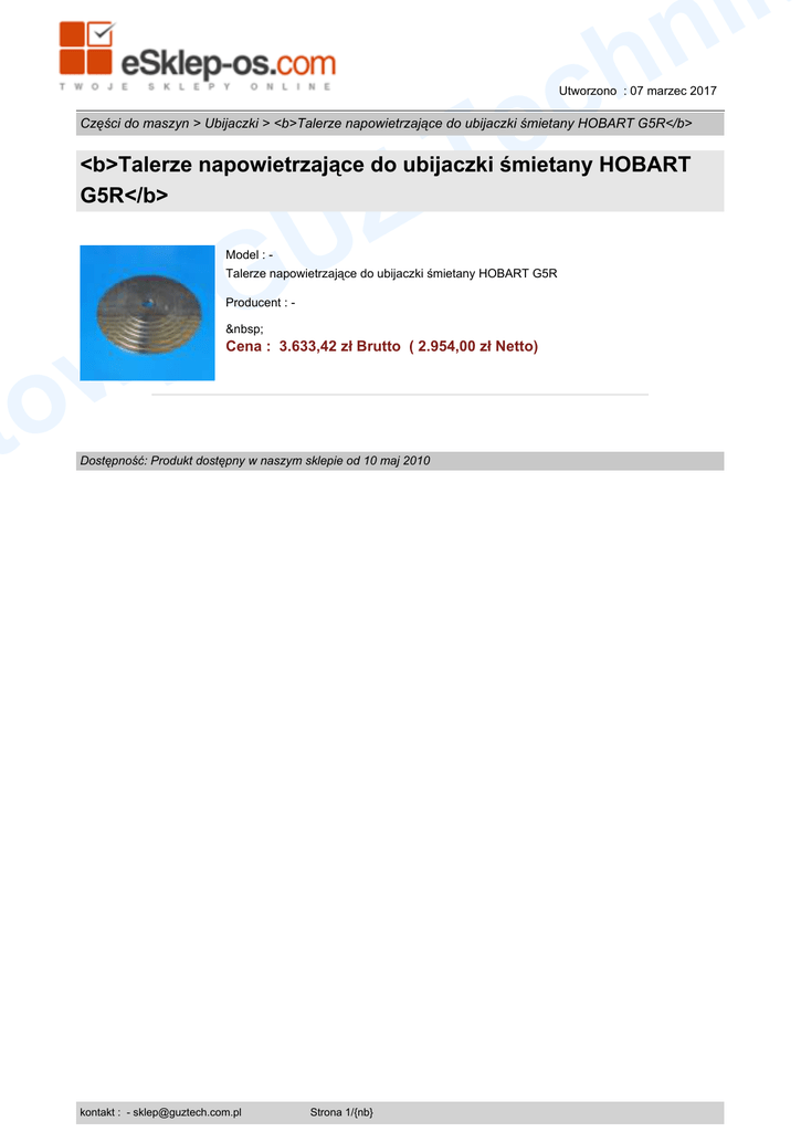 e T h c i n Utworzono : 07 marzec 2017 Części do maszyn > Ubijaczki > <b>Talerze napowietrzające do ubijaczki śmietany HOBART G5R</b> Z U G y <b>Talerze napowietrzające do ubijaczki śmietany HOBART G5R</b> Model : - Talerze napowietrzające do ubijaczki śmietany HOBART G5R Producent : - w o t Cena : 3.633,42 zł Brutto ( 2.954,00 zł Netto) Dostępność: Produkt dostępny w naszym sklepie od 10 maj 2010 kontakt : - [email protected] Strona 1/{nb}