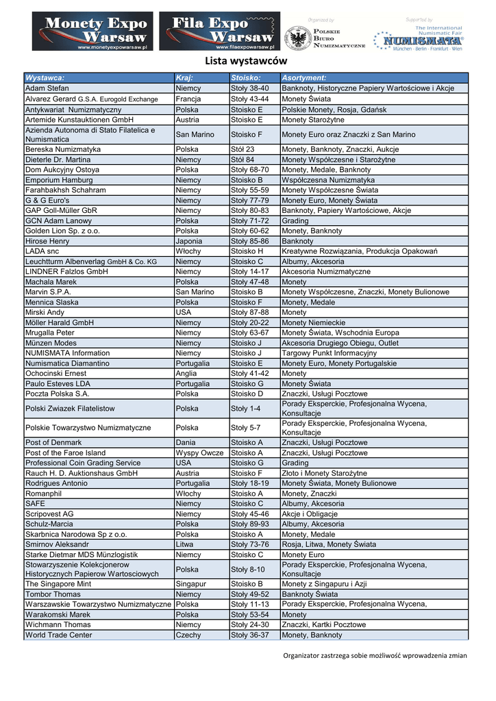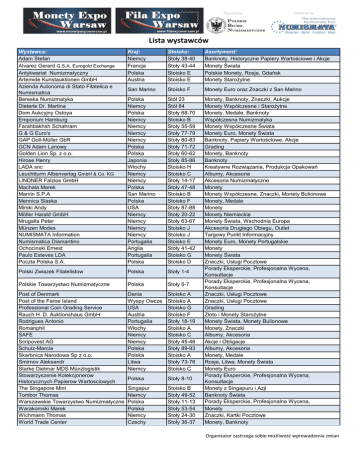 Lista wystawców Wystawca: Adam Stefan Alvarez Gerard G.S.A. Eurogold Exchange Antykwariat Numizmatyczny Artemide Kunstauktionen GmbH Azienda Autonoma di Stato Filatelica e Numismatica Bereska Numizmatyka Dieterle Dr. Martina Dom Aukcyjny Ostoya Emporium Hamburg Farahbakhsh Schahram G & G Euro's GAP Goll-Müller GbR GCN Adam Lanowy Golden Lion Sp. z o.o. Hirose Henry LADA snc Leuchtturm Albenverlag GmbH & Co. KG LINDNER Falzlos GmbH Machala Marek Marvin S.P.A. Mennica Slaska Mirski Andy Möller Harald GmbH Mrugalla Peter Münzen Modes NUMISMATA Information Numismatica Diamantino Ochocinski Ernest Paulo Esteves LDA Poczta Polska S.A. Kraj: Niemcy Francja Polska Austria Stoisko: Stoły 38-40 Stoły 43-44 Stoisko E Stoisko E Asortyment: Banknoty, Historyczne Papiery Wartościowe i Akcje Monety Świata Polskie Monety, Rosja, Gdańsk Monety Starożytne San Marino Stoisko F Monety Euro oraz Znaczki z San Marino Polska Niemcy Polska Niemcy Niemcy Niemcy Niemcy Polska Polska Japonia Włochy Niemcy Niemcy Polska San Marino Polska USA Niemcy Niemcy Niemcy Niemcy Portugalia Anglia Portugalia Polska Stół 23 Stół 84 Stoły 68-70 Stoisko B Stoły 55-59 Stoły 77-79 Stoły 80-83 Stoły 71-72 Stoły 60-62 Stoły 85-86 Stoisko H Stoisko C Stoły 14-17 Stoły 47-48 Stoisko B Stoisko F Stoły 87-88 Stoły 20-22 Stoły 63-67 Stoisko J Stoisko J Stoisko E Stoły 41-42 Stoisko G Stoisko D Polski Zwiazek Filatelistow Polska Stoły 1-4 Polskie Towarzystwo Numizmatyczne Polska Stoły 5-7 Post of Denmark Post of the Faroe Island Professional Coin Grading Service Rauch H. D. Auktionshaus GmbH Rodrigues Antonio Romanphil SAFE Scripovest AG Schulz-Marcia Skarbnica Narodowa Sp z o.o. Smirnov Aleksandr Starke Dietmar MDS Münzlogistik Stowarzyszenie Kolekcjonerow Historycznych Papierow Wartosciowych The Singapore Mint Tombor Thomas Warszawskie Towarzystwo Numizmatyczne Warakomski Marek Wichmann Thomas World Trade Center Dania Wyspy Owcze USA Austria Portugalia Włochy Niemcy Niemcy Polska Polska Litwa Niemcy Stoisko A Stoisko A Stoisko G Stoisko F Stoły 18-19 Stoisko A Stoisko C Stoły 45-46 Stoły 89-93 Stoisko A Stoły 73-76 Stoisko C Polska Stoły 8-10 Singapur Niemcy Polska Polska Niemcy Czechy Stoisko B Stoły 49-52 Stoły 11-13 Stoły 53-54 Stoły 24-30 Stoły 36-37 Monety, Banknoty, Znaczki, Aukcje Monety Współczesne i Starożytne Monety, Medale, Banknoty Współczesna Numizmatyka Monety Współczesne Świata Monety Euro, Monety Świata Banknoty, Papiery Wartościowe, Akcje Grading Monety, Banknoty Banknoty Kreatywne Rozwiązania, Produkcja Opakowań Albumy, Akcesoria Akcesoria Numizmatyczne Monety Monety Współczesne, Znaczki, Monety Bulionowe Monety, Medale Monety Monety Niemieckie Monety Świata, Wschodnia Europa Akcesoria Drugiego Obiegu, Outlet Targowy Punkt Informacyjny Monety Euro, Monety Portugalskie Monety Monety Świata Znaczki, Usługi Pocztowe Porady Eksperckie, Profesjonalna Wycena, Konsultacje Porady Eksperckie, Profesjonalna Wycena, Konsultacje Znaczki, Usługi Pocztowe Znaczki, Usługi Pocztowe Grading Złoto i Monety Starożytne Monety Świata, Monety Bulionowe Monety, Znaczki Albumy, Akcesoria Akcje i Obligacje Albumy, Akcesoria Monety, Medale Rosja, Litwa, Monety Świata Monety Euro Porady Eksperckie, Profesjonalna Wycena, Konsultacje Monety z Singapuru i Azji Banknoty Świata Porady Eksperckie, Profesjonalna Wycena, Monety Znaczki, Kartki Pocztowe Monety, Banknoty Organizator zastrzega sobie możliwość wprowadzenia zmian