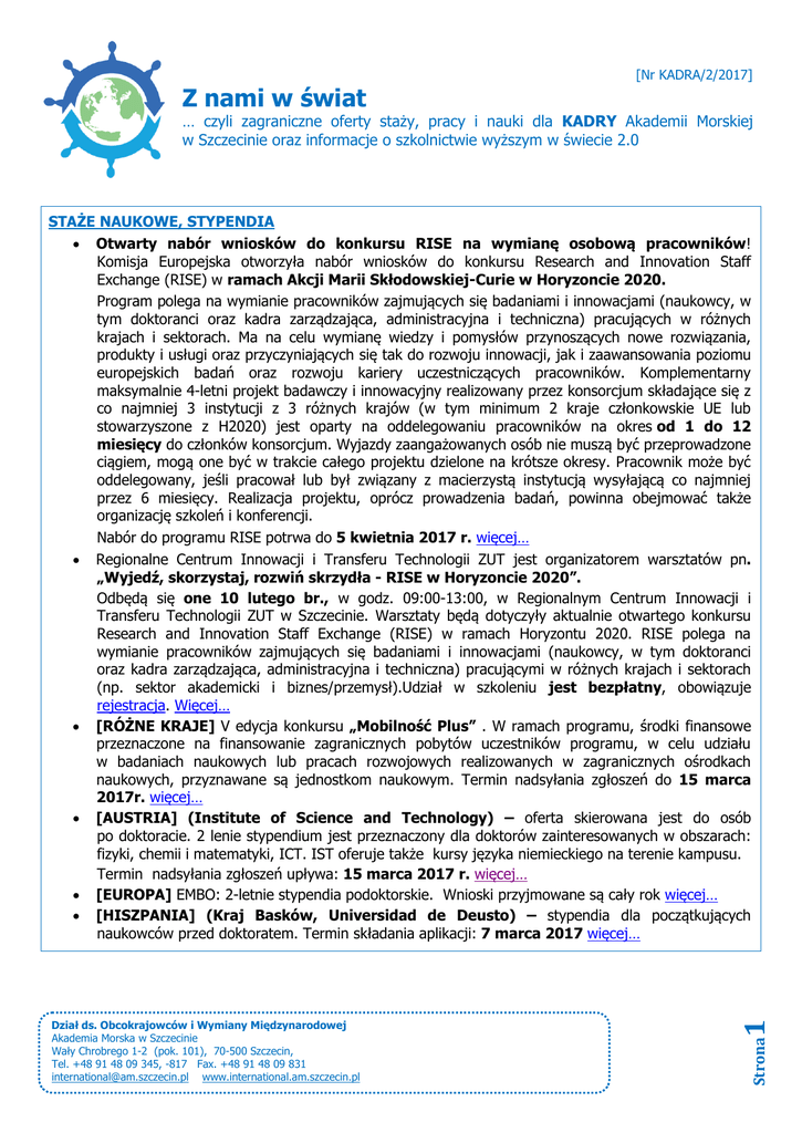 Z nami w świat [Nr KADRA/2/2017] … czyli zagraniczne oferty staży, pracy i nauki dla KADRY Akademii Morskiej w Szczecinie oraz informacje o szkolnictwie wyższym w świecie 2.0 Strona Dział ds. Obcokrajowców i Wymiany Międzynarodowej Akademia Morska w Szczecinie Wały Chrobrego 1-2 (pok. 101), 70-500 Szczecin, Tel. +48 91 48 09 345, -817 Fax. +48 91 48 09 831 [email protected] www.international.am.szczecin.pl 1 STAŻE NAUKOWE, STYPENDIA Otwarty nabór wniosków do konkursu RISE na wymianę osobową pracowników! Komisja Europejska otworzyła nabór wniosków do konkursu Research and Innovation Staff Exchange (RISE) w ramach Akcji Marii Skłodowskiej-Curie w Horyzoncie 2020. Program polega na wymianie pracowników zajmujących się badaniami i innowacjami (naukowcy, w tym doktoranci oraz kadra zarządzająca, administracyjna i techniczna) pracujących w różnych krajach i sektorach. Ma na celu wymianę wiedzy i pomysłów przynoszących nowe rozwiązania, produkty i usługi oraz przyczyniających się tak do rozwoju innowacji, jak i zaawansowania poziomu europejskich badań oraz rozwoju kariery uczestniczących pracowników. Komplementarny maksymalnie 4-letni projekt badawczy i innowacyjny realizowany przez konsorcjum składające się z co najmniej 3 instytucji z 3 różnych krajów (w tym minimum 2 kraje członkowskie UE lub stowarzyszone z H2020) jest oparty na oddelegowaniu pracowników na okres od 1 do 12 miesięcy do członków konsorcjum. Wyjazdy zaangażowanych osób nie muszą być przeprowadzone ciągiem, mogą one być w trakcie całego projektu dzielone na krótsze okresy. Pracownik może być oddelegowany, jeśli pracował lub był związany z macierzystą instytucją wysyłającą co najmniej przez 6 miesięcy. Realizacja projektu, oprócz prowadzenia badań, powinna obejmować także organizację szkoleń i konferencji. Nabór do programu RISE potrwa do 5 kwietnia 2017 r. więcej… Regionalne Centrum Innowacji i Transferu Technologii ZUT jest organizatorem warsztatów pn. „Wyjedź, skorzystaj, rozwiń skrzydła - RISE w Horyzoncie 2020”. Odbędą się one 10 lutego br., w godz. 09:00-13:00, w Regionalnym Centrum Innowacji i Transferu Technologii ZUT w Szczecinie. Warsztaty będą dotyczyły aktualnie otwartego konkursu Research and Innovation Staff Exchange (RISE) w ramach Horyzontu 2020. RISE polega na wymianie pracowników zajmujących się badaniami i innowacjami (naukowcy, w tym doktoranci oraz kadra zarządzająca, administracyjna i techniczna) pracującymi w różnych krajach i sektorach (np. sektor akademicki i biznes/przemysł).Udział w szkoleniu jest bezpłatny, obowiązuje rejestracja. Więcej… [RÓŻNE KRAJE] V edycja konkursu „Mobilność Plus” . W ramach programu, środki finansowe przeznaczone na finansowanie zagranicznych pobytów uczestników programu, w celu udziału w badaniach naukowych lub pracach rozwojowych realizowanych w zagranicznych ośrodkach naukowych, przyznawane są jednostkom naukowym. Termin nadsyłania zgłoszeń do 15 marca 2017r. więcej… [AUSTRIA] (Institute of Science and Technology) – oferta skierowana jest do osób po doktoracie. 2 lenie stypendium jest przeznaczony dla doktorów zainteresowanych w obszarach: fizyki, chemii i matematyki, ICT. IST oferuje także kursy języka niemieckiego na terenie kampusu. Termin nadsyłania zgłoszeń upływa: 15 marca 2017 r. więcej… [EUROPA] EMBO: 2-letnie stypendia podoktorskie. Wnioski przyjmowane są cały rok więcej… [HISZPANIA] (Kraj Basków, Universidad de Deusto) – stypendia dla początkujących naukowców przed doktoratem. Termin składania aplikacji: 7 marca 2017 więcej… KONKURSY, SEMINARIA, SZKOLENIA, KONFERENCJE Oferty pracy i stypendiów baza EURAXESS. Na stronie EURAXESS znajdziecie Państwo tysiące ogłoszeń pracy, współpracy z różnymi europejskimi instytucjami naukowymi, zarówno uniwersytetami, instytutami, jak i prywatnymi firmami. Baza prowadzona jest w j. angielskim. Dostęp do bazy znajduje się TUTAJ. Erasmus+ Week - Latvian Maritime Academy zaprasza na warsztaty w ramach Erasmus+ WEEK, które obędą się w Rydze w dniach 18 – 22.04.2017r. Zgłoszenia należy przesyłać na adres e-mailowy: [email protected] . Termin składnia aplikacji upływa 1 marca 2017r. Latvian Maritime Academy zaprasza na the 19th International Conference on Maritime Transport & Infrastructure, której tematem przewodnim będzie Vessel traffic today and tomorrow. Konferencja odbędzie się w Rydze w 20-21.04.2017 r. więcej... Nabór projektów Erasmus+ Sojusze na rzecz wiedzy - Sojusze na rzecz wiedzy to międzynarodowe projekty współpracy szkół wyższych i przedsiębiorstw, których celem jest wspieranie innowacyjności w sferze edukacji i biznesu oraz szerszym otoczeniu społecznoekonomicznym, rozwijanie w społeczeństwie umiejętności związanych z przedsiębiorczością, stymulowanie i ułatwianie przepływu wiedzy między uczelniami i przedsiębiorstwami. Termin składania wniosków: 28 lutego 2017 r., do godz. 12.00 więcej… International Summer Workshop on IT Education & Research 2017 - University of Applied Sciences Upper Austria w Hagenbergu zaprasza nauczycieli akademickich z zakresu IT na 3. Międzynarodowe warsztaty dotyczące IT Education & Research, które odbędą się w dniach 8-10 czerwca 2017r. Warsztaty będą koncentrować się na umiejętnościach w zakresie przedsiębiorczości, które powinni nabyć studenci i absolwenci studiów z zakresu IT planujący założyć własne firmy. Udział w międzynarodowych warsztatach jest bezpłatny. Termin aplikowania: 12 May 2017. więcej… Konferencja E-learning Fusion - o nauczaniu i uczeniu się w świecie 3.0. „to jedyna na polskim rynku konferencja gdzie można zaczerpnąć inspiracji od zagranicznych ekspertów”. Konferencja przybliży najnowsze trendy w e-learningu, mobile learningu, social learningu, gamifikacji oraz światowych standardach w budowaniu nowoczesnego środowiska pra
